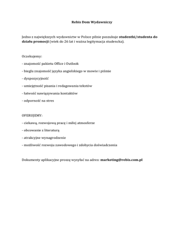 Rebis Dom Wydawniczy Jedno z największych wydawnictw w Polsce pilnie poszukuje studentki/studenta do działu promocji (wiek do 26 lat i ważna legitymacja studencka). Oczekujemy: - znajomość pakietu Office i Outlook - biegła znajomość języka angielskiego w mowie i piśmie - dyspozycyjność - umiejętność pisania i redagowania tekstów - łatwość nawiązywania kontaktów - odporność na stres OFERUJEMY: - ciekawą, rozwojową pracę i miłej atmosferze - obcowanie z literaturą - atrakcyjne wynagrodzenie - możliwość rozwoju zawodowego i zdobycia doświadczenia Dokumenty aplikacyjne proszę wysyłać na adres: [email protected]