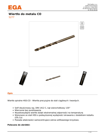 EGA Spółka z o.o. Spółka Komandytowa ul. Rzeczna 1, Nowa Wieś 83-200 Starogard Gdański tel. 58 56 300 80 Wiertło do metalu CO 5277 Opis Wiertło spiralne HSS-CO - Wiertła precyzyjne do stali ciągliwych i twardych. Szlif dwuścinowy wg. DIN 1412 C, kąt wierzchołkowy 135° Wiercenie bez punktowania Wysokowydajne wiertło dzięki ekstremalnej odporności na temperaturę Wykonane ze stali HSS o podwyższonej wydajności skrawania z dodatkiem kobaltu (5% Co) Posiada właściwości samocentrujace ostrza szlifowanego krzyżowo. Polecane do obróbki: 1/2 EGA Spółka z o.o. Spółka Komandytowa ul. Rzeczna 1, Nowa Wieś 83-200 Starogard Gdański tel. 58 56 300 80 stali stopowych i węglowych o wytrzymałości na rozciąganie 1000 N/mm², stali nierdzewnej V2A/V4A, żeliwa szarego, stali kwasoodpornych i żarowytrzymałych. Warianty Lp. Nr katalogowy 1 EAN Rozmiar (mm) Ilość 5277 1,0 3 2 5278 1,5 3 3 5279 2,0 2 4 5280 2,5 2 5 5281 3,0 2 6 5282 3,2 1 7 5283 3,5 1 8 5284 4,0 1 9 5285 4,2 1 10 5286 4,5 1 11 5287 5,0 1 12 5288 5,2 1 13 5289 5,5 1 14 5290 6,0 1 15 5291 6,5 1 16 5292 7,0 1 17 5293 7,5 1 18 5294 8,0 1 19 5295 8,5 1 20 5296 9,0 1 21 5297 9,5 1 22 5298 10,0 1 23 5299 10,5 1 24 5300 11,0 1 25 5301 11,5 1 26 5302 12,0 1 27 5303 12,5 1 28 5304 13,0 1 2/2 Powered by TCPDF (www.tcpdf.org)