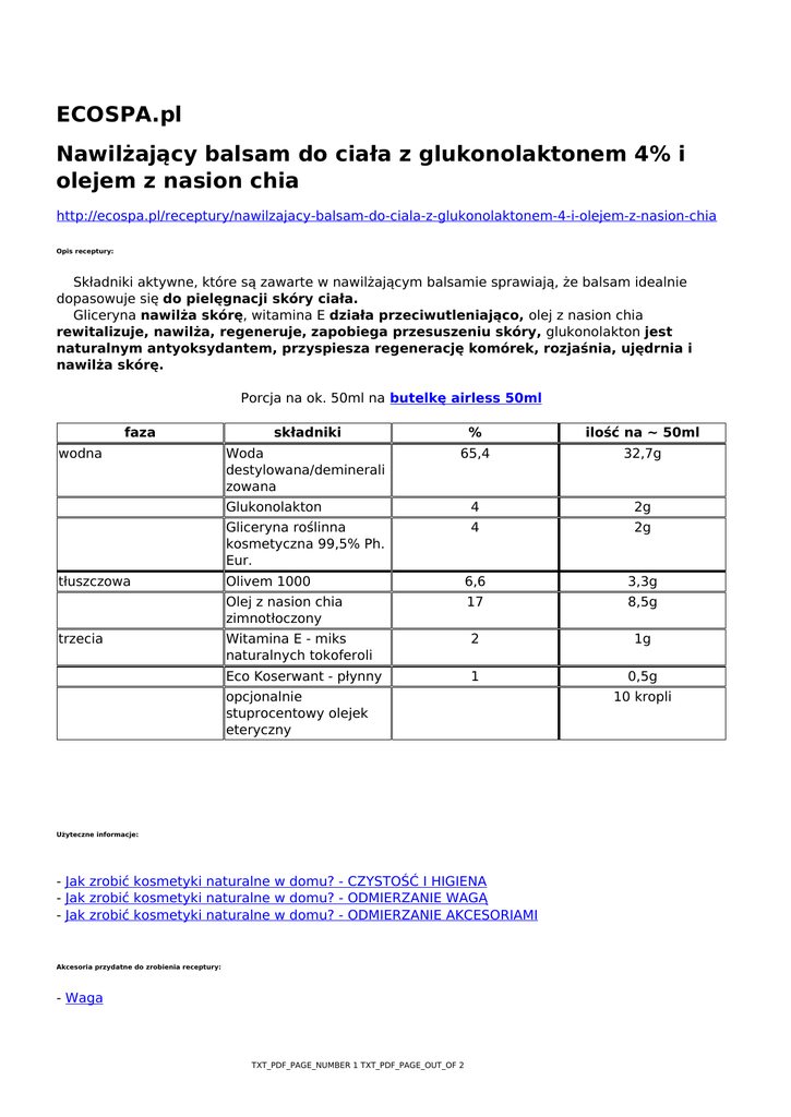 ECOSPA.pl Nawilżający balsam do ciała z glukonolaktonem 4% i olejem z nasion chia http://ecospa.pl/receptury/nawilzajacy-balsam-do-ciala-z-glukonolaktonem-4-i-olejem-z-nasion-chia Opis receptury: Składniki aktywne, które są zawarte w nawilżającym balsamie sprawiają, że balsam idealnie dopasowuje się do pielęgnacji skóry ciała. Gliceryna nawilża skórę, witamina E działa przeciwutleniająco, olej z nasion chia rewitalizuje, nawilża, regeneruje, zapobiega przesuszeniu skóry, glukonolakton jest naturalnym antyoksydantem, przyspiesza regenerację komórek, rozjaśnia, ujędrnia i nawilża skórę. Porcja na ok. 50ml na butelkę airless 50ml faza składniki % ilość na ~ 50ml wodna Woda destylowana/deminerali zowana 65,4 32,7g Glukonolakton 4 2g Gliceryna roślinna kosmetyczna 99,5% Ph. Eur. 4 2g tłuszczowa Olivem 1000 6,6 3,3g Olej z nasion chia zimnotłoczony 17 8,5g trzecia Witamina E - miks naturalnych tokoferoli 2 1g Eco Koserwant - płynny 1 0,5g opcjonalnie stuprocentowy olejek eteryczny 10 kropli Użyteczne informacje: - Jak zrobić kosmetyki naturalne w domu? - CZYSTOŚĆ I HIGIENA - Jak zrobić kosmetyki naturalne w domu? - ODMIERZANIE WAGĄ - Jak zrobić kosmetyki naturalne w domu? - ODMIERZANIE AKCESORIAMI Akcesoria przydatne do zrobienia receptury: - Waga TXT_PDF_PAGE_NUMBER 1 TXT_PDF_PAGE_OUT_OF 2 - Zlewka skalowana 50ml - Zlewka skalowana 100ml - Termometr elektroniczny z sondą - Bagietka - Łyżka miarowa 0,1/2,5ml Sposób przygotowania w łaźni/kąpieli wodnej: (1) W zlewce 50ml odważ Olivem i olej. (2) W zlewce 100ml odważ glicerynę, dodaj wodę, wymieszaj. (3) Przygotuj kąpiel wodną na palniku. Woda w kąpieli musi być gorąca, prawie wrząca. (4) Do kąpieli wodnej wstaw zlewki i podgrzewaj obie do podobnej temperatury ok. 80 st. C. Temperaturę kontroluj termometrem. (5) Gdy temperatura osiągnie ok. 80 st. C do części wodnej dodaj glukonolkton, wymieszaj. (6) Część z olejem zacznij powoli wlewać do wody jednocześnie mieszając. (7) Wyjmij zlewkę z połączonymi składnikami z kąpieli. Mieszaj przez kilka, kilkanaście minut aż emulsja zagęści się i ostygnie poniżej 35 st. C. (8) Kiedy emulsja ostygnie do 35 st. C dodaj do zlewki witaminę E, dokładnie wymieszaj. (9) Dodaj olejki eteryczne, wymieszaj. (10) Dodaj konserwant, wymieszaj. (11) Balsam przelej do opakowania i odstaw na kilka godzin do całkowitego ostygnięcia. Przechowywanie stosowanie termin przydatności bez konserwantu w lodówce, z konserwantem w szafce rano i (lub) wieczorem po kąpieli *bez koserwantu 2 tygodnie, z konserwantem 3 m-ce TXT_PDF_PAGE_NUMBER 2 TXT_PDF_PAGE_OUT_OF 2