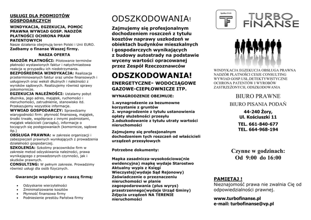 USŁUGI DLA PODMIOTÓW GOSPODARCZYCH ODSZKODOWANIA! WINDYKACJA, EGZEKUCJA, POMOC PRAWNA WYWIAD GOSP. NADZÓR PŁATNOŚCI OCHRONA PRAW PATENTOWYCH Zajmujemy się profesjonalnym dochodzeniem roszczeń z tytułu kosztów naprawy uszkodzeń w obiektach budynków mieszkalnych i gospodarczych wynikających z budowy autostrady na podstawie wyceny wartości opracowanej przez Zespół Rzeczoznawców Nasze działania obejmują teren Polski i Unii EURO. Zadbamy o finanse Waszej firmy. NASZA OFERTA NADZÓR PŁATNOŚCI: Pilotowanie terminów płatności wystawionych faktur i natychmiastowa reakcja w przypadku ich niedotrzymania. BEZPOŚREDNIA WINDYKACJA: Realizacja przeterminowanych faktur oraz umów finansowych i usługowych oraz weksli dłużnych i należności z wyroków sądowych. Realizujemy również sprawy pokomornicze. EGZEKUCJA NALEŻNOŚCI: Ustalamy pobyt dłużnika, jego adres, majątek, ruchomości i nieruchomości, zatrudnienie, stanowisko itd. Przekazujemy wszystkie informacje. WYWIAD GOSPODARCZY: Sprawdzamy wiarygodności firm: płynność finansową, majątek, środki trwałe, współprace z innymi podmiotami, majątek właścicieli (zarządu), informacje o toczących się postępowaniach (komornicze, sądowe itp.) OBSŁUGA PRAWNA: w zakresie organizacji i zabezpieczeń prawnych wynikających z prowadzenia działalności gospodarczej. SZKOLENIA: Szkolimy pracowników firm w zakresie metod odzyskiwania należności, prawa wynikającego z prowadzonych czynności, jak i skutków prawnych. CONSULTING: W pełnym zakresie. Prowadzimy również usługi dla osób fizycznych. Gwarancje współpracy z naszą firmą: Odzyskanie wierzytelności Zminimalizowanie kosztów Płynność finansowa firmy Podniesienie prestiżu Państwa firmy ODSZKODOWANIA! ENERGETYCZNE- WODOCIĄGOWE GAZOWE-CIEPŁOWNICZE ITP. WYNAGRODZENIE OBEJMUJE: 1.wynagrodzenie za bezumowne korzystanie z gruntów 2. wynagrodzenie z tytułu ustanowienia opłaty służebności przesyłu 3.odszkodowanie z tytułu utraty wartości nieruchomości Zajmujemy się profesjonalnym dochodzeniem tych roszczeń od właścicieli urządzeń przesyłowych Potrzebne dokumenty: Mapka zasadnicza-wysokościowa(nie ewidencyjna) mapkę wydaje Starostwo Aktualny wypis z Księgi Wieczystej(wydaje Sąd Rejonowy) Zaświadczenie o przeznaczeniu nieruchomości w planie zagospodarowania (plus wyrys) przestrzennego(wydaje Urząd Gminy) Zdjęcia urządzeń NA TERENIE nieruchomości Spółka Z O.O. WINDYKACJA EGZEKUCJA OBSŁUGA PRAWNA NADZÓR PŁATNOŚCI CESJE CONSULTING WYWIAD GOSP.USŁ.DETEKTYWISTYCZNE OCHRONA PATENTÓW I WYROBÓW ZASTRZEŻONYCH, ODSZKODOWANIA BIURO PRAWNE BIURO PISANIA PODAŃ 44-240 Żory, Ul. Kościuszki 11 TEL. 661-840-677 TEL. 664-968-194 Czynne w godzinach: Od 9:00 do 16:00 PAMIĘTAJ ! Nieznajomość prawa nie zwalnia Cię od odpowiedzialności prawnej. www.turbofinanse.pl e-mail: [email protected] PRZYJDŹ DO NAS POMOŻEMY Pracowałeś na czarno ? Pracodawca nie wypłacił Ci wynagrodzenia ? Pożyczyłeś swoje pieniądze ? Nie oddano Ci ich ? Poręczyłeś kredyt a nie został spłacony i musisz go sam spłacać ? Wynajmujesz lokal i Ci za niego nie płacą ? Zgłoś się do nas, odzyskamy Twoje pieniądze i dokumenty Masz problemy w instytucjach? Banki Spółdzielnie Mieszkaniowe ZUS Urząd Skarbowy Urząd Celny Zakład Pracy Zapraszamy do naszego biura, my wiemy jak pomóc. My to naprawdę robimy ! Usługi w zakresie: Pisanie podań, wniosków, oświadczeń i innej korespondencji Sporządzanie umów. Zanim podpiszesz umowę – przyjdź do nas, my ją sprawdzimy. Skargi, wnioski, pozwy sądowe. Masz problemy z nieuczciwymi firmami – osobami ? Wykonano Tobie usługę? - remont mieszkania, domu - wymiana okien, drzwi itp. Wykonano źle i nie uwzględniono reklamacji ? Podania i odwołania w sprawach administracyjnych i majątkowych. Pobrano zaliczkę na materiały ? Nie wykonano usługi ? Sprawy rozwodowe, alimentacyjne, podziały majątku, spadkowe, cywilne, karne, gospodarcze, komornicze, skarbowe, bankowe, zusowskie, administracyjne i inne. Przyjdź do nas – odzyskasz swoje pieniądze ! Odwołania i pozwy w sprawach prawnych. Wnioski, podania, odwołania. Oferujemy zajęcie się sprawami dotyczącymi spółdzielni mieszkaniowych (eksmisja, wymówienie członkostwa itp.) Negocjacje w sprawach zadłużeń mieszkaniowych, bankowych, skarbowych i innych wynikłych z braku możliwości finansowych (utrata pracy, choroba i inne problemy). Prowadzimy negocjacje polubowne z uwzględnieniem możliwości finansowych dłużnika (możliwość spłaty zadłużenia w dłuższym terminie przy racie spłaty na którą stać zadłużonego, bez konsekwencji prawnych i dodatkowych kosztów Inne usługi sekretaryjno – biurowe Umowa kupna sprzedaży, wynajmu, dzierżawy. Wnioski i skargi w sprawach umów kredytowych. Odzyskujemy należności z wyroków sądowych, umów zleceń, dzierżawy, pożyczek koleżeńskich, wynajmu lokali itp. Ustalamy adresy osób nie przebywających w miejscach zamieszkania (również w Unii Europejskiej). Przychodzi do Ciebie korespondencja o niezapłaconych ratach ? Provident, Kruk, Secapital itp. Przyjdź do nas, my Ci pomożemy, może nie będziesz musiał płacić ! Zapraszamy do naszego biura, my wiem jak skutecznie pomóc.