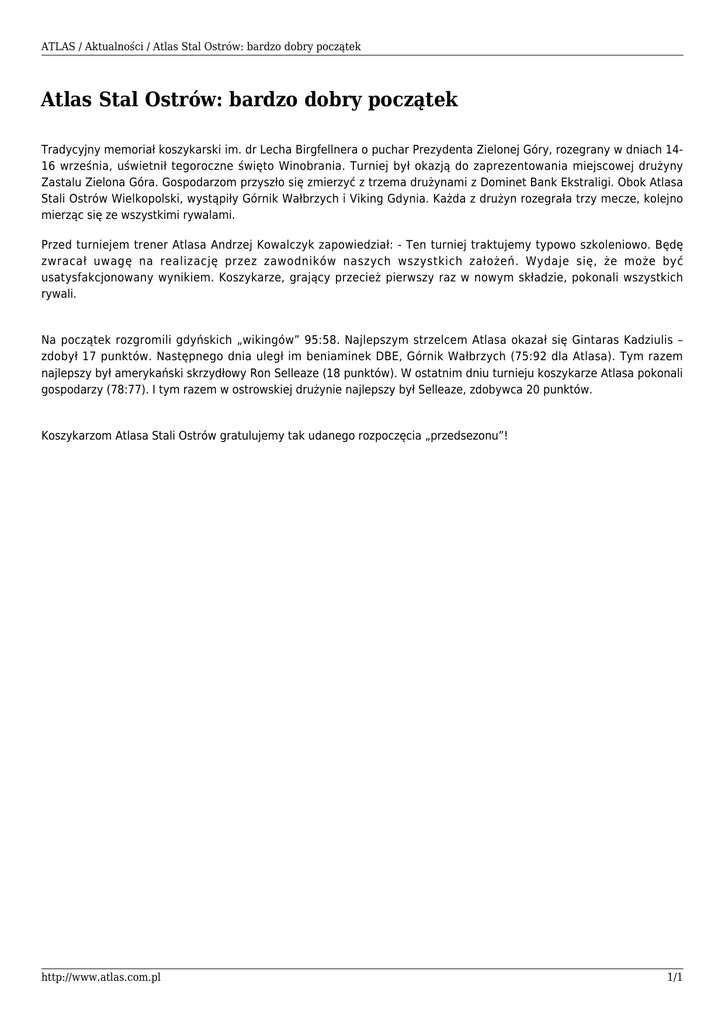 ATLAS / Aktualności / Atlas Stal Ostrów: bardzo dobry początek Atlas Stal Ostrów: bardzo dobry początek Tradycyjny memoriał koszykarski im. dr Lecha Birgfellnera o puchar Prezydenta Zielonej Góry, rozegrany w dniach 1416 września, uświetnił tegoroczne święto Winobrania. Turniej był okazją do zaprezentowania miejscowej drużyny Zastalu Zielona Góra. Gospodarzom przyszło się zmierzyć z trzema drużynami z Dominet Bank Ekstraligi. Obok Atlasa Stali Ostrów Wielkopolski, wystąpiły Górnik Wałbrzych i Viking Gdynia. Każda z drużyn rozegrała trzy mecze, kolejno mierząc się ze wszystkimi rywalami. Przed turniejem trener Atlasa Andrzej Kowalczyk zapowiedział: - Ten turniej traktujemy typowo szkoleniowo. Będę zwracał uwagę na realizację przez zawodników naszych wszystkich założeń. Wydaje się, że może być usatysfakcjonowany wynikiem. Koszykarze, grający przecież pierwszy raz w nowym składzie, pokonali wszystkich rywali. Na początek rozgromili gdyńskich „wikingów” 95:58. Najlepszym strzelcem Atlasa okazał się Gintaras Kadziulis – zdobył 17 punktów. Następnego dnia uległ im beniaminek DBE, Górnik Wałbrzych (75:92 dla Atlasa). Tym razem najlepszy był amerykański skrzydłowy Ron Selleaze (18 punktów). W ostatnim dniu turnieju koszykarze Atlasa pokonali gospodarzy (78:77). I tym razem w ostrowskiej drużynie najlepszy był Selleaze, zdobywca 20 punktów. Koszykarzom Atlasa Stali Ostrów gratulujemy tak udanego rozpoczęcia „przedsezonu”! http://www.atlas.com.pl 1/1