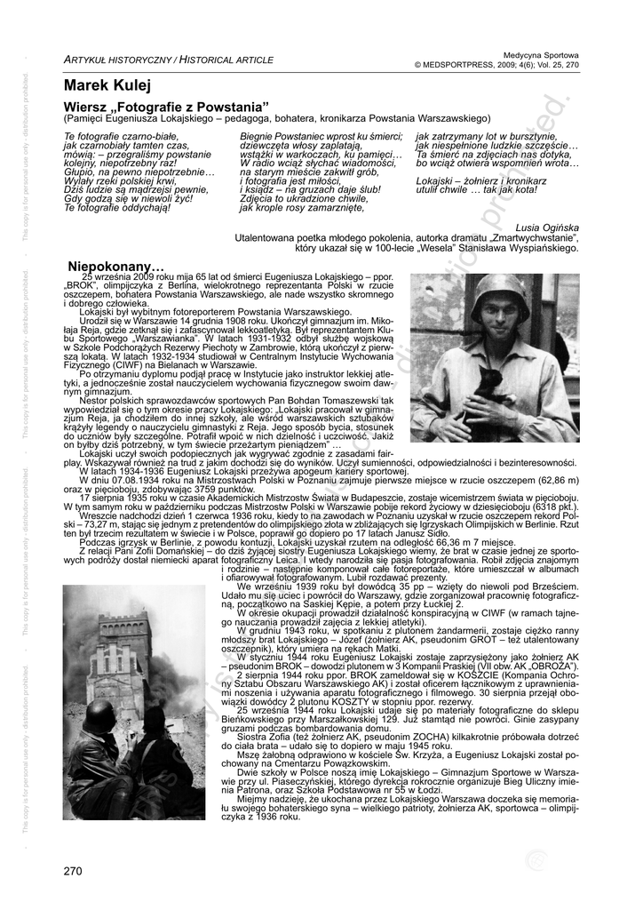 Wiersz „Fotografie z Powstania” (Pamięci Eugeniusza Lokajskiego – pedagoga, bohatera, kronikarza Powstania Warszawskiego) Biegnie Powstaniec wprost ku śmierci; dziewczęta włosy zaplatają, wstążki w warkoczach, ku pamięci… W radio wciąż słychać wiadomości, na starym mieście zakwitł grób, i fotografia jest miłości, i ksiądz – na gruzach daje ślub! Zdjęcia to ukradzione chwile, jak krople rosy zamarznięte, - Niepokonany… is c op y is for pe rso na lu se on ly - dis tr ibu 25 września 2009 roku mija 65 lat od śmierci Eugeniusza Lokajskiego – ppor. „BROK”, olimpijczyka z Berlina, wielokrotnego reprezentanta Polski w rzucie oszczepem, bohatera Powstania Warszawskiego, ale nade wszystko skromnego i dobrego człowieka. Lokajski był wybitnym fotoreporterem Powstania Warszawskiego. Urodził się w Warszawie 14 grudnia 1908 roku. Ukończył gimnazjum im. Mikołaja Reja, gdzie zetknął się i zafascynował lekkoatletyką. Był reprezentantem Klubu Sportowego „Warszawianka”. W latach 1931-1932 odbył służbę wojskową w Szkole Podchorążych Rezerwy Piechoty w Zambrowie, którą ukończył z pierwszą lokatą. W latach 1932-1934 studiował w Centralnym Instytucie Wychowania Fizycznego (CIWF) na Bielanach w Warszawie. Po otrzymaniu dyplomu podjął pracę w Instytucie jako instruktor lekkiej atletyki, a jednocześnie został nauczycielem wychowania fizycznegow swoim dawnym gimnazjum. Nestor polskich sprawozdawców sportowych Pan Bohdan Tomaszewski tak wypowiedział się o tym okresie pracy Lokajskiego: „Lokajski pracował w gimnazjum Reja, ja chodziłem do innej szkoły, ale wśród warszawskich sztubaków krążyły legendy o nauczycielu gimnastyki z Reja. Jego sposób bycia, stosunek do uczniów były szczególne. Potrafił wpoić w nich dzielność i uczciwość. Jakiż on byłby dziś potrzebny, w tym świecie przeżartym pieniądzem” … Lokajski uczył swoich podopiecznych jak wygrywać zgodnie z zasadami fairplay. Wskazywał również na trud z jakim dochodzi się do wyników. Uczył sumienności, odpowiedzialności i bezinteresowności. W latach 1934-1936 Eugeniusz Lokajski przeżywa apogeum kariery sportowej. W dniu 07.08.1934 roku na Mistrzostwach Polski w Poznaniu zajmuje pierwsze miejsce w rzucie oszczepem (62,86 m) oraz w pięcioboju, zdobywając 3759 punktów. 17 sierpnia 1935 roku w czasie Akademickich Mistrzostw Świata w Budapeszcie, zostaje wicemistrzem świata w pięcioboju. W tym samym roku w październiku podczas Mistrzostw Polski w Warszawie pobije rekord życiowy w dziesięcioboju (6318 pkt.). Wreszcie nadchodzi dzień 1 czerwca 1936 roku, kiedy to na zawodach w Poznaniu uzyskał w rzucie oszczepem rekord Polski – 73,27 m, stając się jednym z pretendentów do olimpijskiego złota w zbliżających się Igrzyskach Olimpijskich w Berlinie. Rzut ten był trzecim rezultatem w świecie i w Polsce, poprawił go dopiero po 17 latach Janusz Sidło. Podczas igrzysk w Berlinie, z powodu kontuzji, Lokajski uzyskał rzutem na odległość 66,36 m 7 miejsce. Z relacji Pani Zofii Domańskiej – do dziś żyjącej siostry Eugeniusza Lokajskiego wiemy, że brat w czasie jednej ze sportowych podróży dostał niemiecki aparat fotograficzny Leica. I wtedy narodziła się pasja fotografowania. Robił zdjęcia znajomym i rodzinie – następnie komponował całe fotoreportaże, które umieszczał w albumach i ofiarowywał fotografowanym. Lubił rozdawać prezenty. We wrześniu 1939 roku był dowódcą 35 pp – wzięty do niewoli pod Brześciem. Udało mu się uciec i powrócił do Warszawy, gdzie zorganizował pracownię fotograficzną, początkowo na Saskiej Kępie, a potem przy Łuckiej 2. W okresie okupacji prowadził działalność konspiracyjną w CIWF (w ramach tajnego nauczania prowadził zajęcia z lekkiej atletyki). W grudniu 1943 roku, w spotkaniu z plutonem żandarmerii, zostaje ciężko ranny młodszy brat Lokajskiego – Józef (żołnierz AK, pseudonim GROT – też utalentowany oszczepnik), który umiera na rękach Matki. W styczniu 1944 roku Eugeniusz Lokajski zostaje zaprzysiężony jako żołnierz AK – pseudonim BROK – dowodzi plutonem w 3 Kompanii Praskiej (VII obw. AK „OBROŻA”). 2 sierpnia 1944 roku ppor. BROK zameldował się w KOSZCIE (Kompania Ochrony Sztabu Obszaru Warszawskiego AK) i został oficerem łącznikowym z uprawnieniami noszenia i używania aparatu fotograficznego i filmowego. 30 sierpnia przejął obowiązki dowódcy 2 plutonu KOSZTY w stopniu ppor. rezerwy. 25 września 1944 roku Lokajski udaje się po materiały fotograficzne do sklepu Bieńkowskiego przy Marszałkowskiej 129. Już stamtąd nie powróci. Ginie zasypany gruzami podczas bombardowania domu. Siostra Zofia (też żołnierz AK, pseudonim ZOCHA) kilkakrotnie próbowała dotrzeć do ciała brata – udało się to dopiero w maju 1945 roku. Mszę żałobną odprawiono w kościele Św. Krzyża, a Eugeniusz Lokajski został pochowany na Cmentarzu Powązkowskim. Dwie szkoły w Polsce noszą imię Lokajskiego – Gimnazjum Sportowe w Warszawie przy ul. Piaseczyńskiej, którego dyrekcja rokrocznie organizuje Bieg Uliczny imienia Patrona, oraz Szkoła Podstawowa nr 55 w Łodzi. Miejmy nadzieję, że ukochana przez Lokajskiego Warszawa doczeka się memoriału swojego bohaterskiego syna – wielkiego patrioty, żołnierza AK, sportowca – olimpijczyka z 1936 roku. Th This copy is for personal use only - distribution prohibited. This copy is for personal use only - distribution prohibited. - Lokajski – żołnierz i kronikarz utulił chwile … tak jak kota! Lusia Ogińska Utalentowana poetka młodego pokolenia, autorka dramatu „Zmartwychwstanie”, który ukazał się w 100-lecie „Wesela” Stanisława Wyspiańskiego. - This copy is for personal use only - distribution prohibited. jak zatrzymany lot w bursztynie, jak niespełnione ludzkie szczęście… Ta śmierć na zdjęciach nas dotyka, bo wciąż otwiera wspomnień wrota… tio np r