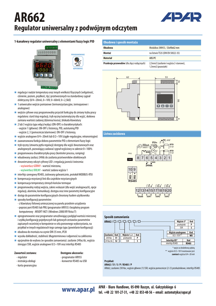 AR662 Regulator uniwersalny z podwójnym odczytem 1-kanałowy regulator uniwersalny z elementami fuzzy logic PID PROGRAMOWANIE AR955 Obudowa i sposób montażu Obudowa Modulbox 3MH53, 53x90x62 mm Montaż na listwie TS35 (DIN EN 50022-35) Materiał ABS/PC Przekroje przewodów (dla złącz rozłącznych) 2,5mm2 (zasilanie i wyjścia 2-stanowe), 1,5mm2 (pozostałe) KOPIOWANIE 53 10 62 www.apar.pl 9 SET Listwa zaciskowa + Dostępne akcesoria: - programator AR955 - konwerter RS485 na USB F I/Uin I/Uout mA + _ mA/V + Zawartość zestawu: - regulator - instrukcja obsługi - karta gwarancyjna 1 2 3 PRG _ +TC, mV RTD (2-p) zwora _ BIN _ RTD (3-p) +V 8 7 6 5 4 3 2 1 + _ GND 24Vdc RS + 10 9 RS - ciśnienie, poziom, prędkość, itp.) przetworzonych na standardowy sygnał elektryczny (0/4÷20mA, 0÷10V, 0÷60mV, 0÷2,5kΩ) 1 uniwersalne wejście pomiarowe (termorezystancyjne, termoparowe i n analogowe) wejście cyfrowe oraz programowalny przycisk funkcyjny do zmiany trybu pracy n regulatora: start/stop regulacji, tryb ręczny/automatyczny dla wyjść, skokowa zamiana wartości zadanej (dzienna/nocna), blokada klawiatury 2 lub 3 wyjścia typu włącz/wyłącz (ON-OFF) o charakterystykach: n - wyjście 1 (główne): ON-OFF z histerezą, PID, autotuning PID - wyjście 2, 3 (pomocnicze/alarmowe): ON-OFF z histerezą wyjście analogowe 0/4÷20mA lub 0/2÷10V (ciągłe-regulacyjne, retransmisyjne) n zaawansowana funkcja doboru parametrów PID z elementami fuzzy logic n tryb ręczny (otwarta pętla regulacji) dostępny dla wyjść dwustanowych oraz n analogowych, pozwalający zadawać sygnał wyjściowy w zakresie 0÷100% programowana charakterystyka pracy (kontroler procesu, ramping) n wbudowany zasilacz 24Vdc do zasilania przetworników obiektowych n dwuwierszowy odczyt cyfrowy LED z regulacją jasności świecenia: n - wyświetlacz GÓRNY - wartość mierzona, - wyświetlacz DOLNY - wartość zadana wyjścia 1 interfejs szeregowy RS485, izolowany galwanicznie, protokół MODBUS-RTU n kompensacja rezystancji linii dla czujników rezystancyjnych n kompensacja temperatury zimnych końców termopar n programowalny rodzaj wejścia, zakres wskazań (dla wejść analogowych), opcje n regulacji, alarmów, komunikacji, dostępu oraz inne parametry konfiguracyjne dostęp do parametrów konfiguracyjnych chroniony hasłem użytkownika n sposoby konfiguracji parametrów: n - z klawiatury foliowej umieszczonej na panelu przednim urządzenia - poprzez port RS485 lub PRG (programator AR955) i bezpłatny program komputerowy ARSOFT-WZ1 (Windows 2000/XP/Vista/7) oprogramowanie oraz programator umożliwiający podgląd wartości mierzonej n i szybką konfigurację pojedynczych lub gotowych zestawów parametrów zapisanych wcześniej w komputerze w celu ponownego wykorzystania, na przykład w innych regulatorach tego samego typu (powielanie konfiguracji) obudowa do montażu na szynie DIN 35 mm, IP20 n wysoka dokładność, stabilność długoterminowa i odporność na zakłócenia n opcjonalnie do wyboru (w sposobie zamawiania): zasilanie 24Vac/dc, wyjścia n sterujące SSR, wyjście analogowe 0/2÷10V oraz interfejs RS485 90 regulacja i nadzór temperatury oraz innych wielkości fizycznych (wilgotność, n RS485 P1 P2 P3 12 13 14 15 17 18 19 20 Uzas _ + SSR1 _ + SSR2 _ + SSR3 Sposób zamawiania AR662 / o /o /o /o /o /o Zasilanie Kod 230 Vac S1 24 Vac/dc S2 Wyjście 1, 2 przekaźnik SSR Kod P S Wyjście 3* przekaźnik SSR Kod P S Wyjście analogowe 0/2÷10 V** Kod WU Interfejs RS* interfejs RS485 Kod RS485 * opcje za dodatkową opłatą ** wyjście 0/2÷10 V montowane jest zamiast wyjścia 0/4÷20 mA Przykład: AR662 / S1 / S / P / RS485 / P AR662, zasilanie 230 Vac, wyjście główne (1) SSR, wyjścia pomocnicze (2 i 3) przekaźnikowe, interfejs RS485 APAR - Biuro Handlowe, 05-090 Raszyn, ul. Gałczyńskiego 6 tel. +48 22 101-27-31, +48 22 853-48-56 • email: [email protected] Dane Techniczne Uniwersalne wejście (programowalne) zakres pomiarowy - Pt100 (RTD, 3- lub 2-przewodowe) -200 ÷ 850 °C - Ni100 (RTD, 3- lub 2-przewodowe) -50 ÷ 170 °C - Pt500 (RTD, 3- lub 2-przewodowe) -200 ÷ 620 °C - Pt1000 (RTD, 3- lub 2-przewodowe) -200 ÷ 520 °C - termopara J (TC, Fe-CuNi) -40 ÷ 800 °C - termopara K (TC, NiCr-NiAl) -40 ÷ 1200 °C - termopara S (TC, PtRh 10-Pt) -40 ÷ 1600 °C - termopara B (TC, PtRh30PtRh6) 300 ÷ 1800 °C - termopara R (TC, PtRh13-Pt) -40 ÷ 1600 °C - termopara T (TC, Cu-CuNi) -25 ÷ 350 °C - termopara E (TC, NiCr-CuNi) -25 ÷ 820 °C - termopara N (TC, NiCrSi-NiSi) -35 ÷ 1300 °C - prądowe (Rwe = 50 Ω) 0/4 ÷ 20 mA - napięciowe (Rwe = 110 kΩ ) 0 ÷ 10 V - napięciowe (Rwe > 2 MΩ) 0 ÷ 60 mV - rezystancyjne (3- lub 2-przewodowe) 0 ÷ 2500 Ω Ilość wejść pomiarowych 1 Czas odpowiedzi (10 ÷ 90%) 0,25 ÷ 3 s (programowalny) Rezystancja doprowadzeń (RTD, Ω) Rd < 25 Ω (dla każdej linii) Prąd wejścia rezystancyjnego (RTD, Ω) 400 μA (Pt100, Ni100), 200 μA (pozostałe) Błędy przetwarzania (w temperaturze otoczenia 25°C): - podstawowy - dla RTD, mA, V,mV, Ω 0,1 % zakresu pomiarowego ±1 cyfra - dla termopar 0,2 % zakresu pomiarowego ±1 cyfra - dodatkowy dla termopar <2 °C (temperatura zimnych końców) - dodatkowy od zmian temperatury otoczenia < 0,003 % zakresu wejścia /°C Rozdzielczość mierzonej temperatury 0,1 °C bistabilne, poziom aktywny: zwarcie lub < 0,8 V Wejście binarne (stykowe lub napięciowe <24V) - złącze PRG (bez separacji) dla zestawu programującego AR955, standard - szybkość 2,4 ÷ 115,2 kb/s, - format znaku 8N1 (8 bitów danych, 1 bit stopu, bez bitu parzystości), - protokół MODBUS-RTU (SLAVE) Wyjścia dwustanowe (3 przekaźniki lub SSR) - przekaźnikowe (P1, P2, P3), standard 5A / 250Vac (dla obciążeń rezystancyjnych), SPST-NO - SSR (SSR1, SSR2, SSR3), opcja tranzystorowe typu NPN OC, 11V, rezystancja wewnętrzna 440 Ω Wyjście analogowe ( 1 prądowe lub napięciowe, bez separacji od wejścia) - prądowe 0/4÷20 mA (standard) maksymalna rozdzielcz