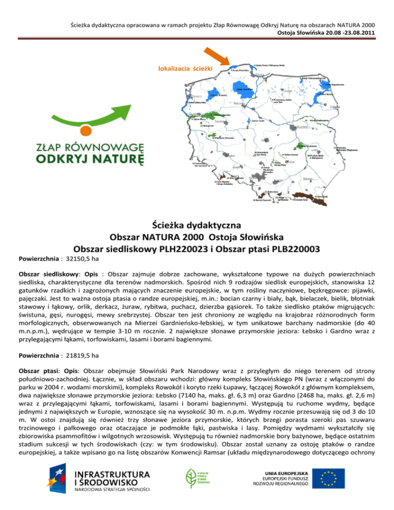 Ścieżka dydaktyczna opracowana w ramach projektu Złap Równowagę Odkryj Naturę na obszarach NATURA 2000 Ostoja Słowioska 20.08 -23.08.2011 lokalizacja ścieżki Ścieżka dydaktyczna Obszar NATURA 2000 Ostoja Słowioska Obszar siedliskowy PLH220023 i Obszar ptasi PLB220003 Powierzchnia : 32150,5 ha Obszar siedliskowy: Opis : Obszar zajmuje dobrze zachowane, wykształcone typowe na dużych powierzchniach siedliska, charakterystyczne dla terenów nadmorskich. Spośród nich 9 rodzajów siedlisk europejskich, stanowiska 12 gatunków rzadkich i zagrożonych mających znaczenie europejskie, w tym rośliny naczyniowe, bęzkręgowce: pijawki, pajęczaki. Jest to ważna ostoja ptasia o randze europejskiej, m.in.: bocian czarny i biały, bąk, bielaczek, bielik, błotniak stawowy i łąkowy, orlik, derkacz, żuraw, rybitwa, puchacz, dzierzba gąsiorek. To także siedlisko ptaków migrujących: świstuna, gęsi, nurogęsi, mewy srebrzystej. Obszar ten jest chroniony ze względu na krajobraz różnorodnych form morfologicznych, obserwowanych na Mierzei Gardnieosko-łebskiej, w tym unikatowe barchany nadmorskie (do 40 m.n.p.m.), wędrujące w tempie 3-10 m rocznie. 2 największe słonawe przymorskie jeziora: Łebsko i Gardno wraz z przylegającymi łąkami, torfowiskami, lasami i borami bagiennymi. Powierzchnia : 21819,5 ha Obszar ptasi: Opis: Obszar obejmuje Słowioski Park Narodowy wraz z przyległym do niego terenem od strony południowo-zachodniej. Łącznie, w skład obszaru wchodzi: główny kompleks Słowioskiego PN (wraz z włączonymi do parku w 2004 r. wodami morskimi), kompleks Rowokół i koryto rzeki Łupawy, łączącej Rowokół z głównym kompleksem, dwa największe słonawe przymorskie jeziora: Łebsko (7140 ha, maks. gł. 6,3 m) oraz Gardno (2468 ha, maks. gł. 2,6 m) wraz z przylegającymi łąkami, torfowiskami, lasami i borami bagiennymi. Występują tu ruchome wydmy, będące jednymi z największych w Europie, wznoszące się na wysokośd 30 m. n.p.m. Wydmy rocznie przesuwają się od 3 do 10 m. W ostoi znajdują się również trzy słonawe jeziora przymorskie, których brzegi porasta szeroki pas szuwaru trzcinowego i pałkowego oraz otaczające je podmokłe łąki, pastwiska i lasy. Pomiędzy wydmami wykształciły się zbiorowiska psammofitów i wilgotnych wrzosowisk. Występują tu również nadmorskie bory bażynowe, będące ostatnim stadium sukcesji w tych środowiskach (czy: w tym środowisku). Obszar został uznany za ostoję ptaków o randze europejskiej, a także wpisano go na listę obszarów Konwencji Ramsar (układu międzynarodowego dotyczącego ochrony 1 Ścieżka dydaktyczna opracowana w ramach projektu Złap Równowagę Odkryj Naturę na obszarach NATURA 2000 Ostoja Słowioska 20.08 -23.08.2011 przyrody z 1971 roku). Stwierdzono tu występowanie 28 gatunków z Załącznika I Dyrektywy Ptasiej i 11 gatunków regularnie migrujących, nie wymienionych w dyrektywie. Ponadto 11 gatunków żyjących na tym obszarze ptaków wpisano do Polskiej Czerwonej Księgi Zwierząt. Do lęgów przystępuje tu przynajmniej 1% krajowej populacji: bielika, orła przedniego, rybołowa, puchacza, biegusa zmiennego, i sieweczki obrożnej. Odnotowano też dośd duże zagęszczenie kormorana czarnego i błotniaka łąkowego. W czasie przelotów występuje tu ponad 4% populacji szlaku wędrówkowego gęsi zbożowej, 3% żurawia, 2% bielaczka i ponad 1% nurogęsia. Jest to również ostoja morświna, wielu rzadkich gatunków bezkręgowców, z pijawkami i pajęczakami na czele. Stwierdzono tu również 22 gatunki roślin chronionych. (© Instytut na Rzecz Ekorozwoju: za: http://obszary.natura2000.org.pl/) Punkt koocowy Jez. Dołgie Duże Jez. Gardno Punkt początkowy Legenda przystanków: przystanek ścieżka piesza Rodzaj ścieżki: piesza Długośd ścieżki: 7 km Czas przejścia: 1,5 h Stopieo trudności: umiarkowanie trudna Liczba przystanków: 7 Logo ścieżki w Ostoi Słowioskiej stworzony podczas obozu studneckiego 2 Ścieżka dydaktyczna opracowana w ramach projektu Złap Równowagę Odkryj Naturę na obszarach NATURA 2000 Ostoja Słowioska 20.08 -23.08.2011 Przebieg ścieżki dydaktycznej Dlaczego Ostoja Słowioska została objęta siecią Natura 2000 ? Teren ten to mozaika skrajnie różnych ekosystemów nadmorskich. Można znaleźd tu krajobraz piaszczystej mierzei morskiej, ruchome wydmy oraz piaszczyste łachy na brzegach płytkich jezior Łebsko i Gardno. Zaglębienia między jeziorami wypełniają torfowiska a ich brzegi porastają olsy. Na wydmach występuje kilka rodzajów boru, w tym wyjątkowo rzadki nadmorski bór bażynowy. Takie bogactwo siedlisk oraz ciepły piasek wydm to idealne miejsce do składania jaj, dlatego w ostoi tej można zaobserwowad w ciągu roku ponad 260 różnych gatunków ptaków. 55 spośród nich to gatunki priorytetowe dla Unii Europejskiej, wymienione w Załączniku I Dyrektywy ptasiej, między innymi bielaczek i derkacz. W sezonie migracyjnym nocuje tu kilka tysięcy żurawi! Żuraw Grus grus – jesienią widuje się ich tu ponad 5 tysięcy Piaszczysta bałtycka plaża Fot. J. Nowak Śródleśna łąka – miejsce rykowiska Fot. J. Nowak Przystanek 1 - początkowy Współrzędne: N54° 40' 36,04"; E 17° 8' 5,22" Temat: Przepompownia Okolice Przepompowni to znane miejsce jelenich godów. Na przełomie września i października przez cztery tygodnie rozlega się tu potężny ryk byków. Samce rykiem wzywają rywali na walki. To jedyne w swoim rodzaju zawody polegające na przepychaniu konkurenta za pomocą potężnego poroża (czy: na nacieraniu na konkurenta potężnym porożem). Chodzi przede wszystkim o pokaz siły, nie o zranienie przeciwnika. Zwycięzca odchodzi z łaniami. Młode byki, nazywane przez myśliwych „chłystami” mogą tylko patrzed jak dorodny samiec odprowadza łanie na miejsce godów. Rycina: Jeleń na rykowisku Śródleśna łąka – miejsce rykowiska Fot. J. Nowak Słowioskiej są pochodzenia polodowcowego. Oz