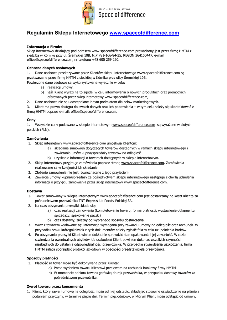 Regulamin Sklepu Internetowego www.spaceofdifference.com Informacja o Firmie: Sklep internetowy działający pod adresem www.spaceofdifference.com prowadzony jest przez firmę HMTM z siedzibą w Kórniku przy ul. Śremskiej 10B, NIP 781-166-84-35, REGON 364150447, e-mail [email protected], nr telefonu +48 605 259 220. Ochrona danych osobowych 1. Dane osobowe przekazywane przez Klientów sklepu internetowego www.spaceofdifference.com są przetwarzane przez firmę HMTM z siedzibą w Kórniku przy ulicy Śremskiej 10B. Powierzone dane osobowe są wykorzystywane wyłącznie w celu: a) realizacji umowy, b) jeśli Klient wyrazi na to zgodę, w celu informowania o nowych produktach oraz promocjach oferowanych przez sklep internetowy www.spaceofdifference.com, 2. Dane osobowe nie są udostępniane innym podmiotom dla celów marketingowych. 3. Klient ma prawo dostępu do swoich danych oraz ich poprawiania – w tym celu należy się skontaktować z firmą HMTM poprzez e-mail: [email protected]. Ceny 1. Wszystkie ceny podawane w sklepie internetowym www.spaceofdifference.com są wyrażone w złotych polskich (PLN). Zamówienia 1. Sklep internetowy www.spaceofdifference.com umożliwia Klientom: a) składanie zamówień dotyczących towarów dostępnych w ramach sklepu internetowego i zawierania umów kupna/sprzedaży towarów na odległość b) uzyskanie informacji o towarach dostępnych w sklepie internetowym. 2. Sklep internetowy przyjmuje zamówienia poprzez stronę www.spaceofdifference.com. Zamówienia realizowane są w kolejności ich składania. 3. Złożenie zamówienia nie jest równoznaczne z jego przyjęciem. 4. Zawarcie umowy kupna/sprzedaży za pośrednictwem sklepu internetowego następuje z chwilą udzielenia informacji o przyjęciu zamówienia przez sklep internetowy www.spaceofdifference.com. Dostawa 1. Towar zamówiony w sklepie internetowym www.spaceofdifference.com jest dostarczany na koszt Klienta za pośrednictwem przewoźnika TNT Express lub Poczty Polskiej SA. 2. Na czas otrzymania przesyłki składa się: a) czas realizacji zamówienia (kompletowanie towaru, forma płatności, wystawienie dokumentu sprzedaży, spakowanie paczki) b) czas dostawy, zależny od wybranego sposobu dostarczenia. 3. Wraz z towarem wydawane są: informacja wymagana przy zawarciu umowy na odległość oraz rachunek. W przypadku braku któregokolwiek z tych dokumentów należy zgłosić fakt w celu uzupełnienia braków. 4. Po otrzymaniu przesyłki Klient winien dokładnie sprawdzić stan opakowania i jej zawartość. W razie stwierdzenia ewentualnych ubytków lub uszkodzeń Klient powinien dokonać wszelkich czynności niezbędnych do ustalenia odpowiedzialności przewoźnika. W przypadku stwierdzenia uszkodzenia, firma HMTM zaleca sporządzić protokół szkodowy w obecności przedstawiciela przewoźnika. Sposoby płatności 1. Płatność za towar może być dokonywana przez Klienta: a) Przed wydaniem towaru Klientowi przelewem na rachunek bankowy firmy HMTM b) W momencie odbioru towaru gotówką do rąk przewoźnika, w przypadku dostawy towarów za pośrednictwem przewoźnika. Zwrot towaru przez konsumenta 1. Klient, który zawarł umowę na odległość, może od niej odstąpić, składając stosowne oświadczenie na piśmie z podaniem przyczyny, w terminie pięciu dni. Termin pięciodniowy, w którym Klient może odstąpić od umowy, 2. 3. 4. 5. 6. liczy się od dnia dostarczenia towaru. Do zachowania tego terminu wystarczy wysłanie oświadczenia przed jego upływem lub załączyć do przesyłki ze zwracanym towarem. W celu identyfikacji zwracanego towaru wskazane jest podanie numeru zamówienia. Brak numeru zamówienia nie stanowi przeszkody w zwrocie towaru. Towar zwracany powinien być w stanie niezmienionym, kompletny i starannie opakowany. Zwrot towaru do sprzedawcy powinien nastąpić niezwłocznie, nie później niż w terminie 14 dni od momentu odstąpienia od umowy kupna/sprzedaży. Zwrot następuje za pisemnym potwierdzeniem odbioru towaru przez sprzedawcę. W sytuacji, gdy Klient zdecyduje się na zwrot towaru a decyzję poprze pisemną deklaracją oraz gdy zostaną w całości spełnione postanowienia pkt. 3 i 4, umowę kupna/ sprzedaży uważa się za nie zawartą. Klientowi zostanie wystawiona korekta do dokumentu zakupu. Zwracany towar Klient wysyła na własny koszt pod adres firmy HMTM, ul. Śremska 10B, 62-035 Kórnik. Procedura reklamacji towarów zakupionych za pośrednictwem sklepu internetowego www.spaceofdifference.com 1. Jeżeli zakupiony towar zawiera wady lub jest niezgodny z umową, koszty zwrotu przesyłki pokrywa firma HMTM. Zgłoszona wada lub niezgodność towaru podlega weryfikacji przez pracownika firmy HMTM, który stwierdzi czy wada lub niezgodność towaru istniała w chwili jego wydania. 2. Dostarczenie zwrotne towaru w ramach reklamacji jest bezwarunkowe. 3. Towar powinien zawierać oryginalne opakowanie umożliwiające bezpieczny transport do firmy HMTM 4. Dopuszczalne jest zastosowanie opakowania zastępczego, jednak musi ono gwarantować odpowiednią ochronę podczas transportu. 5. Towar powinien zostać przysłany kompletny. Do towaru należy dołączyć dokument opisujący powód reklamacji. 6. Do reklamowanego towaru należy dołączyć dowód zakupu. 7. Sposób dostarczenia towaru w ramach reklamacji: a) Dostarczenie towaru jest bezpłatne; w tym celu Klient powinien skontaktować się z pracownikiem firmy HMTM. b) W przypadku niezasadności reklamacji Klient zostanie obciążony kosztami dostarczenia towaru. c) Po zakończeniu procedury reklamacyjnej towar zostanie odesłany do Klienta na koszt firmy HMTM, o ile zgłoszenie reklamacyjne jest zasadne. 8. Reklamowany towar Klient wysyła pod adres firmy HMTM, ul. Śremska 10B, 62-035 Kórnik. Postanowienia końcowe 1. Złożenie zamówienia jest równoznaczne z akceptacją niniejszego regulaminu. 2. Podmiot prowadzący sklep nie ponosi odpowiedzialności za przerwy w korzystaniu ze sklepu internetoweg
