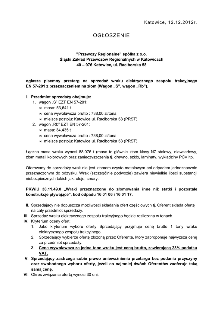 Katowice, 12.12.2012r. OGŁOSZENIE ”Przewozy Regionalne” spółka z o.o. Śląski Zakład Przewozów Regionalnych w Katowicach 40 – 076 Katowice, ul. Raciborska 58 ogłasza pisemny przetarg na sprzedaŜ wraku elektrycznego zespołu trakcyjnego EN 57-201 z przeznaczeniem na złom (Wagon „S”, wagon „Rb”). I. Przedmiot sprzedaŜy obejmuje: 1. wagon „S” EZT EN 57-201: • masa: 53,641 t • cena wywoławcza brutto : 738,00 zł/tona • miejsce postoju: Katowice ul. Raciborska 58 (PRST) 2. wagon „Rb” EZT EN 57-201: • masa: 34,435 t • cena wywoławcza brutto : 738,00 zł/tona • miejsce postoju: Katowice ul. Raciborska 58 (PRST) Łączna masa wraku wynosi 88,076 t (masa to głównie złom klasy N7 stalowy, niewsadowy, złom metali kolorowych oraz zanieczyszczenia tj. drewno, szkło, laminaty, wykładziny PCV itp. Oferowany do sprzedaŜy wrak nie jest złomem czysto metalowym ani odpadem jednoznacznie przeznaczonym do odzysku. Wrak (szczególnie podwozie) zawiera niewielkie ilości substancji niebezpiecznych takich jak: oleje, smary. PKWiU 38.11.49.0 „Wraki przeznaczone do złomowania inne niŜ statki i pozostałe konstrukcje pływające”, kod odpadu 16 01 06 i 16 01 17. II. Sprzedający nie dopuszcza moŜliwości składania ofert częściowych tj. Oferent składa ofertę na cały przedmiot sprzedaŜy. III. SprzedaŜ wraku elektrycznego zespołu trakcyjnego będzie rozliczana w tonach. IV. Kryterium oceny ofert: 1. Jako kryterium wyboru oferty Sprzedający przyjmuje cenę brutto 1 tony wraku elektrycznego zespołu trakcyjnego. 2. Sprzedający wybierze ofertę złoŜoną przez Oferenta, który zaproponuje najwyŜszą cenę za przedmiot sprzedaŜy. 3. Cena wywoławcza za jedną tonę wraku jest ceną brutto, zawierającą 23% podatku VAT. V. Sprzedający zastrzega sobie prawo uniewaŜnienia przetargu bez podania przyczyny oraz swobodnego wyboru oferty, jeŜeli co najmniej dwóch Oferentów zaoferuje taką samą cenę. VI. Okres związania ofertą wynosi 30 dni. VII. Pisemne oferty w zamkniętych kopertach z opisem „Oferta na kupno wraku elektrycznego zespołu trakcyjnego – nie otwierać” naleŜy składać w siedzibie Sprzedającego tj. Katowice, ul. Raciborska 58, pokój 214 (II piętro Sekretariat) do dnia 19 grudnia 2012 r. do godz. 9:00 VIII. Wzory załączników niezbędnych do skompletowania oferty, projekt umowy, instrukcję do sporządzenia oferty będą przesyłane nieodpłatnie w wersji elektronicznej. Wnioski o przesłanie w/w dokumentów naleŜy składać na adres wskazany w nagłówku, adres e-mail [email protected], [email protected] Ww. informacje dostępne są równieŜ na stronie internetowej www.przewozyregionalne.pl