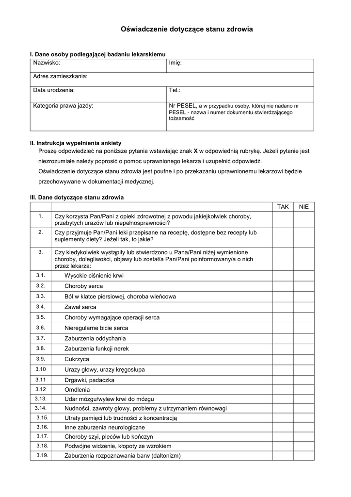 Oświadczenie dotyczące stanu zdrowia I. Dane osoby podlegającej badaniu lekarskiemu Nazwisko: Imię: Adres zamieszkania: Data urodzenia: Tel.: Kategoria prawa jazdy: Nr PESEL, a w przypadku osoby, której nie nadano nr PESEL - nazwa i numer dokumentu stwierdzającego tożsamość II. Instrukcja wypełnienia ankiety Proszę odpowiedzieć na poniższe pytania wstawiając znak X w odpowiednią rubrykę. Jeżeli pytanie jest niezrozumiałe należy poprosić o pomoc uprawnionego lekarza i uzupełnić odpowiedź. Oświadczenie dotyczące stanu zdrowia jest poufne i po przekazaniu uprawnionemu lekarzowi będzie przechowywane w dokumentacji medycznej. III. Dane dotyczące stanu zdrowia TAK 1. Czy korzysta Pan/Pani z opieki zdrowotnej z powodu jakiejkolwiek choroby, przebytych urazów lub niepełnosprawności? 2. Czy przyjmuje Pan/Pani leki przepisane na receptę, dostępne bez recepty lub suplementy diety? Jeżeli tak, to jakie? 3. Czy kiedykolwiek wystąpiły lub stwierdzono u Pana/Pani niżej wymienione choroby, dolegliwości, objawy lub został/a Pan/Pani poinformowany/a o nich przez lekarza: 3.1. Wysokie ciśnienie krwi 3.2. Choroby serca 3.3. Ból w klatce piersiowej, choroba wieńcowa 3.4. Zawał serca 3.5. Choroby wymagające operacji serca 3.6. Nieregularne bicie serca 3.7. Zaburzenia oddychania 3.8. Zaburzenia funkcji nerek 3.9. Cukrzyca 3.10 Urazy głowy, urazy kręgosłupa 3.11 Drgawki, padaczka 3.12 Omdlenia 3.13. Udar mózgu/wylew krwi do mózgu 3.14. Nudności, zawroty głowy, problemy z utrzymaniem równowagi 3.15. Utraty pamięci lub trudności z koncentracją 3.16. Inne zaburzenia neurologiczne 3.17. Choroby szyi, pleców lub kończyn 3.18. Podwójne widzenie, kłopoty ze wzrokiem 3.19. Zaburzenia rozpoznawania barw (daltonizm) NIE TAK 3.20. Trudności w widzeniu po zmierzchu i częste uczucie oślepienia przez światła innych pojazdów 3.21. Ubytek słuchu lub głuchota 3.22. Choroby psychiczne, depresję lub zaburzenia nerwicowe 4. Czy kiedykolwiek miał Pan/Pani operację lub wypadek, lub był/a Pan/Pani w szpitalu z jakiegokolwiek powodu? Jeżeli tak, to proszę opisać: 5. Czy używa lub kiedykolwiek używał/a Pan/Pani aparatu słuchowego? Jeżeli tak, to proszę podać kiedy? 6. Czy kiedykolwiek był/a Pan/Pani badany/a z powodu zaburzeń snu lub lekarz informował, że ma Pan/Pani zaburzenia snu, zespoły bezdechu nocnego lub narkolepsję? 7. Czy ktokolwiek mówił Panu/Pani o zaobserwowanych u Pana/Pani epizodach zatrzymania oddechu w czasie snu? 8. Czy kiedykolwiek potrzebował/a Pan/Pani pomocy lub wsparcia z powodu nadużycia alkoholu lub środków działających podobnie do alkoholu? 9. Czy używa Pan/Pani narkotyków lub innych substancji psychoaktywnych? Jeżeli tak, to jakich? 10. Jak często pije Pan/Pani alkohol (piwo, wino, wódka i inne alkohole) NIE *) Nigdy albo rzadziej niż raz w miesiącu Raz w miesiącu Dwa do czterech razy w miesiącu Dwa do trzech razy w tygodniu Cztery i więcej razy w tygodniu 11. Czy był/a Pan/Pani sprawcą/uczestnikiem wypadku drogowego od dnia zdania egzaminu na prawo jazdy? 12. Czy pobiera Pan/Pani rentę z tytułu niezdolności do pracy? Jeżeli tak, to z jakiego powodu? 13. Czy posiada Pan/Pani orzeczenie stwierdzające niepełnosprawność? Jeżeli tak, to jakie i z jakiej przyczyny? IV. Oświadczam, że jestem świadomy/a konieczności zgłoszenia się do ponownej oceny stanu zdrowia w celu stwierdzenia istnienia lub braku przeciwwskazań zdrowotnych do kierowania pojazdami w przypadku: 1) wystąpienia u osób chorych na cukrzycę w porze czuwania epizodu ciężkiej hipoglikemii, także niezwiązanego z kierowaniem pojazdami, 2) wystąpienia napadu padaczki lub drgawek. V. Pouczony/a o odpowiedzialności karnej z art. 233 Kodeksu karnego – oświadczam, że podane przeze mnie dane są zgodne z prawdą. Podpis osoby składającej oświadczenie *) zaznaczyć właściwe Data