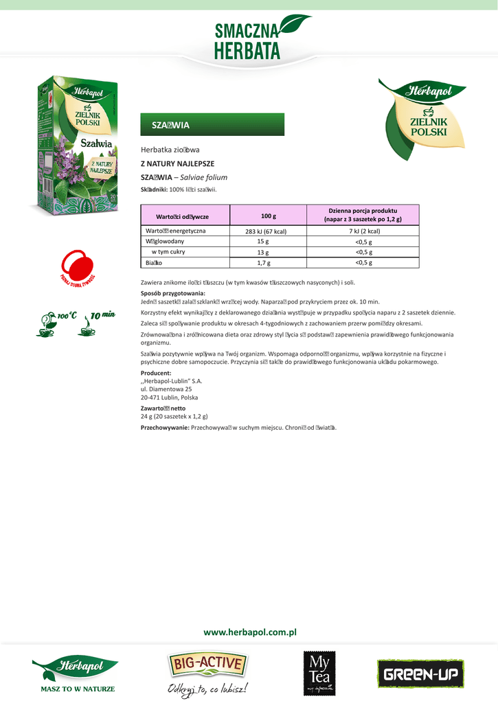 SZAŁWIA Herbatka ziołowa Z NATURY NAJLEPSZE SZAŁWIA – Salviae folium Składniki: 100% liści szałwii. Wartości odżywcze Wartość energetyczna Węglowodany w tym cukry Białko 100 g Dzienna porcja produktu (napar z 3 saszetek po 1,2 g) 283 kJ (67 kcal) 15 g 7 kJ (2 kcal) <0,5 g 13 g <0,5 g 1,7 g <0,5 g Zawiera znikome ilości tłuszczu (w tym kwasów tłuszczowych nasyconych) i soli. Sposób przygotowania: Jedną saszetkę zalać szklanką wrzącej wody. Naparzać pod przykryciem przez ok. 10 min. Korzystny efekt wynikający z deklarowanego działania występuje w przypadku spożycia naparu z 2 saszetek dziennie. Zaleca się spożywanie produktu w okresach 4-tygodniowych z zachowaniem przerw pomiędzy okresami. Zrównoważona i zróżnicowana dieta oraz zdrowy styl życia są podstawą zapewnienia prawidłowego funkcjonowania organizmu. Szałwia pozytywnie wpływa na Twój organizm. Wspomaga odporność organizmu, wpływa korzystnie na fizyczne i psychiczne dobre samopoczucie. Przyczynia się także do prawidłowego funkcjonowania układu pokarmowego. Producent: ,,Herbapol-Lublin” S.A. ul. Diamentowa 25 20-471 Lublin, Polska Zawartość netto 24 g (20 saszetek x 1,2 g) Przechowywanie: Przechowywać w suchym miejscu. Chronić od światła. www.herbapol.com.pl