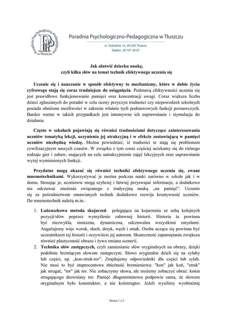 Jak ułatwić dziecku naukę, czyli kilka słów na temat technik efektywnego uczenia się Uczenie się i nauczanie w sposób efektywny to mechanizmy, które w dobie życia cyfrowego stają się coraz trudniejsze do osiągnięcia. Podstawą efektywności uczenia się jest prawidłowe funkcjonowanie pamięci oraz koncentracji uwagi. Coraz większa liczba dzieci zgłaszanych do poradni w celu oceny przyczyn trudności czy niepowodzeń szkolnych posiada obniżone możliwości w zakresie właśnie tych podstawowych funkcji poznawczych. Bardzo ważne w takich przypadkach jest intensywne ich usprawnianie i stymulacja do działania. Często w szkołach pojawiają się również trudnościami dotyczące zainteresowania uczniów tematyką lekcji, uczynienia jej atrakcyjną i w efekcie zostawiającą w pamięci uczniów niezbędną wiedzę. Można powiedzieć, iż trudności te stają się problemem cywilizacyjnym naszych czasów. W związku z tym coraz częściej uciekamy się do różnego rodzaju gier i zabaw, mających na celu uatrakcyjnienie zajęć lekcyjnych oraz usprawnianie wyżej wymienionych funkcji. Przydatne mogą okazać się również techniki efektywnego uczenia się, zwane mnemotechnikami. Wykorzystywać je można podczas nauki zarówno w szkole jak i w domu. Stosując je, uczniowie mogą szybciej i łatwiej przyswajać informacje, a dodatkowo nie odczuwać znużenia związanego z tradycyjną nauką „na pamięć”. Uczenie się za pośrednictwem omawianych technik dodatkowo rozwija kreatywność uczniów. Do mnemotechnik należą m.in.: 1. Łańcuszkowa metoda skojarzeń polegająca na kojarzeniu ze sobą kolejnych pozycji/słów poprzez wymyślenie zabawnej historii. Historia ta powinna być niezwykła, śmieszna, dynamiczna, odczuwalna wszystkimi zmysłami. Angażujemy więc wzrok, słuch, dotyk, węch i smak. Osoba ucząca się powinna być uczestnikiem tej historii i oczywiście jej autorem. Skuteczność zapamiętania zwiększa również plastyczność obrazu i żywa zmiana scenerii. 2. Technika słów zastępczych, czyli zamienianie słów oryginalnych na obrazy, dzięki podobnie brzmiącym słowom zastępczym. Słowo oryginalne dzieli się na sylaby lub części, np. „kon-struk-tor”. Znajdujemy odpowiedniki dla części lub sylab. Nie musi to być stuprocentowa zbieżność brzmieniowa: "kon" jak koń, "struk" jak strugać, "tor" jak tor. Nie zobaczymy słowa, ale możemy zobaczyć obraz: konia strugającego drewniany tor. Pamięć długoterminowa podpowie sama, że słowem oryginalnym było konstruktor, a nie koństrugtor. Jeżeli wysilimy wyobraźnię Strona 1 z 3 to zobaczymy jeszcze znaczenie tego słowa. Koń strugający drewniane tory jest przecież ich konstruktorem. 3. Rzymski pokój, polegający na zapamiętywaniu serii słów poprzez kojarzenie ich z miejscami, przedmiotami znajdującymi się w pokoju, domu, sali lekcyjnej. Ważne jest, aby odnosić się do czegoś, co jest stałe i nam dobrze znane. Mogą to być nawet kolejne przystanki w naszej drodze do pracy czy szkoły (jeżeli jeździmy komunikacją publiczną) lub jakieś stałe elementy trasy samochodowej np. kolejne budynki. Przykład: do zapamiętania mamy następujące wyrazy: monety, kasza, miś, guzik, pająk, drzewo, słoik, brama, jarzębina. Umieszczamy je teraz w jakimś dobrze nam znanym miejscu, np. w pokoju. Rozsypane monety leżą na stoliku, komoda posypana jest kaszą, miś wdrapał się na telewizor, guzik wszedł na ścienny zegar i spina wskazówki, pająk biega po głośnikach, drzewo wyrosło na stole, słoik pełni rolę termostatu w grzejniku, brama blokuje dojście do kanapy, a jarzębina zwisa z żyrandola. W tej metodzie ważne jest, żeby ustalić miejsce startu i kierunek ruchu, czyli jak będziemy poruszać się po naszym rzymskim pokoju. Istnieje wiele innych mnemotechnik, które można odnaleźć w literaturze bądź w źródłach internetowych i wykorzystać w codziennej nauce czy pracy. Niestety mają one swoje minusy. Każda z nich wymaga pewnego nakładu pracy, co w dzisiejszych czasach, przy dostępie do wielu informacji i narzędzi technologicznych oraz tzw. gotowców może się wydawać nieekonomiczne i po prostu niepotrzebne. Warto jednak poświęcić trochę czasu, jeżeli da to możliwość zobaczenia postępów w szkolnym funkcjonowaniu uczniów. Przy doborze mnemotechnik powinniśmy kierować się indywidualnymi możliwościami każdego z uczniów. Jeżeli samo nauczenie się metody zajmuje dużo czasu i związane jest z oporem wewnętrznym, to nie ma sensu tego robić, ponieważ nie przyniesie spodziewanych efektów. Do niektórych technik trzeba po prostu „dojrzeć”. W nauczaniu młodszych dzieci można korzystać z prostszych technik efektywnego uczenia się, do których należy, np. uczenie z wykorzystaniem rymu i rytmu, czyli poprzez różnego rodzaju wierszyki, skojarzenia (odnajdywanie związku między informacjami nowymi a już znanymi), a także poprzez akronimy i akrostychy: Akronimy- zdania, w których pierwsze litery odnoszą się do tego, co chcemy zapamiętać (Krzyczy gruszka do jabłuszka: „wiesz, chuda bardzo ta pietruszka!” – pierwsze litery to spółgłoski po których piszemy „rz”). Akrostychy- przypadek odwrotny: mamy do zapamiętania jakiś wyraz, np. Gibraltar i tworzymy zdanie zaczynające się kolejno od liter znajdujących się w danym wyrazie. Gdy zależy nam na efektywności nauczania, podczas przekazywania wiedzy powinniśmy pamiętać o kilku prostych, ale bardzo ważnych zasadach: „Najpierw powiedz, o czym będziesz mówić, potem to powiedz, a na koniec powiedz, o czym powiedziałeś”. Ważne rzeczy należy powtarzać po ok. 10 minutach, gdyż po tym czasie umyka ok. 90% wiedzy. Powtarzać należy często, ponieważ zwiększa to prawdopodobieństwo trwałego zapisania materiału w pamięci (powtarzanie poprzez gry, teleturnieje, plakaty, itp.). Strona 2 z 3 Najważniejsze wiadomości powinno się przekazywać