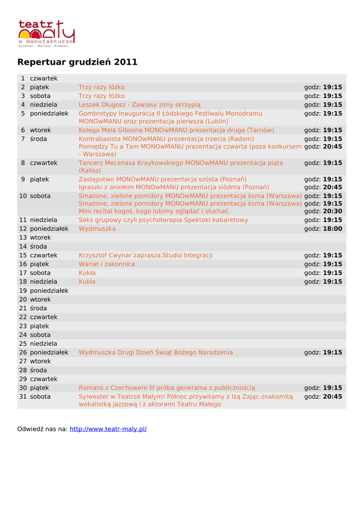 Repertuar grudzień 2011 1 2 3 4 5 czwartek piątek sobota niedziela poniedziałek 6 wtorek 7 środa 8 czwartek 9 piątek 10 sobota 11 12 13 14 15 16 17 18 19 20 21 22 23 24 25 26 27 28 29 30 31 niedziela poniedziałek wtorek środa czwartek piątek sobota niedziela poniedziałek wtorek środa czwartek piątek sobota niedziela poniedziałek wtorek środa czwartek piątek sobota Trzy razy łóżko Trzy razy łóżko Leszek Długosz - Zawiasy zimy skrzypią Gombrotypy Inauguracja II Łódzkiego Festiwalu Monodramu MONOwMANU oraz prezentacja pierwsza (Lublin) Kolega Mela Gibsona MONOwMANU prezentacja druga (Tarnów) Kontrabasista MONOwMANU prezentacja trzecia (Radom) Pomiędzy Tu a Tam MONOwMANU prezentacja czwarta (poza konkursem - Warszawa) Tancerz Mecenasa Kraykowskiego MONOwMANU prezentacja piąta (Kalisz) Zastępstwo MONOwMANU prezentacja szósta (Poznań) Igraszki z aniołem MONOwMANU prezentacja siódma (Poznań) Smażone, zielone pomidory MONOwMANU prezentacja ósma (Warszawa) Smażone, zielone pomidory MONOwMANU prezentacja ósma (Warszawa) Mini recital kogoś, kogo lubimy oglądać i słuchać. Seks grupowy czyli psychoterapia Spektakl kabaretowy Wydmuszka godz: godz: godz: godz: godz: godz: godz: godz: godz: godz: godz: 19:15 20:45 19:15 19:15 20:30 19:15 18:00 Krzysztof Cwynar zaprasza.Studio Integracji Wariat i zakonnica Kukła Kukła godz: godz: godz: godz: 19:15 19:15 19:15 19:15 Wydmuszka Drugi Dzień Świąt Bożego Narodzenia godz: 19:15 Romans z Czechowem III próba generalna z publicznością Sylwester w Teatrze Małym! Północ przywitamy z Izą Zając-znakomitą wokalistką jazzową i z aktorami Teatru Małego godz: 19:15 godz: 20:45 Odwiedź nas na: http://www.teatr-maly.pl/ Powered by TCPDF (www.tcpdf.org) 19:15 19:15 19:15 19:15 godz: 19:15 godz: 19:15 godz: 20:45 godz: 19:15