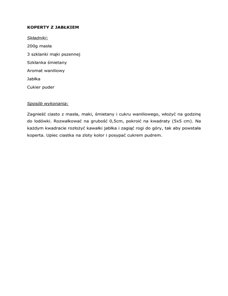 KOPERTY Z JABŁKIEM Składniki: 200g masła 3 szklanki mąki pszennej Szklanka śmietany Aromat waniliowy Jabłka Cukier puder Sposób wykonania: Zagnieść ciasto z masła, maki, śmietany i cukru waniliowego, włożyć na godzinę do lodówki. Rozwałkować na grubość 0,5cm, pokroić na kwadraty (5x5 cm). Na każdym kwadracie rozłożyć kawałki jabłka i zagiąć rogi do góry, tak aby powstała koperta. Upiec ciastka na zloty kolor i posypać cukrem pudrem.