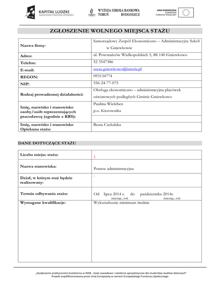 ZGŁOSZENIE WOLNEGO MIEJSCA STAŻU Samorządowy Zespół Ekonomiczno – Administracyjny Szkół Nazwa firmy: w Gniewkowie Adres: ul. Powstańców Wielkopolskich 5, 88-140 Gniewkowo Telefon: 52 3547386 E-mail: [email protected] REGON: 093134774 NIP: 556-24-77-075 Obsługa ekonomiczno – administracyjna placówek Rodzaj prowadzonej działalności: Imię, nazwisko i stanowisko osoby/osób reprezentujących pracodawcę (zgodnie z KRS): Imię, nazwisko i stanowisko Opiekuna stażu: oświatowych podległych Gminie Gniewkowo Paulina Wicleben p.o. Kierownika Beata Czekalska DANE DOTYCZĄCE STAŻU Liczba miejsc stażu: Nazwa stanowiska: Dział, w którym staż będzie realizowany: Termin odbywania stażu: 1 Pomoc administracyjna - Od lipca 2014 r. do października 2014r. miesiąc, rok Wymagane kwalifikacje: miesiąc, rok Wykształcenie minimum średnie „Zwiększenie praktyczności kształcenia w WSB - staże zawodowe i szkolenia specjalistyczne dla studentów studiów dziennych” Projekt współfinansowany przez Unię Europejską w ramach Europejskiego Funduszu Społecznego Oświadczam, że: - zakład nie jest w stanie upadłości, likwidacji; - organizacja stażu dla skierowanego studenta nie będzie przyczyną zwolnień pracowników zatrudnionych w przedsiębiorstwie. SZCZEGÓŁOWY PROGRAM STAŻU Zakres obowiązków Stażysty 1. 2. 3. 4. 5. 6. 7. 8. Zapoznanie się ze strukturą organizacyjną SZEAS w Gniewkowie oraz przepisami BHP. Poznanie zasad obiegu dokumentacji. Zapoznanie się z zasadami ochrony danych osobowych. Poznanie i stosowanie przepisów prawnych związanych z prawem samorządowym, Kodeksem Postępowania Administracyjnego, przepisami gminnymi i oświatowymi. Zdobywanie praktycznych umiejętności związanych z obsługą interesantów: a. Pomoc w wypełnianiu i przyjmowanie wniosków m.in. o stypendium szkolne, zasiłek szkolny, o dofinansowanie kosztów kształcenia młodocianych pracowników. b. Obserwacja pracy i pomoc na wszystkich stanowiskach pracy zgodnie ze statutem SZEAS w Gniewkowie. Zapoznanie się z techniką tworzenia i przechowywania dokumentacji urzędowej. Zdobywanie umiejętności w przygotowywaniu aktów normatywnych, tj. uchwał i zarządzeń związane z działalnością placówek oświatowych i SZEAS. Zdobywanie umiejętności pracy w zespole, przygotowanie do samodzielnej pracy i podejmowania decyzji. Wymiar godzinowy Liczba godzin dziennie: 8 Godziny pracy: od 7.00 do 15.00 Cele edukacyjne 1. Zdolność podejmowania decyzji w oparciu o wiedzę. 2. Umiejętność skutecznego komunikowania się w środowisku pracy. 3. Umiejętność efektywnego komunikowania i prowadzenia dialogu poprzez przekazywanie innym swoich myśli w zrozumiały dla nich sposób, uważne i aktywne słuchanie wypowiedzi innych. 4. Umiejętność zarządzania czasem. 5. Umiejętność identyfikowania u siebie i u innych osób mocnych i słabych stron funkcjonowania zawodowego. 6. Umiejętność budowania własnego wizerunku. 7. Umiejętność autoprezentacji i rozwiązywania konfliktów. 8. Skuteczne komunikowanie się w formie ustnej i pisemnej. „Zwiększenie praktyczności kształcenia w WSB - staże zawodowe i szkolenia specjalistyczne dla studentów studiów dziennych” Projekt współfinansowany przez Unię Europejską w ramach Europejskiego Funduszu Społecznego Zobowiązuję się do: - dostarczenia, wraz z wypełnionym Zgłoszeniem wolnego miejsca stażu, kserokopii wpisu do KRS - wzięcia udziału w spotkaniu informacyjnym dla studentów, podczas którego zostanie zaprezentowana firma/instytucja, którą reprezentuję Gniewkowo, 02.07.2014r. Miejscowość i data Paulina Wicleben p.o. Kierownika SZEAS w Gniewkowie Podpis osoby reprezentującej i pieczątka firm „Zwiększenie praktyczności kształcenia w WSB - staże zawodowe i szkolenia specjalistyczne dla studentów studiów dziennych” Projekt współfinansowany przez Unię Europejską w ramach Europejskiego Funduszu Społecznego