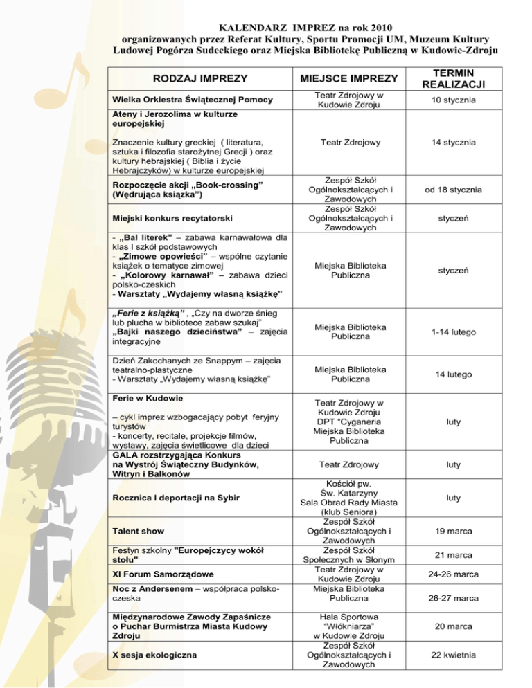KALENDARZ IMPREZ na rok 2010 organizowanych przez Referat Kultury, Sportu Promocji UM, Muzeum Kultury Ludowej Pogórza Sudeckiego oraz Miejska Bibliotekę Publiczną w Kudowie-Zdroju RODZAJ IMPREZY Wielka Orkiestra Świątecznej Pomocy MIEJSCE IMPREZY TERMIN REALIZACJI Teatr Zdrojowy w Kudowie Zdroju 10 stycznia Teatr Zdrojowy 14 stycznia Ateny i Jerozolima w kulturze europejskiej Znaczenie kultury greckiej ( literatura, sztuka i filozofia staroŜytnej Grecji ) oraz kultury hebrajskiej ( Biblia i Ŝycie Hebrajczyków) w kulturze europejskiej Rozpoczęcie akcji „Book-crossing” (Wędrująca ksiązka”) Miejski konkurs recytatorski - „Bal literek” – zabawa karnawałowa dla klas I szkół podstawowych - „Zimowe opowieści” – wspólne czytanie ksiąŜek o tematyce zimowej - „Kolorowy karnawał” – zabawa dzieci polsko-czeskich - Warsztaty „Wydajemy własną ksiąŜkę” „Ferie z ksiąŜką” , „Czy na dworze śnieg lub plucha w bibliotece zabaw szukaj” „Bajki naszego dzieciństwa” – zajęcia integracyjne Dzień Zakochanych ze Snappym – zajęcia teatralno-plastyczne - Warsztaty „Wydajemy własną ksiąŜkę” Ferie w Kudowie – cykl imprez wzbogacający pobyt feryjny turystów - koncerty, recitale, projekcje filmów, wystawy, zajęcia świetlicowe dla dzieci GALA rozstrzygająca Konkurs na Wystrój Świąteczny Budynków, Witryn i Balkonów Rocznica I deportacji na Sybir Talent show Festyn szkolny "Europejczycy wokół stołu" XI Forum Samorządowe Noc z Andersenem – współpraca polskoczeska Międzynarodowe Zawody Zapaśnicze o Puchar Burmistrza Miasta Kudowy Zdroju X sesja ekologiczna Zespół Szkół Ogólnokształcących i Zawodowych Zespół Szkół Ogólnokształcących i Zawodowych od 18 stycznia styczeń Miejska Biblioteka Publiczna styczeń Miejska Biblioteka Publiczna 1-14 lutego Miejska Biblioteka Publiczna 14 lutego Teatr Zdrojowy w Kudowie Zdroju DPT “Cyganeria Miejska Biblioteka Publiczna luty Teatr Zdrojowy luty Kościół pw. Św. Katarzyny Sala Obrad Rady Miasta (klub Seniora) Zespół Szkół Ogólnokształcących i Zawodowych Zespół Szkół Społecznych w Słonym Teatr Zdrojowy w Kudowie Zdroju Miejska Biblioteka Publiczna Hala Sportowa “Włókniarza” w Kudowie Zdroju Zespół Szkół Ogólnokształcących i Zawodowych luty 19 marca 21 marca 24-26 marca 26-27 marca 20 marca 22 kwietnia Międzynarodowy Dzień KsiąŜki dla Dzieci - „Biblioteka u Molika i Molinki” – nadanie imienia oddziałowi dziecięcemu biblioteki Miejska Biblioteka Publiczna kwiecień - Spotkanie z polsko-czeskimi klubami czytelniczymi Majówka 2010 Park Zdrojowy, Teatr Zdrojowy 1-3 maja Muzeum Kultury Ludowej Pogórza Sudeckiego 2 maja Tradycje Kościuszkowskie Występy zespołów ludowych w amfiteatrze skansenu, pieśni narodowe i patriotyczne. Wystawa okolicznościowa związana z tradycjami 3 Majowymi Rocznica Konstytucji 3 Maja Majówka Ireny Dzień w Skansenie poświęcony pamięci Prof. Ireny Kulpowej. Występ Orkiestry Zdrojowej i udział uczestników w strojach stosownie do tradycji tej majówki. Święto kombatantów Bieg uliczny „Polsko – Czeska Dwudziestka IX Zlot Zabytkowych Mercedesów Dzień Olimpijczyka Przegląd Twórczości Dziecięcej Znaczenie znajomości i poszanowania kultury ludności miejscowej w misjach pokojowych ONZ, na przykładzie misji w Afryce i Azji - Konferencja oraz występy zespołów ludowych z krajów afrykańskich i azjatyckich .Pokaz sztuki ludowej afrykańskiej i azjatyckiej , ze zbiorów uczestników misji pokojowych. Dzień Dziecka w Kudowie Zdroju „Bajkowo – ksiąŜkowy Dzień Dziecka „ impreza dla dzieci polskich i czeskich : zabawy integracyjne z chustą animacyjną, spotkanie przy ognisku, lepienie w glinie, pokaz kucia Ŝelaza; Konkurs wiedzy o krajach anglojęzycznych dla szkoły podstawowej (klasy IV - VI) i dla gimnazjum Festyn szkolny IX Ogólnopolski Tydzień Czytania Dzieciom , spotkanie autorskie z pisarzem ksiąŜek dla dzieci, festyn ksiąŜkowy Długi weekend czerwcowy – cykl imprez rozrywkowo-rekreacyjnych Pogórze Sudeckie – Karpaty Wschodnie. Występy zespołów ludowych i wystawa haftu i ceramiki Zioła na naszych polach , łąkach i ścieŜkach. Spacer po skansenie i jego okolicach ze znawcą ziół leczniczych i chronionych – zapoznawanie z ziołami Muzeum Kultury Ludowej Pogórza Sudeckiego Teatr Zdrojowy Muzeum Kultury Ludowej Pogórza Sudeckiego Zespół Szkół Ogólnokształcących i Zawodowych Bieg uliczny Kudowa – Hronov-Kudowa Park Zdrojowy Park Zdrojowy Zespół Przedszkolno-śłobkowy 3 maja 3 maja 8 maja 9 maja 22 maja 27-30 maja 29 maja II połowa maja Muzeum Kultury Ludowej Pogórza Sudeckiego 29 maja Park Zdrojowy 30 maja Miejska Biblioteka Publiczna maj Zespół Szkół Społecznych w Słonym maj Zespół Szkół Ogólnokształcących i Zawodowych maj/czerwiec Miejska Biblioteka Publiczna 2-8 czerwca Park Zdrojowy 3-6 czerwca Muzeum Kultury Ludowej Pogórza Sudeckiego 13 czerwca Muzeum Kultury Ludowej Pogórza Sudeckiego 20 czerwca Język hebrajski – jego historia i piękno Wielka impreza o języku hebrajskim, jego genezie i roli w Biblii. Czytanie psalmów w języku hebrajskim oraz fragmentów Ewangelii, w tym Kazania na Górze w języku aramejskim. Występy zespołów śpiewaczych i tanecznych oraz kuchnia czasów biblijnych. Ogólnopolski Turniej w Piłce Siatkowej PlaŜowej o Puchar Burmistrza KudowyZdroju Bawmy się Razem - impreza integracyjna dla dzieci niepełnosprawnych Muzeum Kultury Ludowej Pogórza Sudeckiego 26 czerwca OW „Wrzos” czerwiec Park Zdrojowy czerwiec godz.17:00 11 czerwiec „Zakopanie” Skrzyni Czasu „Lato z ksiąŜką ‘’ – wakacje w bibliotece (czytanie ksiąŜek, konkursy, zajęcia plastyczne) ; „Z ksiąŜką na wakacyjną przygodę” – kiermasz ksiąŜek; VI Prezentacje Kultury Ludowej Ziem Pogranicznych „RóŜa Kłodzka” Pokazy modelarskie 600 Rocznica bitwy pod Grunwaldem. Polskie pieśni rycerskie i 