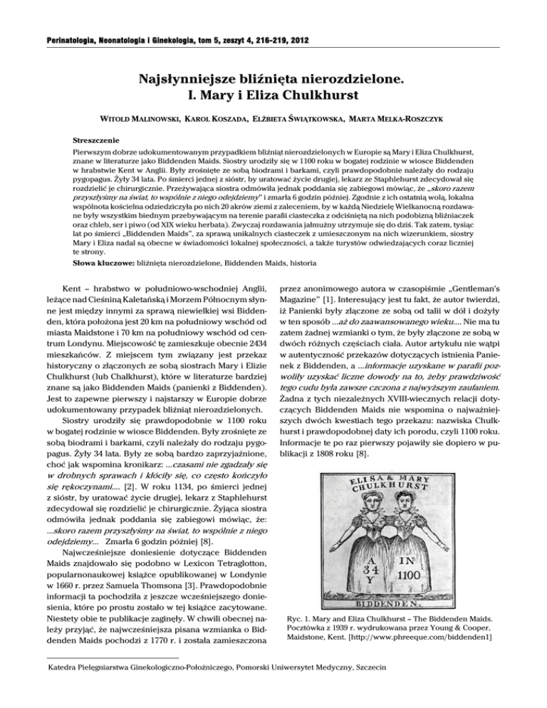 Perinatologia, Neonatologia i Ginekologia, tom 5, zeszyt 4, 216-219, 2012 Najsłynniejsze bliźnięta nierozdzielone. I. Mary i Eliza Chulkhurst WITOLD MALINOWSKI, KAROL KOSZADA, ELŻBIETA ŚWIĄTKOWSKA, MARTA MELKA-ROSZCZYK Streszczenie Pierwszym dobrze udokumentowanym przypadkiem bliźniąt nierozdzielonych w Europie są Mary i Eliza Chulkhurst, znane w literaturze jako Biddenden Maids. Siostry urodziły się w 1100 roku w bogatej rodzinie w wiosce Biddenden w hrabstwie Kent w Anglii. Były zrośnięte ze sobą biodrami i barkami, czyli prawdopodobnie należały do rodzaju pygopagus. Żyły 34 lata. Po śmierci jednej z sióstr, by uratować życie drugiej, lekarz ze Staphlehurst zdecydował się rozdzielić je chirurgicznie. Przeżywająca siostra odmówiła jednak poddania się zabiegowi mówiąc, że „skoro razem przyszłyśmy na świat, to wspólnie z niego odejdziemy” i zmarła 6 godzin później. Zgodnie z ich ostatnią wolą, lokalna wspólnota kościelna odziedziczyła po nich 20 akrów ziemi z zaleceniem, by w każdą Niedzielę Wielkanocną rozdawane były wszystkim biednym przebywającym na terenie parafii ciasteczka z odciśniętą na nich podobizną bliźniaczek oraz chleb, ser i piwo (od XIX wieku herbata). Zwyczaj rozdawania jałmużny utrzymuje się do dziś. Tak zatem, tysiąc lat po śmierci „Biddenden Maids”, za sprawą unikalnych ciasteczek z umieszczonym na nich wizerunkiem, siostry Mary i Eliza nadal są obecne w świadomości lokalnej społeczności, a także turystów odwiedzających coraz liczniej te strony. Słowa kluczowe: bliźnięta nierozdzielone, Biddenden Maids, historia Kent – hrabstwo w południowo-wschodniej Anglii, leżące nad Cieśniną Kaletańską i Morzem Północnym słynne jest między innymi za sprawą niewielkiej wsi Biddenden, która położona jest 20 km na południowy wschód od miasta Maidstone i 70 km na południowy wschód od centrum Londynu. Miejscowość tę zamieszkuje obecnie 2434 mieszkańców. Z miejscem tym związany jest przekaz historyczny o złączonych ze sobą siostrach Mary i Elizie Chulkhurst (lub Chalkhurst), które w literaturze bardziej znane są jako Biddenden Maids (panienki z Biddenden). Jest to zapewne pierwszy i najstarszy w Europie dobrze udokumentowany przypadek bliźniąt nierozdzielonych. Siostry urodziły się prawdopodobnie w 1100 roku w bogatej rodzinie w wiosce Biddenden. Były zrośnięte ze sobą biodrami i barkami, czyli należały do rodzaju pygopagus. Żyły 34 lata. Były ze sobą bardzo zaprzyjaźnione, choć jak wspomina kronikarz: …czasami nie zgadzały się przez anonimowego autora w czasopiśmie „Gentleman's Magazine” [1]. Interesujący jest tu fakt, że autor twierdzi, iż Panienki były złączone ze sobą od talii w dół i dożyły w ten sposób …aż do zaawansowanego wieku…. Nie ma tu zatem żadnej wzmianki o tym, że były złączone ze sobą w dwóch różnych częściach ciała. Autor artykułu nie wątpi w autentyczność przekazów dotyczących istnienia Panienek z Biddenden, a ...informacje uzyskane w parafii poz- woliły uzyskać liczne dowody na to, żeby prawdziwość tego cudu była zawsze czczona z najwyższym zaufaniem. Żadna z tych niezależnych XVIII-wiecznych relacji dotyczących Biddenden Maids nie wspomina o najważniejszych dwóch kwestiach tego przekazu: nazwiska Chulkhurst i prawdopodobnej daty ich porodu, czyli 1100 roku. Informacje te po raz pierwszy pojawiły sie dopiero w publikacji z 1808 roku [8]. w drobnych sprawach i kłóciły się, co często kończyło się rękoczynami…. [2]. W roku 1134, po śmierci jednej z sióstr, by uratować życie drugiej, lekarz z Staphlehurst zdecydował się rozdzielić je chirurgicznie. Żyjąca siostra odmówiła jednak poddania się zabiegowi mówiąc, że: …skoro razem przyszłyśmy na świat, to wspólnie z niego odejdziemy… Zmarła 6 godzin później [8]. Najwcześniejsze doniesienie dotyczące Biddenden Maids znajdowało się podobno w Lexicon Tetraglotton, popularnonaukowej książce opublikowanej w Londynie w 1660 r. przez Samuela Thomsona [3]. Prawdopodobnie informacji ta pochodziła z jeszcze wcześniejszego doniesienia, które po prostu zostało w tej książce zacytowane. Niestety obie te publikacje zaginęły. W chwili obecnej należy przyjąć, że najwcześniejsza pisana wzmianka o Biddenden Maids pochodzi z 1770 r. i została zamieszczona Ryc. 1. Mary and Eliza Chulkhurst – The Biddenden Maids. Pocztówka z 1939 r. wydrukowana przez Young & Cooper, Maidstone, Kent. [http://www.phreeque.com/biddenden1] Katedra Pielęgniarstwa Ginekologiczno-Położniczego, Pomorski Uniwersytet Medyczny, Szczecin Najsłynniejsze bliźnięta nierozdzielone. Część I. Mary i Eliza Chulkhurst Wizerunki Panienek z Biddenden przedstawiają dwie kobiety złączone ze sobą zarówno w okolicy barków jaki i bioder (ryc. 1). Sytuacja, w której bliźnięta nierozdzielone są ze sobą złączone dwoma oddzielnymi częściami ciała, zdarza się niezmiernie rzadko, a dzieci te są zazwyczaj tak mocno zniekształcone, iż nie są w stanie przeżyć. Do chwili obecnej opisano zaledwie kilka takich przypadków. Dlatego większość teratologów podważała możliwość istnienia tego rodzaju bliźniąt nierozdzielonych. Chirurg Ballantyne J.W. (1861-1923) był zapewne pierwszym, który w 1895 roku z teratologicznego punktu widzenia dokonał analizy budowy anatomicznej Biddenden Maids [7]. Zasugerował, że w rzeczywistości były one ze sobą złączone tylko w obrębie bioder, a więc należały do rodzaju pygopagus (ryc. 2). Ryc. 2. Pygopagus Tak złączone ze sobą bliźnięta posiadają po dwie kończyny górne i dwie dolne. Dlatego nie mają większych problemów z chodzeniem, a dla ułatwienia chodzenia, zwłaszcza w trakcie spacerów, jedno drugiemu zakłada wewnętrzne ramię na szyję. Tak było też zapewne w przypadku Mary i Elizy Chulkhurst. Teoria ta została w całej rozciągłości poparta przez takich