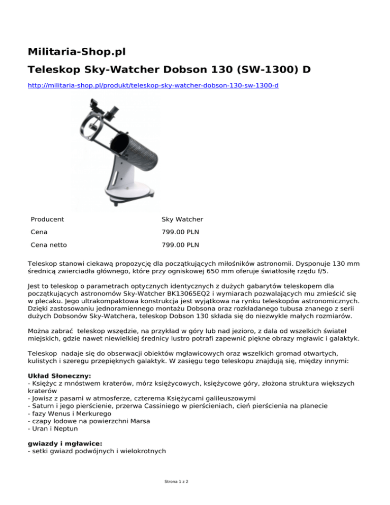 Militaria-Shop.pl Teleskop Sky-Watcher Dobson 130 (SW-1300) D http://militaria-shop.pl/produkt/teleskop-sky-watcher-dobson-130-sw-1300-d Producent Sky Watcher Cena 799.00 PLN Cena netto 799.00 PLN Teleskop stanowi ciekawą propozycję dla początkujących miłośników astronomii. Dysponuje 130 mm średnicą zwierciadła głównego, które przy ogniskowej 650 mm oferuje światłosiłę rzędu f/5. Jest to teleskop o parametrach optycznych identycznych z dużych gabarytów teleskopem dla początkujących astronomów Sky-Watcher BK13065EQ2 i wymiarach pozwalających mu zmieścić się w plecaku. Jego ultrakompaktowa konstrukcja jest wyjątkowa na rynku teleskopów astronomicznych. Dzięki zastosowaniu jednoramiennego montażu Dobsona oraz rozkładanego tubusa znanego z serii dużych Dobsonów Sky-Watchera, teleskop Dobson 130 składa się do niezwykle małych rozmiarów. Można zabrać teleskop wszędzie, na przykład w góry lub nad jezioro, z dala od wszelkich świateł miejskich, gdzie nawet niewielkiej średnicy lustro potrafi zapewnić piękne obrazy mgławic i galaktyk. Teleskop nadaje się do obserwacji obiektów mgławicowych oraz wszelkich gromad otwartych, kulistych i szeregu przepięknych galaktyk. W zasięgu tego teleskopu znajdują się, między innymi: Układ Słoneczny: - Księżyc z mnóstwem kraterów, mórz księżycowych, księżycowe góry, złożona struktura większych kraterów - Jowisz z pasami w atmosferze, czterema Księżycami galileuszowymi - Saturn i jego pierścienie, przerwa Cassiniego w pierścieniach, cień pierścienia na planecie - fazy Wenus i Merkurego - czapy lodowe na powierzchni Marsa - Uran i Neptun gwiazdy i mgławice: - setki gwiazd podwójnych i wielokrotnych Strona 1 z 2 - setki gromad otwartych i kilkadziesiąt kulistych rozsianych po całym niebie, np pięknie ukazana gromada M13 czy gromada podwójna w Perseuszu - wiele mgławic i galaktyk z katalogu Messiera i niektóre z katalogu NGC, widoczna złożona struktura mgławicy w Orionie M42, mgławica trójlistna koniczyna M20 i laguna M8 - widoczne mgławice planetarne, na przykład M27 czy M57 ze strukturą wewnętrzną - widocznych wiele galaktyk z Gromady galaktyk w Pannie, zwłaszcza pod ciemnym niebem z dala od świateł miejskich Dane techniczne: Układ optyczny:Newton (paraboliczny) Średnica zwierciadła głównego: 130 mm Długość ogniskowej: 650 mm Średnica zwierciadła wtórnego: 34.5 mm Światłosiła: F/5 Największe użyteczne powiększenie: 260x Średnica wyciągu: 1.25” Producent: Sky Watcher Strona 2 z 2