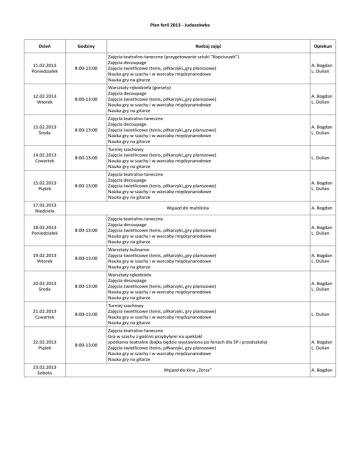 Plan ferii 2013 - Judaszówka Dzień Godziny Rodzaj zajęć Opiekun