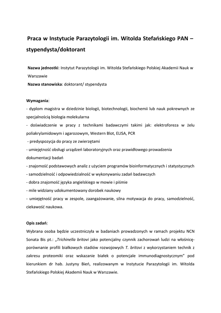 Praca w Instytucie Parazytologii im. Witolda Stefańskiego PAN – stypendysta/doktorant Nazwa jednostki: Instytut Parazytologii im. Witolda Stefańskiego Polskiej Akademii Nauk w Warszawie Nazwa stanowiska: doktorant/ stypendysta Wymagania: - dyplom magistra w dziedzinie biologii, biotechnologii, biochemii lub nauk pokrewnych ze specjalnością biologia molekularna - doświadczenie w pracy z technikami badawczymi takimi jak: elektroforeza w żelu poliakrylamidowym i agarozowym, Western Blot, ELISA, PCR - predyspozycja do pracy ze zwierzętami - umiejętność obsługi urządzeń laboratoryjnych oraz prawidłowego prowadzenia dokumentacji badań - znajomość podstawowych analiz z użyciem programów bioinformatycznych i statystycznych - samodzielność i odpowiedzialność w wykonywaniu zadań badawczych - dobra znajomość języka angielskiego w mowie i piśmie - mile widziany udokumentowany dorobek naukowy - umiejętność pracy w zespole, zaangażowanie, silna motywacja do pracy, samodzielność, ciekawość naukowa. Opis zadań: Wybrana osoba będzie uczestniczyła w badaniach prowadzonych w ramach projektu NCN Sonata Bis pt.: „Trichinella britovi jako potencjalny czynnik zachorowań ludzi na włośnicęporównanie profili białkowych stadiów rozwojowych T. britovi z wykorzystaniem technik z zakresu proteomiki oraz wskazanie białek o potencjale immunodiagnostycznym” pod kierunkiem dr hab. Justyny Bień, realizowanym w Instytucie Parazytologii im. Witolda Stefańskiego Polskiej Akademii Nauk w Warszawie. Zakres obowiązków stypendysty/doktoranta będzie obejmował pracę eksperymentalną, analizę otrzymanych wyników i przygotowanie ich w formie nadającej się do publikacji. Stypendysta/doktorant będzie miał za zadanie: uzyskiwanie materiału ekskrecyjnosekrecyjnego Trichinella britovi, przygotowywanie materiału białkowego do analiz, rozdział białek z wykorzystaniem technik SDS-PAGE; 2D, DIGE oraz Western Blot, analizę wyników uzyskanych przy użyciu spektrometrii mas i inne zadania powierzone przez kierownika projektu. Typ konkursu NCN: SONATA BIS – NZ Termin składania ofert: 22 lipca 2016, 00:00 Forma składania ofert: pocztą, e-mail Warunki zatrudnienia: Doktorant będzie zatrudniony w wymiarze średnio 35 godzin tygodniowo. Doktorant będzie otrzymywał stypendium w wysokości do 3000 PLN przez okres 36 miesięcy (wysokość wynagrodzenia będzie uzależniona od kwalifikacji kandydata oraz zakresu badań naukowych jakie będzie wykonywał w projekcie). Dodatkowe informacje: 1. Konkurs ma charakter otwarty. Procedura rekrutacji oraz wypłaty stypendium odbywają się na podstawie „Regulaminu przyznawania stypendiów naukowych dla młodych naukowców w projektach badawczych (…)” (Załącznik do uchwały Rady NCN50/2013 z dnia 3 czerwca 2013 r.) oraz Stanowiska Narodowego Centrum Nauki w sprawie stypendiów naukowych wypłacanych w projektach badawczych finansowanych przez NCN z dnia 16 października 2015 r. 2. Komisja konkursowa przeprowadzi z kandydatami rozmowy kwalifikacyjne, które odbędą się po zamknięciu terminu składania aplikacji. 3. Kandydaci będą informowani indywidualnie o wynikach pierwszego etapu rekrutacji oraz o terminie rozmów kwalifikacyjnych. Zgłoszenie na konkurs powinno zawierać: - list motywacyjny z uzasadnieniem zainteresowania uczestnictwem ww. projekcie (nie więcej niż 1 strona standardowego maszynopisu) - Curriculum Vitae kandydata z listą osiągnięć naukowych - kopię dyplomu potwierdzającego ukończenie studiów magisterskich (w przypadku osób bez tytułu, proszę o podanie szacunkowej daty egzaminu magisterskiego, nie później niż do końca lipca) - opinię promotora (list polecający) wraz z danymi kontaktowymi Zgłoszenia proszę przesyłać na adres email: [email protected] (dr hab. Justyna Bień) lub pocztą: Instytut Parazytologii im. Witolda Stefańskiego Polskiej Akademii Nauk, ul. Twarda 51/55; 00-818 Warszawa z dopiskiem „KONKURS Sonata Bis”.