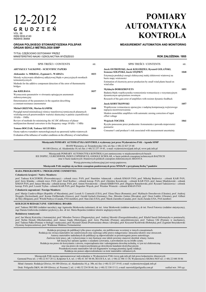 POMIARY AUTOMATYKA KONTROLA 12-2012 G R U D Z I E Ń VOL. 58 ISSN 0032-4140 INDEKS 36958 ORGAN POLSKIEGO STOWARZYSZENIA POLSPAR ORGAN SEKCJI METROLOGII SIMP MEASUREMENT AUTOMATION AND MONITORING TYTUŁ CZĘŚCIOWO DOTOWANY PRZEZ MINISTERSTWO NAUKI I SZKOLNICTWA WYŻSZEGO SPIS TREŚCI / CONTENTS ROK ZAŁOŻENIA: 1955 str. ARTYKUŁY NAUKOWE - SCIENTIFIC PAPERS Aleksander A. MIKHAL, Zygmunt L. WARSZA Metody wykrywania składowej addytywnej błędu w precyzyjnych mostkach termometrycznych Methods for the additive component detection of the error of thermometric bridges 1033 Jan KIEŁBASA Wyznaczenie parametrów w równaniu opisującym anemometr stałorezystancyjny Determination of the parameters in the equation describing a constant-resistance anemometer 1037 Michał GRZENIK, Marian KAMPIK Przegląd metod minimalizacji różnicy transferowej termicznych planarnych wielozłączowych przetworników wartości skutecznej w paśmie częstotliwości 10 kHz – 1MHz Review of methods for minimizing the AC-DC difference of planar multijunction thermal converters in the frequency range 10 kHz - 1 MHz 1040 Tomasz BOCZAR, Tadeusz SZCZYRBA Ocena wpływu warunków meteorologicznych na sprawność turbin wiatrowych Evaluation of the influence of weather conditions on the efficiency of wind turbines 1044 SPIS TREŚCI / CONTENTS str. Jacek OSTROWSKI, Jacek KOŁODZIEJ, Ryszard GOLAŃSKI, Ireneusz SOLIŃSKI, Jacek STĘPIEŃ Estymacja produkcji energii elektrycznej małej elektrowni wiatrowej na bazie mapy wietrzności Estimation of electricity power production by small wind plants based on wind atlas 1048 Mykhaylo DOROZHOVETS Badania błędu współczynnika wzmocnienia wzmacniaczy z rezystancyjnym dynamicznym sprzężeniem zwrotnym Research of the gain error of amplifiers with resistor dynamic-feedback 1053 Jacek KORYTKOWSKI Współczesne wzmacniacze operacyjne z nadążną kompensacją wejściowego napięcia niezrównoważenia Modern monolithic amplifiers with automatic zeroing correction of input offset voltage 1057 Wojciech TOCZEK Ryzyko ponoszone przez producenta i konsumenta z powodu niepewności pomiarów Consumer’s and producer’s risk associated with measurement uncertainty 1061 Miesięcznik POMIARY AUTOMATYKA KONTROLA wydawany jest przez Wydawnictwo PAK - Agenda SIMP 00-050 Warszawa, ul. Świętokrzyska 14A, tel./fax: (+48) 22 827 25 40 44-100 Gliwice, ul. Akademicka 10, tel./fax: (+48) 32 237 19 45, e-mail: [email protected], www.pak.info.pl Miesięcznik POMIARY AUTOMATYKA KONTROLA jest zamieszczony w międzynarodowych bazach: IEE INSPEC, ULRICHSWEB, INDEX COPERNICUS, GOOGLE SCHOLAR, w bazie polskich czasopism technicznych BAZTECH oraz w bazie naukowych i branżowych polskich czasopism elektronicznych ARIANTA Wersją pierwotną (referencyjną) jest wersja papierowa. Miesięcznik PAK znajduje się na liście czasopism punktowanych przez MNiSzW z przypisaną liczbą 7 punktów RADA PROGRAMOWA / PROGRAMME COMMITTEE: Członkowie krajowi / Native Members: prof. Tadeusz KACZOREK (Przewodniczący) - członek rzecz. PAN, prof. Stanisław Adamczak - członek KMiAN PAN, prof. Mikołaj Busłowicz - członek KAiR PAN, prof. Jerzy Klamka - członek rzecz. PAN, prof. Józef Korbicz - członek koresp. PAN, prof. Zdzisław Kowalczuk – członek KAiR PAN, prof. Janusz Mindykowski - członek KMiAN PAN, prof. Janusz Mroczka - członek koresp. PAN, prof. Antoni Nowakowski - członek KBiIB PAN, prof. Zbigniew Ranachowski, prof. Ryszard Tadeusiewicz - członek koresp. PAN, prof. Leszek Trybus - członek KAiR PAN, prof. Bogusław Więcek, prof. Wiesław Winiecki - członek KMiAN PAN Członkowie zagraniczni / Foreign Members: prof. Marija Cundeva-Blajer (Republic of Macedonia), prof. Leszek S. Czarnecki (USA), prof. Elena Diacu (Romania), prof. Mykhaylo Dorozhovets (Ukraine), prof. Andrzej Drygajlo (Switzerland), prof. Kostas Eleftheriadis (Greece), prof. Gerald Gerlach (Germany), Doc. Miroslav Gutten (Slovakia), prof. Orest Ivakhiv (Ukraine), prof. Gilbert de Mey (Belgium), prof. Witold Pedrycz (Canada, PAS member), prof. Stan Zak (USA), prof. Marek Zaremba (Canada), prof. Jacek Żurada (USA, PAS member) KOLEGIUM REDAKCYJNE / EDITORIAL BOARD: prof. Tadeusz SKUBIS (redaktor naczelny), mgr Agnieszka Skórkowska (sekretarz), dr inż. Artur Skórkowski (redaktor naukowy), dr inż. Paweł Fotowicz (redaktor statystyczny), mgr Danuta Grabowska (redaktor językowy), doc. dr inż. Maria Bojarska (redaktor tekstów anglojęzycznych) Redaktorzy tematyczni: prof. Jan Maciej Kościelny (Automatyka), prof. Mirosław Świercz (Diagnostyka), prof. Andrzej Sikorski (Energoelektronika), prof. Khalid Saeed (Informatyka w pomiarach), prof. Stefan Domek (Mechatronika), prof. Janusz Gajda (Metrologia), prof. Jerzy Pluciński (Pomiary optoelektroniczne), prof. Tadeusz Uhl (Pomiary w mechanice), prof. Tadeusz Pałko (Pomiary w biologii i medycynie), prof. Ryszard Choraś (Przetwarzanie obrazu i dźwięku), prof. Krzysztof Kozłowski (Robotyka), prof. Zygmunt Strzyżakowski (Systemy bezpieczeństwa), prof. Waldemar Minkina (Termometria) Redakcja przyjmuje do publikacji tylko prace oryginalne, nie publikowane wcześniej w innych czasopismach. Redakcja nie zwraca materiałów nie zamówionych oraz zastrzega sobie prawo redagowania i skracania tekstów oraz streszczeń. Autorzy materiałów nadesłanych do publikacji są odpowiedzialni za przestrzeganie prawa autorskiego. Zarówno treść pracy, jak i wykorzystane w niej ilustracje oraz tabele powinny stanowić dorobek własny Autora lub muszą być opisane zgodnie z zasadami cytowania, z powołaniem się na źródło cytatu. Redakcja ma prawo do korzystania z utworu, rozporządzania nim i udostępniania dowolną techniką, w tym też elektroniczną oraz ma prawo do rozpowszechniania go dowolnymi kanałami dystrybucyjnymi. Przedrukowywanie materiałów lub ich fragmentów wymaga pisemnej zgody redakcji. Redakcja nie ponosi odpowiedzialności za treść materiałów reklamowych. Miesięcznik PAK