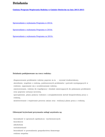 Działania Gminny Program Wspierania Rodziny w Gminie Oświecim na lata 2013-2015 Sprawozdanie z wykonania Programu w 2013r. Sprawozdanie z wykonania Programu w 2014r. Sprawozdanie z wykonania Programu za 2015r. Działania podejmowane na rzecz rodziny: diagnozowanie problemów rodziny poprzez m.in. – wywiad środowiskowy, określenie, wspólnie z rodziną, podstawowych problemów i potrzeb występujących w rodzinie, zapoznanie się z oczekiwaniami rodziny, zmotywowanie, rodziny do współpracy i działań zmierzających do pokonania problemów oraz poprawy sytuacji życiowej, sporządzenie, planu pomocy rodzinie z uwzględnieniem metod bezpośredniej pracy z rodziną, monitorowanie i wspieranie procesu zmian oraz realizacji planu pracy z rodziną. Głównymi kryteriami przyznania usługi asystenta są: bezradność w sprawach opiekuńczo –wychowawczych bezrobocie alkoholizm wielodzietność bezradność w prowadzeniu gospodarstwa domowego rodzina niepełna niepełnosprawność ubóstwo choroba psychiczna długotrwałą choroba przemoc W ramach wykonywanych obowiązków asystenci współpracują między innymi z instytucjami takimi jak: placówki oświatowe: szkoły, przedszkola, Specjalny Ośrodek Szkolno-Wychowawczy, służba zdrowia (Poradnia Zdrowia Psychicznego w Oświęcimiu, Oddział Psychiatryczny w Powiatowym Szpitalu w Oświęcimiu, Wiejski Ośrodek Zdrowia w Grojcu, Środowiskowy Zespół Wyjazdowy Psychiatryczny), Zespół Kurateli Sądowej, Świetlice terapeutyczne prowadzone przez Stowarzyszenie „Szansa”, Powiatowe Centrum Pomocy Rodzinie w Oświęcimiu, Powiatowy Ośrodek Interwencji Kryzysowej w Oświęcimiu, Centrum Psychoterapii „Sobrietas”, Środowiskowy Dom Samopomocy w Oświęcimiu, Klub Integracji Społecznej, Poradnia Psychologiczno – Pedagogiczna w Oświęcimiu, Gminna Komisja Rozwiązywania Problemów Alkoholowych. W ramach współpracy z rodziną, asystenci podejmowali działania: pomoc w sprzątaniu mieszkania i systematycznym utrzymywaniu porządku, wsparcie w drobnych pracach remontowych, trening higieniczny – kształtowanie prawidłowych nawyków dbania o zdrowie i higienę, monitorowanie sytuacji szkolnej dzieci rodzin objętych asystenturą, poprzez stały kontakt z wychowawcami, wspólne odrabianie zadań, domowych z dziećmi oraz pomoc w trudnościach szkolnych, organizacja konferencji rodzinnych, pomoc w aktywnym poszukiwaniu pracy (sporządzanie CV klientów, przekazywanie aktualnych ofert pracy, mobilizowanie do kontaktów z pracodawcami), pomoc w załatwianiu spraw urzędowych (m.in. wsparcie w pisaniu pozwu o ustanowienie alimentów, wniosku o rozwód, podwyższenie alimentów, czy prawne uregulowanie kontaktów z dziećmi), łagodzenie konfliktów wewnątrzrodzinnych, udzielanie wsparcia emocjonalnego klientom w trudnych sytuacjach życiowych, pomoc w znalezieniu rozwiązań kompromisowych sytuacji problemowych, kształtowanie u członków rodziny pozytywnej samooceny oraz wiary we własne możliwości i poczucia sprawstwa, pomoc w poszukiwaniu mieszkania, wzmocnienie kompetencji wychowawczych rodziców poprzez edukację w zakresie prawidłowych postaw rodzicielskich, stawiania wymogów, granic przy zastosowaniu odpowiedniego systemu kar i nagród, zacieśnianie więzi rodzinnych poprzez wspólne spędzanie czasu wolnego i rozwijanie zainteresowań dzieci (gry planszowe, zabawy z wykorzystaniem artykułów plastycznych), trening komunikacji interpersonalnej, trening budżetowy, poprawa funkcjonowania rodziny w środowisku lokalnym, wypracowanie prawidłowych wzorców funkcjonowania w rodzinie, pomoc w ustaleniu podziału obowiązków domowych i planu dnia, mobilizowanie do utrzymywania abstynencji, motywowanie do systematycznego leczenia psychiatrycznego (stosowanie się do zaleceń lekarzy, pozostawanie w stałym kontakcie z lekarzem prowadzącym), odpowiadanie na bieżące problemy rodziny, pozostawanie w stałym kontakcie z prowadzącym rodzinę pracownikiem socjalnym w celu bieżących konsultacji, wymiany informacji oraz planowania dalszej współpracy