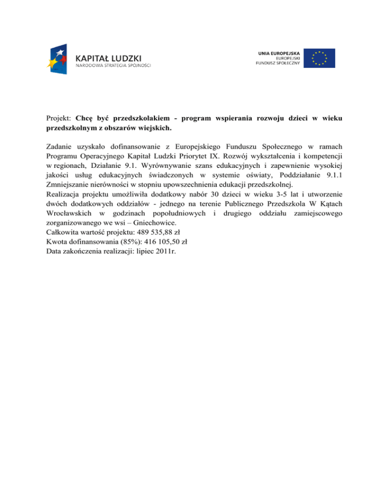 Projekt: Chcę być przedszkolakiem - program wspierania rozwoju dzieci w wieku przedszkolnym z obszarów wiejskich. Zadanie uzyskało dofinansowanie z Europejskiego Funduszu Społecznego w ramach Programu Operacyjnego Kapitał Ludzki Priorytet IX. Rozwój wykształcenia i kompetencji w regionach, Działanie 9.1. Wyrównywanie szans edukacyjnych i zapewnienie wysokiej jakości usług edukacyjnych świadczonych w systemie oświaty, Poddziałanie 9.1.1 Zmniejszanie nierówności w stopniu upowszechnienia edukacji przedszkolnej. Realizacja projektu umożliwiła dodatkowy nabór 30 dzieci w wieku 3-5 lat i utworzenie dwóch dodatkowych oddziałów - jednego na terenie Publicznego Przedszkola W Kątach Wrocławskich w godzinach popołudniowych i drugiego oddziału zamiejscowego zorganizowanego we wsi – Gniechowice. Całkowita wartość projektu: 489 535,88 zł Kwota dofinansowania (85%): 416 105,50 zł Data zakończenia realizacji: lipiec 2011r.
