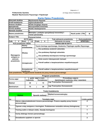 Załącznik nr 1 do Księgi Jakości Kształcenia Politechnika Opolska Wydział Wychowania Fizycznego i Fizjoterapii Karta Opisu Przedmiotu Kierunek studiów Profil kształcenia Poziom studiów Specjalność Forma studiów Semestr studiów Wychowanie fizyczne Ogólnoakademicki Studia drugiego stopnia Nauczycielsko-trenerska Studia niestacjonarne II Metodyka i praktyka specjalizacji trenerskiej ITrener personalny Nazwa przedmiotu Nauki podst. (T/N) N Subject Title Personal trainer ECTS (pkt.) Tryb zaliczenia przedmiotu Kod przedmiotu Całk. 4 Kont. 1,8 Prakt. 0 Zaliczenie na ocenę WFMT028-I Kod przedmiotu USOS WW/00-SM>W:StPrTI Nazwy Teorie treningu sportowego, Anatomia, Fizjologia wysiłku fizycznego przedmiotów 1. Zna podstawy anatomii człowieka 2. Zna podstawy fizjologii człowieka Wiedza Wymagania wstępne w zakresie przedmiotu 3. Zna podstawy teoretyczne treningu sportowego 1. Umie ocenic intensywność ćwiczeń Umiejętności 2. Potrafi zadbać o bezpieczeństwo współćwiczących … Kompetencje 1. Potrafi zadbać o bezpieczeństwo wspołćwiczących społeczne Cele przedmiotu: Przygotowanie studenta do pracy trenera personalnego Program przedmiotu Forma zajęć L. godz. zajęć w sem. Całkowita Kontaktowa Wykład 30 | 15 Seminarium 75 | 30 Prowadzący zajęcia (tytuł/stopień naukowy, imię i nazwisko) mgr Przemysław Domaszewski mgr Przemysław Domaszewski Treści kształcenia Wykład Lp. 1. Sposób realizacji Wykład konwersatoryjny Tematyka zajęć Zakres odpowiedzialności trenera personalnego. Prawne aspekty pracy trenera personalnego Liczba godzin 2 Typowe urazy związane z treningiem. Podstawowe narzedzia odnowy biologicznej 2 Trening osób w różnym wieku. Zasady treningowe 1 Cechy dobrego trenera personalnego. 2 Zarzadzanie ryzykiem w sporcie 2 2. 3. 4. 5. Podstawy oceny stanu zdrowia i wydolności sportowca 2 Typy budowy ciała. Wpływ budowy ciała na osiągnięcia sportowe 2 Trening funkcjonalny, stabilizujący i korekcyjny. Podstawy teoretyczne 2 6. 7. 8. L. godz. pracy własnej studenta 1. 2. 3. 4. 5. 6. 7. 8. 9. 10. 11. 12. 13. 14. 15. L. godz. kontaktowych w sem. Sposób realizacji Znaczenie stretchingu. Stretching statyczny i dynamiczny. Technika rwania. Praca bez obciążenia. Praca w grupach Technika rwania. Praca z obciążeniem 50% CM. Praca w parach. 2 Sprawdzian opanowania techniki ćwiczeń podstawowych. 1 Zasady pracy na maszynach. Ćwiczenia kształtujące siłę mm. nóg z wykorzystaniem maszyn. Technika, błędy. Praca w parach Ćwiczenia kształtujące siłę mm. grzbietu z wykorzystaniem maszyn. Technika, błędy. Praca w parach Ćwiczenia kształtujące siłę mm. klatki Th. z wykorzystaniem maszyn. Technika, błędy. Praca w parach 2 Ćwiczenia kształtujące siłę mm. górnej części pleców z wykorzystaniem maszyn. Technika, błędy. Praca w parach 2 Ćwiczenia kształtujące siłę mm.obręczy barkowej z wykorzystaniem maszyn. Technika, błędy. Praca w parachĆwiczenia kształtujące siłę mm.obręczy barkowej z wykorzystaniem maszyn. Technika, błędy. Praca w parach Ćwiczenia kształtujące siłę mm. ramion z wykorzystaniem maszyn. Technika, błędy. Praca w parach 2 Sprawdzian opanowania techniki ćwiczeń podstawowych oraz techniki ćwiczeń na maszynach 1 L. godz. pracy własnej studenta 45 L. godz. kontaktowych w sem. Efekty kształcenia dla przedmiotu - po zakończonym cyklu kształcenia Charakteryzuje wzorce zachowań prozdrowotnych oraz wyjaśnia funkcje sportu i rekreacji ruchowej w profilaktyce patologii społecznych 1. Wiedza 15 ćwiczenie w sali gimnastycznej, siłowni, ćw. praktyczne w terenie Tematyka zajęć Liczba godzin Zasady BHP na siłowni. Ocena podstawowych wzorców ruchowych (OHS). Ocena 4 składu ciała. Analiza wyników Seca. Inne metody oceny składu ciała. Znaczenie rozgrzewki. Martwy ciąg. Mięśnie pracujące w martwym ciągu. Rodzaje 2 DL. Technika. Praca w parach. Podstawowe błędy w DL. Praca na 50 % CM. Przysiady. Technika. Mięśnie pracujące. Praca nad techniką w parach . Praca na 50 2 % CM. Mobilność. Praca na tkankach miękkich. Technika zarzutu praca bez obciążenia. 2 Mięśnie pracujące. Technika zarzutu. Praca z obciążeniem 50% CM. Praca w parach. 2 Seminarium Lp. 15 2 2 2 2 30 Odniesienie do Formy realizacji Formy weryfikacji kierunkowych efektów (W, C, L, P, S) efektów kształcenia kształcenia K_W12 W,S C,D,I,P Wiedza Zna przyrządy, urządzenia dydaktyczne i podstawową aparaturę badawczą oraz zasady organizacyjne i przepisy BHP w zakresie prowadzonych doświadczeń i badań naukowych oraz zajęć sportowo2. rekreacyjnych Łączy postulaty działań edukacji zdrowotnej z samopromocją i wykorzystuje swoje kompetencje, zdolności i umiejętności sportowe do promowania aktywnych form 1. spędzania czasu wolnego Rozwija zainteresowania ruchowe, ukazując korzyści wynikające z aktywności fizycznej, w ramach profilaktyki wykluczenia i patologii 2. społecznej K_W13 W,S C,D,I,P K_U05 W,S C,D,I,P K_U14 W,S C,D,I,P Sprawnie prowadzi zajęcia ruchowe z zakresu różnorodnych form aktywności fizycznej i ocenia poziom sprawności i umiejętności; właściwie dobiera metody kształcenia motorycznego i umie dostosować styl kierowania pracą dydaktyczną do poziomu percepcji, dojrzałości i zdolności uczniów oraz uczestników zajęć ruchowych; posiada umiejętność kierowania zespołem sportowym podczas zawodów K_U15 W,S C,D,I,P W działaniach edukacyjnych przestrzega zasad nauczania wychowującego i ma świadomość związku zachodzącego pomiędzy postawą nauczyciela a stylem oddziaływania K_K07 W,S C,D,I,P Stale rozwija sprawność fizyczną, stosując różnorodne bodźce ruchowe; aktywnie uczestniczy w zajęciach ruchowych i prezentuje 2. zdrowy styl życia K_K12 W,S C,D,I,P Umiejętności 3. Kompetencje społeczne 1. Formy weryfikacji efektów kształcenia: A-egzamin pisemny, B-egzamin ustny, C-zaliczenie pisemne, D-zaliczenie ustne, E-na podstawie ocen cząstkowyc