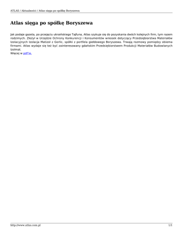 ATLAS / Aktualności / Atlas sięga po spółkę Boryszewa Atlas sięga po spółkę Boryszewa Jak podaje gazeta, po przejęciu ukraińskiego Tajfuna, Atlas szykuje się do pozyskania dwóch kolejnych firm, tym razem rodzimych. Złożył w Urzędzie Ochrony Konkurencji i Konsumentów wniosek dotyczący Przedsiębiorstwa Materiałów Izolacyjnych Izolacja Matizol z Gorlic, spółki z portfela giełdowego Boryszewa. Trwają rozmowy pomiędzy obiema firmami. Atlas wydaje się też być zainteresowany gdańskim Przedsiębiorstwem Produkcji Materiałów Budowlanych Izolmat. Więcej w pdf’ie. http://www.atlas.com.pl 1/1