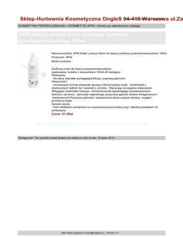 Utworzono: piątek, 27 maj 2016 Sklep-Hurtownia Kosmetyczna OngleS 04-419 Warszawa ul.Za KOSMETYKA PROFESJONALNA > KOSMETYKI APIS > Kremy po zakończeniu zabiegu APiS Dotyk Luksusu Krem do twarzy szafirowy przeciwzmarszczkowy 100ml Nazwa produktu: APiS Dotyk Luksusu Krem do twarzy szafirowy przeciwzmarszczkowy 100ml Producent: APIS Model produktu: Szafirowy krem do twarzy przeciwzmarszczkowy opakowanie: butelka z dozownikiem 100ml-45 zabiegow Wskazania: - dla skory dojrzałej wymagającej liftingu i poprawy jędrności Właściwości: - innowacyjna formuła preparatu łącząca mikronizowany szafir, krioekstrakt z artyktycznych dzikich roż i ekstrakt z orchidei. Wykazując szczegolne właściwości liftingujące doskonale redukuje mikrozmarszczki zapobiegając przedwczesnemu starzeniu się skory; stymuluje regenerację ,przywraca gęstość włokien kolagenowych i elastynowych.Przywraca jędrność i elastyczność-skora zyskuje młodszy wygląd i promienny blask. Sposob użycia: - krem delikatnie wmasować na oczyszczoną skorę twarzy,szyi i dekoltu;pozostawić do wchłonięcia Cena: 41.00zł Dostępność: Ten produkt został dodany do sklepu w dniu środa, 18 lipiec 2012 http://www.ongles.pl | [email protected] | | Strona 1/1