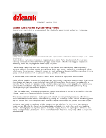 PUŁAWY 7 kwietnia 2008 Łacha wiślana ma być perełką Puław Brudne bajoro zamieni się w uroczy zakątek dla miłośników spacerów nad wodą oraz... kajakarzy. Łacha wiślana (czyli jej dawne starorzecze) zaczyna się w pobliŜu cmentarza włostowickiego. (Fot.: Paweł Buczkowski) Będzie to takŜe wymarzone miejsce do rozpoczęcia zwiedzania Parku Czartoryskich. Mowa o łasze wiślanej, która została właśnie formalnie przejęta przez miasto. A to otwiera drogę do rozpoczęcia inwestycji, która ma przyciągać do Puław więcej turystów. - Na tą chwilę czekaliśmy wiele lat - przyznaje Janusz Grobel, prezydent Puław. Władzom miasta wreszcie udało się formalnie przejąć łachę wiślaną, do tej pory jedno z najbardziej zaniedbanych miejsc w Puławach. Dotychczasowy właściciel, którym był Instytut Uprawy NawoŜenia i Gleboznawstwa otrzymał zgodę od władz państwowych na uŜyczenie miastu gruntów na 20 lat. W poniedziałek przedstawiciele instytutu i władz Puław podpisali w tej sprawie porozumienie. Łacha wiślana (czyli jej dawne starorzecze) zaczyna się w pobliŜu cmentarza włostowickiego. Stąd ciągnie się mijając znajdującą się na wzniesieniu Świątynię Sybilli oraz Pałac Czartoryskich i podąŜa dalej w kierunku Wisły. Jednak aby połączyć rzekę z łachą bardzo wąski kanał naleŜy pogłębić. Po zrealizowaniu tych prac kajakarz będzie mógł dopłynąć od Wisły aŜ do samego podnóŜa osady pałacowej. Tutaj zacumuje swój kajak i pospaceruje po parku. - Cały kompleks wraz z utworzeniem muzeum z prawdziwego zdarzenia pozwoli promować turystycznie Puławy - uwaŜa prof. Seweryn Kukuła, dyrektor IUNG. Wraz z oczyszczeniem dna łachy i budową nowych ścieŜek rowerowych i alejek zostaną odbudowane dawne charakterystyczne mostki, które spinały jej brzegi. Na realizację zadania władze miasta dają sobie pięć lat. W tym roku oraz następnym będą prowadzone prace archeologiczne, potem powstanie projekt. Realizacja prac będzie prowadzona w kilku etapach i ma się zakończyć w 2013 roku. Wszystko ma kosztować ok. 30 milionów złotych, a pieniądze będą pochodzić m.in. ze środków unijnych i budŜetu miasta. - Zewsząd pojawia się wiele głosów, Ŝe turyści omijają Puławy. To będzie jeden z kroków, aby ofertę naszego miasta uatrakcyjnić - mówi poseł Włodzimierz Karpiński, który wziął udział w podpisaniu porozumienia.