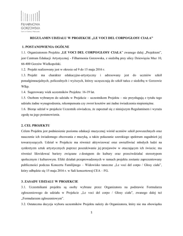 REGULAMIN UDZIAŁU W PROJEKCIE „LE VOCI DEL CORPO/GŁOSY CIAŁA” 1. POSTANOWIENIA OGÓLNE 1.1. Organizatorem Projektu „LE VOCI DEL CORPO/GŁOSY CIAŁA” zwanego dalej „Projektem”, jest Centrum Edukacji Artystycznej - Filharmonia Gorzowska, z siedzibą przy ulicy Dziewięciu Muz 10, 66-400 Gorzów Wielkopolski. 1.2. Projekt realizowany jest w okresie od 9 do 15 maja 2016 r. 1.3. Projekt ma charakter edukacyjno-artystyczny i adresowany jest do uczniów szkół ponadgimnazjalnych, policealnych i wyższych, którzy uczęszczają do szkół tańca z siedzibą w Gorzowie Wlkp. 1.4. Sugerowany wiek uczestników Projektu: 16-19 lat. 1.5. Osobom wybranym do udziału w Projekcie – uczestnikom Projektu – nie przysługują z tytułu tego udziału żadne wynagrodzenia, rekompensata czy zwrot kosztów ani żadne świadczenia niepieniężne. 1.6. Biorąc udział w projekcie Uczestnik oświadcza, że zapoznał się z niniejszym Regulaminem i wyraża zgodę na jego postanowienia. 2. CEL PROJEKTU Celem Projektu jest podniesienie poziomu edukacji muzycznej wśród uczniów szkół powszechnych oraz nauczenie ich świadomego obcowania z muzyką, a także pokazanie szerokiego spektrum zagadnień jej towarzyszących. Udział w Projekcie ma również aktywizować oraz uwrażliwiać młodych ludzi na synkretyzm sztuk artystycznych poprzez poszukiwanie jej przejawów w otaczającym ich świecie; ma również likwidować bariery związane z dostępem do kultury oraz przeciwdziałać stereotypom społecznym i kulturowym. Efekt działań przeprowadzonych w ramach projektu zostanie zaprezentowany publiczności podczas Koncertu Familijnego – Widowisko taneczne „Le voci del corpo / Głosy ciała”, który odbędzie się 15 maja 2016 r. w Sali koncertowej CEA – FG. 3. ZASADY UDZIAŁU W PROJEKCIE 3.1. Uczestnikami projektu są osoby wybrane przez Organizatora na podstawie Formularza zgłoszeniowego do udziału w Projekcie „Le voci del corpo / Głosy ciała”, zwanego dalej też „Formularzem zgłoszeniowym”. 3.2. Ostateczna decyzja wyboru uczestników Projektu należy do Organizatora, który nie ma obowiązku 1 (konieczności) podawania uzasadnienia dokonanego wyboru. 3.3. Warunkiem udziału w Projekcie jest przekazanie Organizatorowi wypełnionego Formularza zgłoszeniowego, według wzoru stanowiącego załącznik nr 1 do niniejszego Regulaminu. 3.4. Uczestnikami projektu mogą być wyłącznie osoby fizyczne, mające miejsce zamieszkania na terytorium Rzeczpospolitej Polskiej oraz posiadające co najmniej ograniczoną zdolność do czynności prawnych. 3.5. Osoby, które nie ukończyły 18 roku życia, mogą brać udział w projekcie jedynie za zgodą swoich przedstawicieli ustawowych (rodzica lub opiekuna prawnego), którzy składają dodatkowo Oświadczenie o wyrażeniu zgody na udział dziecka w Projekcie, według wzoru stanowiącego załącznik nr 2 do niniejszego Regulaminu. 3.6. Harmonogram realizacji Projektu: - 14 marca – 7 kwietnia (czwartek) 2016 r. – składanie Formularzy zgłoszeniowych, - 8 kwietnia (piątek) 2016 r. – wyłonienie grupy uczestników Projektu, - 9–13 maja 2016 r., w godzinach popołudniowych (17.00-20.00) , Sala kameralna FG – warsztaty taneczne z Magdą Grabowską-Wacławek i Liwią Bargieł, - 14 maja (sobota) 2016r., godziny do ustalenia, Sala koncertowa FG – próba generalna przed Koncertem Familijnym – Widowisko taneczne „Le voci del corpo / Głosy ciała”, - 15 maja (niedziela) 2016r., godz. 12.00, Sala koncertowa FG – Koncert Familijny – Widowisko taneczne „Le voci del corpo / Głosy ciała”. 3.7. Materiały niezbędne do realizacji warsztatów i koncertu zapewnia Organizator. Na prośbę Organizatora i zgodnie z jego wytycznymi uczestnicy Projektu zobowiązują się do zapewnienia we własnym zakresie wybranych elementów kostiumu scenicznego, w tym m.in. obuwia tanecznego. 3.8. Organizator zastrzega sobie prawo do wykluczenia z udziału w Projekcie tych osób, które nie przestrzegają postanowień Regulaminu lub nie stosują się do zaleceń oraz informacji podawanych przez Organizatora. 3.9. Organizator nie ponosi odpowiedzialności za ewentualne straty materialne uczestników Projektu. 4. PRAWA WŁASNOŚCI INTELEKTUALNEJ 4.1. Uczestnik Projektu potwierdza, iż wartość promocyjna związana z jego udziałem w Projekcie, wykorzystaniem przez Organizatora wizerunku („Wizerunek”), zdjęć („Zdjęcie”) lub nagrania 2 („Nagranie”) uczestnika Projektu w zakresie określonym niniejszym Regulaminem stanowi należyte wynagrodzenie za udział w Projekcie oraz z tytułu przeniesienia praw i udzielenia zgód na mocy niniejszego Regulaminu. 4.2. Uczestnik Projektu wyraża zgodę na wykorzystanie przez Organizatora Wizerunku, Zdjęcia oraz Nagrania uczestnika Projektu utrwalonych w każdym momencie jego prezentacji tanecznej podczas realizacji całego Projektu i przenosi na Organizatora w zakresie nieograniczonym czasowo i terytorialnie wszelkie prawa do korzystania i rozporządzania Wizerunkiem, Zdjęciem oraz Nagraniem podczas realizacji całego Projektu i po jego zakończeniu. Powyższe prawa przechodzą na Organizatora z chwilą dokonania zgłoszenia do udziału w Projekcie. 4.3. Organizator jest uprawniony do dokonywania zmian, przeróbek, montażu, skrótów, zwiastunów, fragmentaryzacji, przemontowywania, ekstrakcji poszczególnych elementów Wizerunku, łączenia, opracowywania do form multimedialnych, w tym w szczególności obiektów multimedialnych przystosowanych do wykorzystania w zakresie określonym niniejszym Regulaminem (wszystkie opracowania wskazane w niniejszym punkcie Regulaminu zwane dalej będą „Opracowaniami”). 4.4. Z chwilą dokonania zgłoszenia do udziału w Projekcie przez Uczestnika Projektu Organizator nabywa, bez odrębnej odpłatności, całość praw majątkowych do Wizerunku, Zdjęcia, Nagrania (majątkowe praca pokrewne) oraz Opracowań na następujących polach eksploatacji: a) utrwala