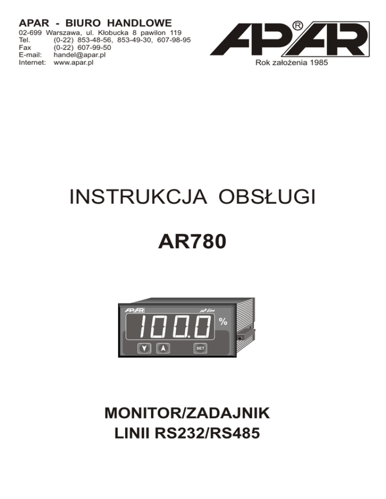 APAR - BIURO HANDLOWE R 02-699 Warszawa, ul. K³obucka 8 pawilon 119 Tel. (0-22) 853-48-56, 853-49-30, 607-98-95 Fax (0-22) 607-99-50 E-mail: [email protected] Internet: www.apar.pl Rok za³o¿enia 1985 INSTRUKCJA OBS£UGI AR780 % SET MONITOR/ZADAJNIK LINII RS232/RS485 SPIS TREŒCI 1. ZASADY BEZPIECZEÑSTWA.......................................................................... 2 2. ZALECENIA MONTA¯OWE............................................................................. 2 3. OGÓLNA CHARAKTERYSTYKA AR780...................................................... 3 4. DANE TECHNICZNE....................................................................................... 3 5. OBUDOWA I SPOSÓB MONTA¯U............................................................... 3 6. OPIS LISTWY ZACISKOWEJ......................................................................... 3 7. FUNKCJE PRZYCISKÓW................................................................................ 4 8. START/STOP TRANSMISJI............................................................................. 4 9. PODGL¥D PARAMETRÓW............................................................................ 4 10. PROGRAMOWANIE PARAMETRÓW KONFIGURACJI............................... 4 11. LISTA KOMUNIKATÓW I B£ÊDÓW................................................................ 5 12. INTERFEJS KOMUNIKACYJNY RS485 (wg EIA RS-485)...............................6 13. INTERFEJS KOMUNIKACYJNY RS232C (wg EIA RS-232C)......................... 6 14. PROTOKÓ£ TRANSMISJI SZEREGOWEJ MODBUS - RTU....................... 6 15. NOTATKI W£ASNE........................................................................................... 7 -2- 1. ZASADY BEZPIECZEÑSTWA n przed rozpoczêciem u¿ytkowania urz¹dzenia nale¿y dok³adnie przeczytaæ niniejsz¹ instrukcjê, n w celu unikniêcia uszkodzenia urz¹dzenia, przed w³¹czeniem zasilania nale¿y upewniæ siê, ¿e wszystkie przewody zosta³y pod³¹czone prawid³owo, n zapewniæ w³aœciwe warunki pracy, zgodne ze specyfikacj¹ urz¹dzenia (napiêcie zasilania, wilgotnoœæ, temperatura), n w celu unikniêcia pora¿enia pr¹dem elektrycznym, przed dokonaniem wszelkich modyfikacji przy³¹czeñ przewodów nale¿y wy³¹czyæ napiêcia doprowadzone do urz¹dzenia. 2. ZALECENIA MONTA¯OWE Pomimo tego, i¿ przyrz¹d by³ zaprojektowany tak, aby sprostaæ trudnym warunkom, które mog¹ wyst¹piæ w przewidzianych œrodowiskach pracy, zaleca siê stosowanie nastêpuj¹cych œrodków ostro¿noœci : n nie zasilaæ przyrz¹du z tych samych linii co urz¹dzenia wysokiej mocy bez odpowiednich filtrów sieciowych, n stosowaæ ekranowanie przewodów zasilaj¹cych i sygna³owych, przy czym uziemienie ekranu powinno byæ jednostronne wykonane jak najbli¿ej przyrz¹du, n unikaæ prowadzenia przewodów sygna³owych w bezpoœrednim s¹siedztwie i równolegle do przewodów energetycznych i zasilaj¹cych, n skrêcaæ parami przewody sygna³owe, n unikaæ bliskoœci urz¹dzeñ zdalnie sterowanych, mierników elektromagnetycznych, obci¹¿eñ wysokiej mocy, obci¹¿eñ z fazow¹ lub grupow¹ regulacj¹ mocy oraz innych urz¹dzeñ wytwarzaj¹cych du¿e zak³ócenia impulsowe. - 3- 3 . OGÓLNA CHARAKTERYSTYKA AR780. n n n n n n n n n n n przyrz¹d s³u¿y do komunikacji szeregowej z urz¹dzeniami pod³¹czonymi do linii RS485/RS232 protokó³ transmisji zgodny z MODBUS-RTU (master) wspó³pracuje z urz¹dzeniami serii uPLine i innymi zdalny (do 1000m dla RS485) odczyt/zapis parametrów oraz wartoœci mierzonych z urz¹dzeñ typu slave przydatny do sprawdzenie poprawnoœci dzia³ania sieci RS485 obudowa tablicowa 96 x 48 x 72 mm odczyt cyfrowy czerwony z regulacj¹ jasnoœci œwiecenia dostêp do parametrów konfiguracyjnych chroniony has³em programowanie z klawiatury foliowej 3-przyciskowej IP54 w zestawie folia przylepna z podstawowymi jednostkami miar opcjonalnie: - otwierana przeŸroczysta pokrywa ochronna AR963 (IP54) 4. DANE TECHNICZNE Rodzaj wyjœæ i format ramki - RS485 lub RS232, 8 bitów, 1 bit stopu, bez bitu parzystoœci Protokó³ transmisji - zgodny z MODBUS-RTU w trybie MASTER Odczyt cyfrowy LED (standard 4 cyfry) - zakres wskazañ .........................................................-1999÷9999 - wysokoœæ cyfr ............................................................20 mm Zasilanie ............... sieciowe ........................................... 220V~ (85÷260 V~) / 3VA ............... niskonapiêciowe ............................... 24V~ (15÷50 V~)/ 3VA , 24V= (18÷72 V=) / 3W Zakres temperatur pracy ................................................ 0 ÷ 50 °C Zakres wilgotnoœci wzglêdnej ....................................... 0 ÷ 90 % (bez kondensacji) 5. OBUDOWA I SPOSÓB MONTA¯U. Tablicowa INCABOX......... 01.109L057 Wymiary obudowy ........... 96 x 48 x 72 mm Pokrywa ochronna IP54... AR963 (opcja) 9 Materia³ ............. samogasn¹cy NORYL 94V-0 Okno tablicy ..... 92 x 44 mm Mocowanie ....... uchwytami z boku obudowy 63 14 44 AR963 WIDOK Z BOKU 6. OPIS LISTWY ZACISKOWEJ. RS485 RS232 GND +RS RxD - RS TxD Rozmieszczenie i numeracja z³¹cz Zasilanie 15 16 Uzas 15 16 Uzas - 230V~ (85÷260 V~).........15-16 lub Uzas - 24V~, 24V= (18÷72 V=)...15-16 -4- 7. FUNKCJE PRZYCISKÓW. Monitor posiada 3 przyciski, których znaczenie jest nastêpuj¹ce: t - przewijanie nazw parametrów w ty³ s - przewijanie nazw parametrów w przód SET + t - zmniejszenie wartoœci parametru konfiguracyjnego SET + s - zwiêkszenie wartoœci parametru konfiguracyjnego SET - podgl¹d wartoœci parametru (w trybie konfiguracji parametrów) - start transmisji (z trybu gotowoœci) t + s - szybki powrót do trybu gotowoœci (tryb domyœlny, z komunikatem "StoP") - stop transmisji - przy czasie przytrzymania wiêkszym ni¿ 3 s - wejœcie w tryb wprowadzania has³a - wyjœcie z trybu konfiguracji parametrów 8. START/STOP TRANSMISJI Przed 1-szym uruchomieniem transmisji nale¿y sprawdziæ poprawnoœæ