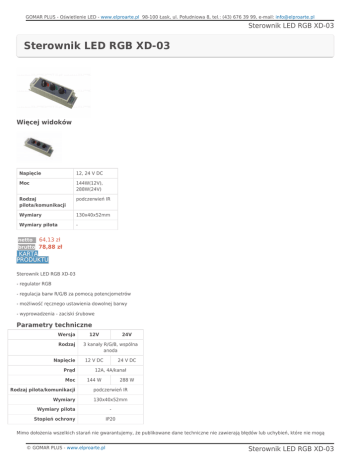 GOMAR PLUS - Oświetlenie LED - www.elproarte.pl 98-100 Łask, ul. Południowa 8, tel.: (43) 676 39 99, e-mail: [email protected] Sterownik LED RGB XD-03 Sterownik LED RGB XD-03 Więcej widoków Napięcie 12, 24 V DC Moc 144W(12V), 288W(24V) Rodzaj pilota/komunikacji podczerwień IR Wymiary 130x40x52mm Wymiary pilota - netto 64,13 zł brutto 78,88 zł KARTA PRODUKTU Sterownik LED RGB XD-03 - regulator RGB - regulacja barw R/G/B za pomocą potencjometrów - możliwość ręcznego ustawienia dowolnej barwy - wyprowadzenia - zaciski śrubowe Parametry techniczne Wersja Rodzaj Napięcie Prąd Moc 12V 24V 3 kanały R/G/B, wspólna anoda 12 V DC 24 V DC 12A, 4A/kanał 144 W 288 W Rodzaj pilota/komunikacji podczerwień IR Wymiary 130x40x52mm Wymiary pilota Stopień ochrony IP20 Mimo dołożenia wszelkich starań nie gwarantujemy, że publikowane dane techniczne nie zawierają błędów lub uchybień, które nie mogą © GOMAR PLUS - www.elproarte.pl Sterownik LED RGB XD-03 GOMAR PLUS - Oświetlenie LED - www.elproarte.pl 98-100 Łask, ul. Południowa 8, tel.: (43) 676 39 99, e-mail: [email protected] Sterownik LED RGB XD-03 jednak być podstawą do jakichkolwiek roszczeń. Zdjęcia i rysunki zawarte w katalogu mają charakter poglądowy i mogą różnić się od rzeczywistego wyglądu przedmiotu. Ta strona wymaga do działania plików cookie. Więcej informacji na temat danych zapisanych w cookie można znaleźć na stronie polityki prywatności . Aby zaakceptować cookie z tej witryny, proszę kliknąć poniższy przycisk 'Zezwól'. Zezwól © GOMAR PLUS - www.elproarte.pl Sterownik LED RGB XD-03