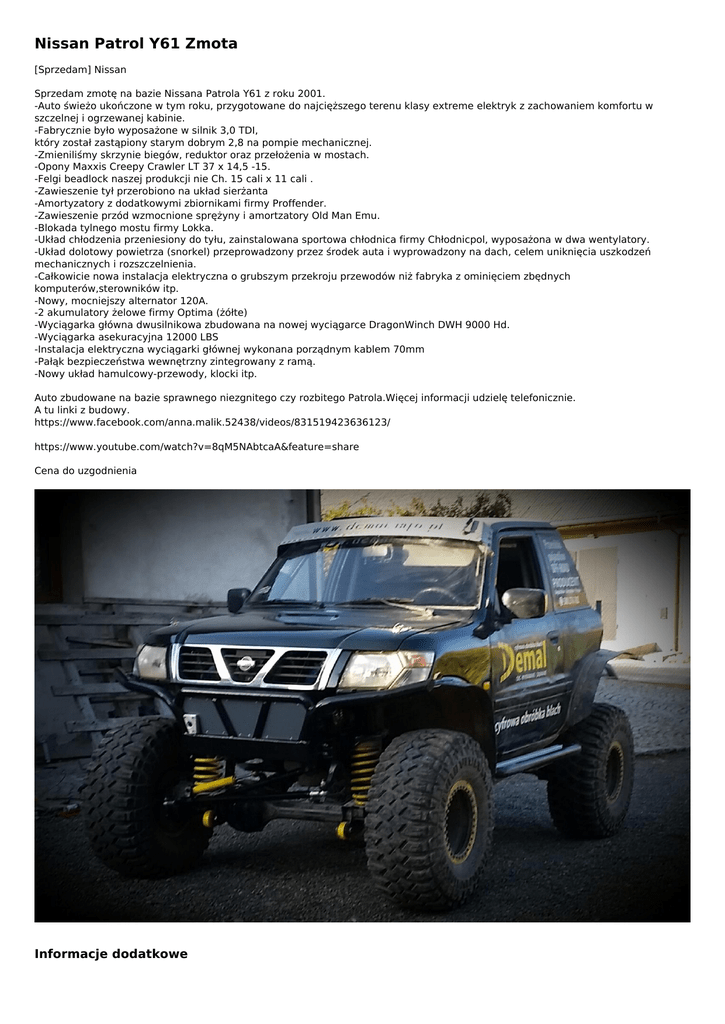 Nissan Patrol Y61 Zmota [Sprzedam] Nissan Sprzedam zmotę na bazie Nissana Patrola Y61 z roku 2001. -Auto świeżo ukończone w tym roku, przygotowane do najcięższego terenu klasy extreme elektryk z zachowaniem komfortu w szczelnej i ogrzewanej kabinie. -Fabrycznie było wyposażone w silnik 3,0 TDI, który został zastąpiony starym dobrym 2,8 na pompie mechanicznej. -Zmieniliśmy skrzynie biegów, reduktor oraz przełożenia w mostach. -Opony Maxxis Creepy Crawler LT 37 x 14,5 -15. -Felgi beadlock naszej produkcji nie Ch. 15 cali x 11 cali . -Zawieszenie tył przerobiono na układ sierżanta -Amortyzatory z dodatkowymi zbiornikami firmy Proffender. -Zawieszenie przód wzmocnione sprężyny i amortzatory Old Man Emu. -Blokada tylnego mostu firmy Lokka. -Układ chłodzenia przeniesiony do tyłu, zainstalowana sportowa chłodnica firmy Chłodnicpol, wyposażona w dwa wentylatory. -Układ dolotowy powietrza (snorkel) przeprowadzony przez środek auta i wyprowadzony na dach, celem uniknięcia uszkodzeń mechanicznych i rozszczelnienia. -Całkowicie nowa instalacja elektryczna o grubszym przekroju przewodów niż fabryka z ominięciem zbędnych komputerów,sterowników itp. -Nowy, mocniejszy alternator 120A. -2 akumulatory żelowe firmy Optima (żółte) -Wyciągarka główna dwusilnikowa zbudowana na nowej wyciągarce DragonWinch DWH 9000 Hd. -Wyciągarka asekuracyjna 12000 LBS -Instalacja elektryczna wyciągarki głównej wykonana porządnym kablem 70mm -Pałąk bezpieczeństwa wewnętrzny zintegrowany z ramą. -Nowy układ hamulcowy-przewody, klocki itp. Auto zbudowane na bazie sprawnego niezgnitego czy rozbitego Patrola.Więcej informacji udzielę telefonicznie. A tu linki z budowy. https://www.facebook.com/anna.malik.52438/videos/831519423636123/ https://www.youtube.com/watch?v=8qM5NAbtcaA&feature=share Cena do uzgodnienia Informacje dodatkowe Rok produkcji | Adres ogłoszenia http://ogloszenia4x4.pl/nissan-patrol-y61-zmota,o252 Kontakt Mail: [email protected] Telefon: 508276702 Lokalizacja Dębowiec, Dębowiec Śląskie () Ogłoszenie dodano: 2016-02-25 09:00:10 Ogłoszenie wygasa: 2017-02-24 09:00:10 Powered by TCPDF (www.tcpdf.org)