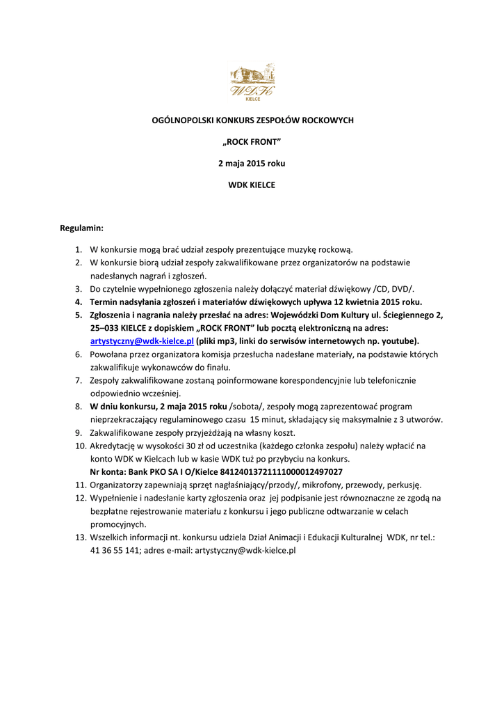 OGÓLNOPOLSKI KONKURS ZESPOŁÓW ROCKOWYCH „ROCK FRONT” 2 maja 2015 roku WDK KIELCE Regulamin: 1. W konkursie mogą brać udział zespoły prezentujące muzykę rockową. 2. W konkursie biorą udział zespoły zakwalifikowane przez organizatorów na podstawie nadesłanych nagrań i zgłoszeń. 3. Do czytelnie wypełnionego zgłoszenia należy dołączyć materiał dźwiękowy /CD, DVD/. 4. Termin nadsyłania zgłoszeń i materiałów dźwiękowych upływa 12 kwietnia 2015 roku. 5. Zgłoszenia i nagrania należy przesłać na adres: Wojewódzki Dom Kultury ul. Ściegiennego 2, 25–033 KIELCE z dopiskiem „ROCK FRONT” lub pocztą elektroniczną na adres: [email protected] (pliki mp3, linki do serwisów internetowych np. youtube). 6. Powołana przez organizatora komisja przesłucha nadesłane materiały, na podstawie których zakwalifikuje wykonawców do finału. 7. Zespoły zakwalifikowane zostaną poinformowane korespondencyjnie lub telefonicznie odpowiednio wcześniej. 8. W dniu konkursu, 2 maja 2015 roku /sobota/, zespoły mogą zaprezentować program nieprzekraczający regulaminowego czasu 15 minut, składający się maksymalnie z 3 utworów. 9. Zakwalifikowane zespoły przyjeżdżają na własny koszt. 10. Akredytację w wysokości 30 zł od uczestnika (każdego członka zespołu) należy wpłacić na konto WDK w Kielcach lub w kasie WDK tuż po przybyciu na konkurs. Nr konta: Bank PKO SA I O/Kielce 84124013721111000012497027 11. Organizatorzy zapewniają sprzęt nagłaśniający/przody/, mikrofony, przewody, perkusję. 12. Wypełnienie i nadesłanie karty zgłoszenia oraz jej podpisanie jest równoznaczne ze zgodą na bezpłatne rejestrowanie materiału z konkursu i jego publiczne odtwarzanie w celach promocyjnych. 13. Wszelkich informacji nt. konkursu udziela Dział Animacji i Edukacji Kulturalnej WDK, nr tel.: 41 36 55 141; adres e-mail: [email protected]