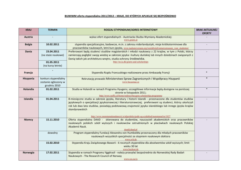 BUWIWM oferta stypendialna 2011/2012 – KRAJE, DO KTÓRYCH APLIKUJE SIĘ BEZPOŚREDNIO KRAJ TERMIN RODZAJ STYPENDIUM/ADRES INTERNETOWY Austria - wykaz ofert stypendialnych - Austriacka Służba Wymiany Akademickiej: BRAK AKTUALNEJ OFERTY - www.grants.at Belgia 10.02.2011 Dania 23.04.2011 (na staże naukowe) 01.05.2011 (na kursy letnie) Francja Hiszpania - stypendia specjalizacyjne, badawcze, m.in. z zakresu niderlandystyki, misje krótkoterminowe dla pracowników naukowych, letni kurs języka, www.taalunieversum.org/wereldwijd/zomercursussen_voor_studenten/ Preferowani będą studenci studiów magisterskich i młodzi naukowcy z 22 krajów, w tym z Polski, którzy zamierzają pogłębić swoją wiedzę w zakresie języka i kultury duńskiej lub innych dziedzinach związanych z Danią takich jak architektura wnętrz, studia ochrony środowiska. - http://en.iu.dk/grants-and-scholarships Stypendia Rządu Francuskiego realizowane przez Ambasadę Francji * Rekrutację prowadzi Ministerstwo Spraw Zagranicznych i Współpracy Hiszpanii * Holandia konkurs stypendialny zostanie ogłoszony w grudniu 2010 01.02.2011 Islandia 01.04.2011 8-miesięczne studia w zakresie języka, literatury i historii Islandii - przeznaczone dla studentów studiów językowych o specjalizacji językoznawczej i literaturoznawczej; preferowani są studenci, którzy ukończyli rok lub dwa lata studiów, posiadają podstawową znajomość języka islandzkiego lub innego języka krajów skandynawskich Niemcy 15.11.2010 Oferta stypendialna DAAD - skierowana do studentów, nauczycieli akademickich oraz pracowników naukowych polskich szkół wyższych i naukowców zatrudnionych w placówkach naukowych Polskiej Akademii Nauk. dowolny Program stypendialny Fundacji Alexandra von Humboldta przeznaczony dla młodych pracowników naukowych wszystkich specjalności ze stopniem naukowym doktora 15.02.2010 Stypendia Kraju Związkowego Bawarii - 6 rocznych stypendiów dla absolwentów szkół wyższych; limit wieku 30 lat www.becasmae.es Studia w Holandii w ramach Programu Hyugens; szczegółowe informacje będą dostępne na poniższej stronie w listopadzie 2011; * http://www.nuffic.nl/home/redirect/huygens-scholarship-programme - http://www.menntamalaraduneyti.is/afgreidsla/sjodir-og-eydublod/menntamal/nr/1827 - [email protected] www.avh.de. www.bayhost.de Norwegia 17.02.2011 Stypendia w ramach Programu Yggdrasil - należy przesyłać bezpośrednio do Norweskiej Rady Badań Naukowych - The Research Council of Norway www.rcn.no/is - 01.02.2011 Letni kurs języka norweskiego na Uniwersytecie w Oslo www.uio.no/iss Meksyk 30.11.2011 programy specjalne skierowane do badaczy i wykładowców uniwersyteckich, jak również dla tych, którzy chcą odbyć praktyki zawodowe lub rezydencje artystyczne - [email protected] Portugalia - stypendia naukowe za pośrednictwem Instytutu Camoesa dla polskich studentów, pracowników naukowych oraz nauczycieli akademickich, zajmujących się językiem i kulturą portugalską. Szwecja - Informacje dostępne są na stronie Instytutu Szwedzkiego - www.instituto-camoes.pt www.si.se *