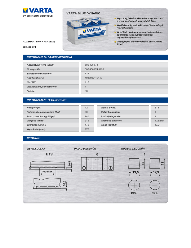 VARTA BLUE DYNAMIC Wysokiej jakości akumulator sprawdza si ę w samochodach wszystkich klas Wydłużona żywotność dzięki technologii PowerFrame® W tej linii dostępne również akumulatory spełniające specyficzne wymogi pojazdów azjatyckich ALTERNATYWNY TYP (ETN) Dostępny w pojemnościach od 40 Ah do 95 Ah 580 406 074 INFORMACJA ZAMÓWIENIOWA Alternatywny typ (ETN): 580 406 074 Nr artykułlu: 580 406 074 313 2 Skrótowe oznaczenie: F17 Kod kreskowy: 4016987119440 Kod UK: 110 Opakowanie jednostkowe: 1 Paleta: 36 INFORMACJE TECHNICZNE Napięcie [V]: 12 Listwa dolna: B13 Pojemność akumulatora [Ah]: 80 Układ biegunów: 0 Prąd rozruchu wg EN [A]: 740 Rodzaj biegunów: 1 Długość [mm]: 315 Wielkość budowy: T7/LBN4 Szerokość [mm]: 175 Waga (pusty): 19,21 Wysokość [mm]: 175 RYSUNKI LISTWA DOLNA UKŁAD BIEGUNÓW RODZAJ BIEGUNÓW TECHNOLO GIA POWERFRAME®. MOC ZDEFINIOWANA NA NOWO DYNAMIC TRIO. UNIKATOWA TECHNOLOGIA PRODUKCJI ZALETY SILVER DYNAMIC Idealny dla nowych samochodów o dużej pojemności i mocy silnika, z dużą ilością odbiorników energii Wydłużona żywotność dzięki technologii PowerFrame® Wysoki prąd rozruchu, spe łniający wymagania samochodów z sinikiem diesla Całkowicie bezobsługowy, wykonany w technologii wapniowo-srebrowej ZALETY BLUE DYNAMIC ZALETY BLACK DYNAMIC Wysokiej jakości akumulator sprawdza się w samochodach wszystkich klas Idealny dla samochodów z segmentu mniejszych lub starszych rocznikowo pojazdów Wydłużona żywotność dzięki technologii PowerFrame® Wydłużona żywotność dzięki technologii PowerFrame® W tej linii dostępne również akumulatory spełniające specyficzne wymogi pojazdów azjatyckich Wysoka jakość w przystępnej cenie Dostępny w pojemnościach od 40 Ah do 95 Ah Dostępny w pojemnościach od 41 Ah do 90 Ah