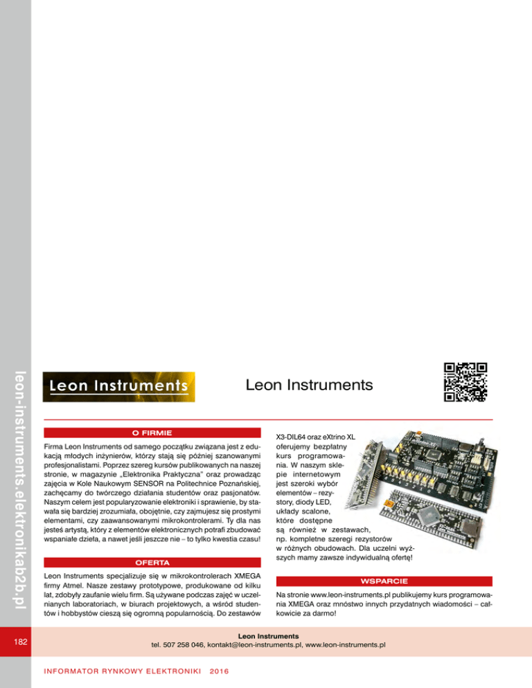 leon-instruments.elektronikab2b.pl 182 Leon Instruments O FIRMIE Firma Leon Instruments od samego początku związana jest z edukacją młodych inżynierów, którzy stają się później szanowanymi profesjonalistami. Poprzez szereg kursów publikowanych na naszej stronie, w magazynie „Elektronika Praktyczna” oraz prowadząc zajęcia w Kole Naukowym SENSOR na Politechnice Poznańskiej, zachęcamy do twórczego działania studentów oraz pasjonatów. Naszym celem jest popularyzowanie elektroniki i sprawienie, by stawała się bardziej zrozumiała, obojętnie, czy zajmujesz się prostymi elementami, czy zaawansowanymi mikrokontrolerami. Ty dla nas jesteś artystą, który z elementów elektronicznych potrafi zbudować wspaniałe dzieła, a nawet jeśli jeszcze nie – to tylko kwestia czasu! OFERTA Leon Instruments specjalizuje się w mikrokontrolerach XMEGA firmy Atmel. Nasze zestawy prototypowe, produkowane od kilku lat, zdobyły zaufanie wielu firm. Są używane podczas zajęć w uczelnianych laboratoriach, w biurach projektowych, a wśród studentów i hobbystów cieszą się ogromną popularnością. Do zestawów 3-DIL64 oraz eXtrino XL X oferujemy bezpłatny kurs programowania. W naszym sklepie internetowym jest szeroki wybór elementów – rezystory, diody LED, układy scalone, które dostępne są również w zestawach, np. kompletne szeregi rezystorów w różnych obudowach. Dla uczelni wyższych mamy zawsze indywidualną ofertę! WSPARCIE Na stronie www.leon-instruments.pl publikujemy kurs programowania XMEGA oraz mnóstwo innych przydatnych wiadomości – całkowicie za darmo! Leon Instruments tel. 507 258 046, [email protected], www.leon-instruments.pl I N F O R M AT O R R Y N KO W Y E L E K T R O N I K I 2016