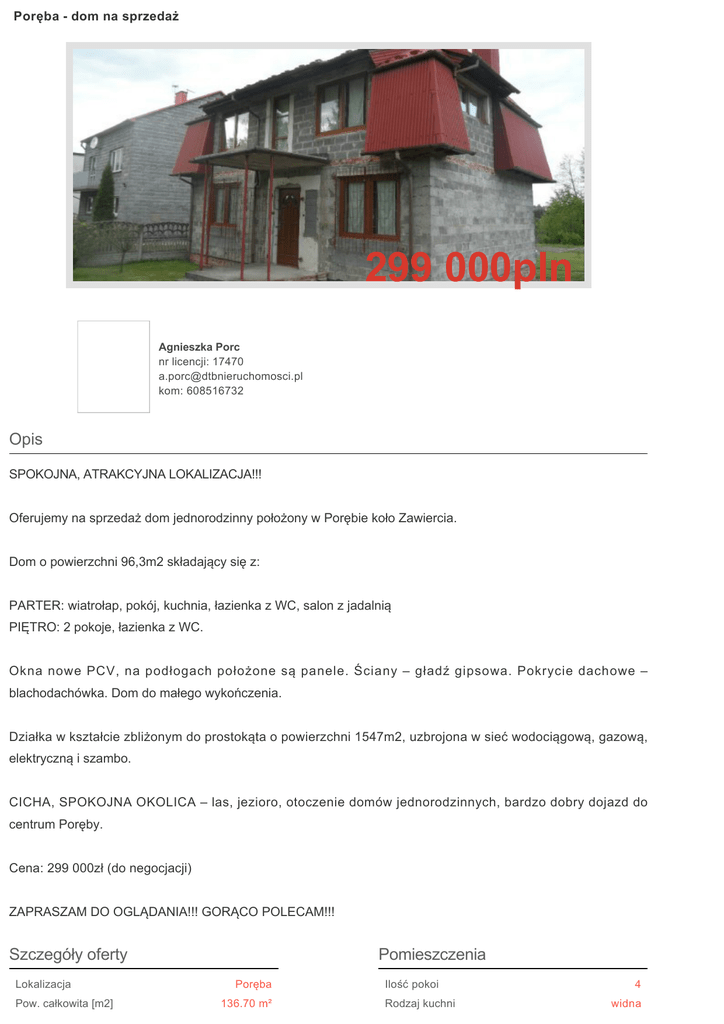 Poręba - dom na sprzedaż 299 000pln Agnieszka Porc nr licencji: 17470 [email protected] kom: 608516732 Opis SPOKOJNA, ATRAKCYJNA LOKALIZACJA!!! Oferujemy na sprzedaż dom jednorodzinny położony w Porębie koło Zawiercia. Dom o powierzchni 96,3m2 składający się z: PARTER: wiatrołap, pokój, kuchnia, łazienka z WC, salon z jadalnią PIĘTRO: 2 pokoje, łazienka z WC. Okna nowe PCV, na podłogach położone są panele. Ściany – gładź gipsowa. Pokrycie dachowe – blachodachówka. Dom do małego wykończenia. Działka w kształcie zbliżonym do prostokąta o powierzchni 1547m2, uzbrojona w sieć wodociągową, gazową, elektryczną i szambo. CICHA, SPOKOJNA OKOLICA – las, jezioro, otoczenie domów jednorodzinnych, bardzo dobry dojazd do centrum Poręby. Cena: 299 000zł (do negocjacji) ZAPRASZAM DO OGLĄDANIA!!! GORĄCO POLECAM!!! Szczegóły oferty Lokalizacja Pow. całkowita [m2] Pomieszczenia Poręba 136.70 m² Ilość pokoi Rodzaj kuchni 4 widna Ilość pokoi 4 Nieruchomość Standard Okna nowe PCV Instalacje nowe Balkon jest Powierzchnia działki [m2] Zagosp. działki 1547.00 zagospodarowana Ukształtowanie działki płaska Kształt działki prostokat Rodzaj domu dom jednorodzinny Pokrycie dachu blachodachówka Powierzchnia użytkowa [m2] Stan budynku 96,30 do wykończenia Ogrodzenie działki mieszane Plac zabaw nie Gaz jest Woda jest Prąd jest Kanalizacja szambo Dojazd asfalt zabudowa jednorodzinna Otoczenie Alarm nie Winda nie Drzwi antywłamaniowe nie U NAS KUPUJĄCY NIE PŁACI PROWIZJI ZA POŚREDNICTWO. KUPUJĄC PRZEZ NASZE BIURO: - OSZCZĘDZASZ ŚRODKI FINANSOWE - ZYSKUJESZ BEZPIECZEŃSTWO TRANSAKCJI - OSZCZĘDZASZ SWÓJ CENNY CZAS - TO MY ZAŁATWIAMY WSZYSTKIE FORMALNOŚCI NIE ZNALAZŁEŚ WYMARZONEJ OFERTY? ZADZWOŃ DO NAS! OPIEKUN OFERTY: Agnieszka Porc tel. 608-516-732 [email protected] DTB Nieruchomości s.c. ul. Obrońców Poczty Gdańskiej 20 42-400 Zawiercie tel. (32) 67-18-902 fax (32) 67-18-903 [email protected] www.dtbnieruchomosci.pl Sprawdź nas!!! Zapraszamy na naszą stronę www.dtbnieruchomosci.pl – na niej znajdziesz wszystko o NAS oraz pozostałe oferty. Współpracujemy z instytucjami finansowymi, dzięki którym oferujemy BEZPŁATNĄ pomoc w uzyskaniu kredytu hipotecznego. Pośrednik odpowiedzialny zawodowo za wykonanie umowy pośrednictwa: Agnieszka Porc (licencja nr: 17470) Treść niniejszego ogłoszenia nie stanowi oferty handlowej w rozumieniu Kodeksu Cywilnego.U NAS KUPUJĄCY NIE PŁACI PROWIZJI ZA POŚREDNICTWO. KUPUJĄC PRZEZ NASZE BIURO: - OSZCZĘDZASZ ŚRODKI FINANSOWE - ZYSKUJESZ BEZPIECZEŃSTWO TRANSAKCJI - OSZCZĘDZASZ SWÓJ CENNY CZAS - TO MY ZAŁATWIAMY WSZYSTKIE FORMALNOŚCI NIE ZNALAZŁEŚ WYMARZONEJ OFERTY? ZADZWOŃ DO NAS! OPIEKUN OFERTY: Agnieszka Porc tel. 608-516-732 [email protected] DTB Nieruchomości s.c. ul. Obrońców Poczty Gdańskiej 20 42-400 Zawiercie tel. (32) 67-18-902 fax (32) 67-18-903 [email protected] www.dtbnieruchomosci.pl Sprawdź nas!!! Zapraszamy na naszą stronę www.dtbnieruchomosci.pl – na niej znajdziesz wszystko o NAS oraz pozostałe oferty. Współpracujemy z instytucjami finansowymi, dzięki którym oferujemy BEZPŁATNĄ pomoc w uzyskaniu kredytu hipotecznego. Pośrednik odpowiedzialny zawodowo za wykonanie umowy pośrednictwa: Agnieszka Porc (licencja nr: 17470) Treść niniejszego ogłoszenia nie stanowi oferty handlowej w rozumieniu Kodeksu Cywilnego. Nota prawna Opis oferty zawarty na stronie internetowej sporządzany jest na podstawie oględzin nieruchomości oraz informacji uzyskanych od właściciela, może podlegać aktualizacji i nie stanowi oferty określonej w art. 66 i następnych K.C.