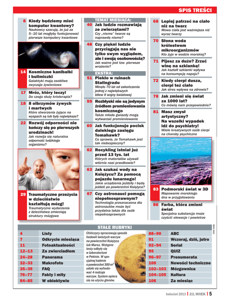 SPIS TREŚCI 8 Kiedy będziemy mieć komputer kwantowy? Naukowcy szacują, że już za 5–10 lat mogłyby funkcjonować pierwsze komputery kwantowe TEMAT MIESIĄCA: 40 Jak ludzie rozmawiają ze zwierzętami? Czy „nieme” twarze są naprawdę nieme? 48 Czy piękni ludzie przyciągają nas nie tylko swym wyglądem, ale i swoją osobowością? Jak ważne jest tzw. pierwsze wrażenie? 14 Kosmiczne kanibalki i bulimiczki Galaktyki mają osobliwe zwyczaje żywieniowe 17 Mróz, który leczy! Do czego służy krioterapia? 18 8 olbrzymów żywych i martwych Które stworzenia żyjące na wyspach są lub były największe? 22 Rozwój odporności nie kończy się po pierwszych urodzinach! Jak rozwija się naturalna odporność ludzkiego organizmu? EKSTRA: 51 Piekło w ruinach Stalingradu Minęło 70 lat od zakończenia jednej z największych bitew II wojny światowej 59 Rozbłyski nie są jedynym źródłem promieniowania kosmicznego Także młode gwiazdy mogą wytwarzać promieniowanie 60 Jak funkcjonuje pocisk dalekiego zasięgu Tomahawk? 68 Lepiej patrzeć na ciało niż na twarz Mowa ciała jest ważniejsza niż wyraz twarzy 70 Słona woda królestwem mikroorganizmów Kto żyje w wodzie morskiej? 71 Pijesz za dużo? Zrzuć winę na szklankę! Jak kształt szklanki wpływa na konsumpcję napoju? 72 Kiedy cierpi dusza, cierpi też ciało Jak stres wpływa na zdrowie? 78 Jak zmieni się świat za 1000 lat? Co mówią nam przepowiednie? 81 Masz zmysł artystyczny? Na wszelki wypadek idź do psychiatry! Wiele kreatywnych osób cierpi na choroby psychiczne Co sprawia, że Tomahawk jest tak niebezpieczny? 62 Recykling istniał już przed 13 tys. lat Których materiałów używali wtórnie nasi przodkowie? 63 Jak szukać wody na Księżycu? Za pomocą pojazdu lunarnego! 29 Traumatyczne przeżycia w dzieciństwie kształtują mózg! Traumatyczne wydarzenia z dzieciństwa zmieniają struktury mózgowe 67 Czy astronauci pomogą niepełnosprawnym? Technologia przeznaczona dla astronautów może być przydatna także dla osób niepełnosprawnych 83 Podmorski świat w 3D Mapowanie morskiego dna w przygotowaniu 86 Farba, która zmieni świat Specjalna substancja może czyścić elewacje i powietrze STAŁE RUBRYKI 4 7 11 12–13 24–28 32–33 35–39 76–77 84–85 Listy Odkrycie miesiąca Fotoaktualności Za zwierciadłem Panorama Makrofoto FAQ Fakty i mity W obiektywie Chińczycy opracowują sposób hodowli świeżych warzyw na powierzchni Księżyca lub Marsa. Wstępne testy odbyły się w laboratorium w Pekinie. W specjalnej kabinie o powierzchni 300 m2 udało się wyhodować 4 rodzaje warzyw. System opiera się na użyciu glonów. 88–90 91 92–94 95 96–97 100 102–103 104–105 106 ABC Wczoraj, dziś, jutro Serial QUIZ Prenumerata Nowości techniczne Mózgownica Kultura Za miesiąc kwiecień 2013 l 21.WIEK l 5 FOTO: NASA Jakie urządzenia jeździły i będą jeździć po powierzchni Księżyca?