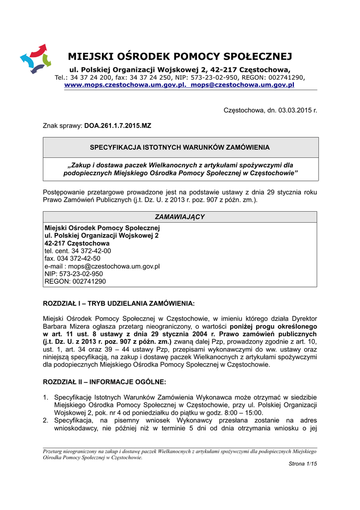 MIEJSKI OŚRODEK POMOCY SPOŁECZNEJ ul. Polskiej Organizacji Wojskowej 2, 42-217 Częstochowa, Tel.: 34 37 24 200, fax: 34 37 24 250, NIP: 573-23-02-950, REGON: 002741290, www.mops.czestochowa.um.gov.pl. [email protected] Częstochowa, dn. 03.03.2015 r. Znak sprawy: DOA.261.1.7.2015.MZ SPECYFIKACJA ISTOTNYCH WARUNKÓW ZAMÓWIENIA „Zakup i dostawa paczek Wielkanocnych z artykułami spożywczymi dla podopiecznych Miejskiego Ośrodka Pomocy Społecznej w Częstochowie” Postępowanie przetargowe prowadzone jest na podstawie ustawy z dnia 29 stycznia roku Prawo Zamówień Publicznych (j.t. Dz. U. z 2013 r. poz. 907 z późn. zm.). ZAMAWIAJĄCY Miejski Ośrodek Pomocy Społecznej ul. Polskiej Organizacji Wojskowej 2 42-217 Częstochowa tel. cent. 34 372-42-00 fax. 034 372-42-50 e-mail : [email protected] NIP: 573-23-02-950 REGON: 002741290 ROZDZIAŁ I – TRYB UDZIELANIA ZAMÓWIENIA: Miejski Ośrodek Pomocy Społecznej w Częstochowie, w imieniu którego działa Dyrektor Barbara Mizera ogłasza przetarg nieograniczony, o wartości poniżej progu określonego w art. 11 ust. 8 ustawy z dnia 29 stycznia 2004 r. Prawo zamówień publicznych (j.t. Dz. U. z 2013 r. poz. 907 z późn. zm.) zwaną dalej Pzp, prowadzony zgodnie z art. 10, ust. 1, art. 34 oraz 39 – 44 ustawy Pzp, przepisami wykonawczymi do ww. ustawy oraz niniejszą specyfikacją, na zakup i dostawę paczek Wielkanocnych z artykułami spożywczymi dla podopiecznych Miejskiego Ośrodka Pomocy Społecznej w Częstochowie. ROZDZIAŁ II – INFORMACJE OGÓLNE: 1. Specyfikację Istotnych Warunków Zamówienia Wykonawca może otrzymać w siedzibie Miejskiego Ośrodka Pomocy Społecznej w Częstochowie, przy ul. Polskiej Organizacji Wojskowej 2, pok. nr 4 od poniedziałku do piątku w godz. 8:00 – 15:00. 2. Specyfikacja, na pisemny wniosek Wykonawcy przesłana zostanie na adres wnioskodawcy, nie później niż w terminie 5 dni od dnia otrzymania wniosku o jej Przetarg nieograniczony na zakup i dostawę paczek Wielkanocnych z artykułami spożywczymi dla podopiecznych Miejskiego Ośrodka Pomocy Społecznej w Częstochowie. Strona 1/15 MIEJSKI OŚRODEK POMOCY SPOŁECZNEJ ul. Polskiej Organizacji Wojskowej 2, 42-217 Częstochowa, Tel.: 34 37 24 200, fax: 34 37 24 250, NIP: 573-23-02-950, REGON: 002741290, www.mops.czestochowa.um.gov.pl. [email protected] przekazanie lub w tym samym dniu w przypadku odbioru osobiście przez wykonawcę. Specyfikacja jest bezpłatna, z zastrzeżeniem art. 42 ust 2 ustawy Pzp – opłata, jakiej można żądać za Specyfikację Istotny Warunków Zamówienia, może pokrywać jedynie koszt jej druku oraz przekazania. 3. Specyfikacja Istotnych Warunków Zamówienia jest również dostępna na stronie internetowej pod adresem http://mops.bip.czestochowa.pl (Biuletyn Informacji Publicznej – zakładka „Zamówienia publiczne”). 4. Wykonawca winien zapoznać się ze wszystkimi dokumentami niniejszej specyfikacji i zdobyć wszelkie informacje niezbędne do przygotowania oferty. 5. Wykonawcy mogą zwrócić się pisemnie do Zamawiającego o wyjaśnienie treści Specyfikacji Istotnych Warunków Zamówienia. 6. Zamawiający niezwłocznie udzieli pisemnych wyjaśnień, nie później jednak niż dwa dni przed terminem składania ofert pod warunkiem, że wniosek o wyjaśnienie treści Specyfikacji Istotnych Warunków Zamówienia wpłynie do Zamawiającego nie później niż do końca dnia, w którym upływa połowa wyznaczonego terminu składania ofert. 7. Treść zapytań wraz z wyjaśnieniami przekazana zostanie jednocześnie wszystkim Wykonawcom, którym przekazano Specyfikację Istotnych Warunków Zamówienia, bez ujawniania źródła zapytania oraz zamieszczona zostanie na stronie internetowej Zamawiającego http://mops.bip.czestochowa.pl (Biuletyn Informacji Publicznej - zakładka „Zamówienia publiczne”). 8. Zamawiający w szczególnie uzasadnionych przypadkach może w każdym czasie, przed upływem terminu do składania ofert, zmodyfikować treść Specyfikacji Istotnych Warunków Zamówienia: a) dokonaną w ten sposób modyfikację Zamawiający przekazuje niezwłocznie wszystkim wykonawcom, którym przekazano Specyfikację Istotnych Warunków Zamówienia oraz zamieszcza na stronie internetowej, na której udostępniona jest Specyfikacja Istotnych Warunków Zamówienia. b) Zamawiający może przedłużyć ostateczny termin składania ofert z uwzględnieniem czasu niezbędnego do wprowadzenia w ofertach zmian wynikających z modyfikacji treści specyfikacji. 9. Zamawiający oświadcza, że nie przewiduje zebrania Wykonawców. 10. Zamawiający nie dopuszcza składania ofert częściowych i wariantowych. 11. Zamawiający nie przewiduje możliwości udzielenia zamówień uzupełniających. 12. Zamawiający nie przewiduje możliwości zawarcia umowy ramowej. 13. Zamawiający nie przewiduje możliwości przeprowadzenia aukcji elektronicznej. 14. Zamawiający nie żąda od Wykonawcy zabezpieczenia należytego wykonania umowy. 15. Zamawiający nie przewiduje możliwości unieważnienia postępowania o udzielenie zamówienia w przypadku, o którym mowa w art. 93 ust. 1a ustawy Pzp. 16. Wszelkiego rodzaju oświadczenia, wnioski, zawiadomienia, informacje Zamawiający i Wykonawcy przekazują pisemnie, faksem lub drogą elektroniczną. Każda ze stron na żądanie drugiej niezwłocznie potwierdza fakt ich otrzymania. 17. Koszty opracowania i dostarczenia oferty oraz uczestnictwa w postępowaniu przetargowym obciążają wyłącznie Wykonawców. Przetarg nieograniczony na zakup i dostawę paczek Wielkanocnych z artykułami spożywczymi dla podopiecznych Miejskiego Ośrodka Pomocy Społecznej w Częstochowie. Strona 2/15 MIEJSKI OŚRODEK POMOCY SPOŁECZNEJ ul. Polskiej Organizacji Wojskowej 2, 42-217 Częstochowa, Tel.: 34 37 24 200, fax: 34 37 24 250, NIP: 573-23-02-950, REGON: 002741290, www.mops.czestochowa.um.gov.pl. [email protected] 18. Wykonawca ponosi wszelkie ryzyko związane ze złożeniem oferty w niewłaści