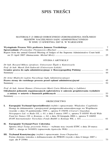 SPIS TREŚCI MATERIAŁY Z OBRAD DOROCZNEGO ZGROMADZENIA OGÓLNEGO SE˛DZIÓW NACZELNEGO SA˛DU ADMINISTRACYJNEGO W DNIU 23 KWIETNIA 2007 R. W WARSZAWIE Wysta˛pienie Prezesa NSA profesora Janusza Trzcińskiego ......................................................... 7 Sprawozdanie (Przemysław Florjanowicz-Błachut) .......................................................................... 16 Report from the annual General Meeting of Judges of the Supreme Administrative Court held on 23 April 2007 (tłumaczenie: Michał Mróz) ............................................................................. 25 STUDIA I ARTYKUŁY Dr hab. Ryszard Mikosz (profesor, Uniwersytet Śla˛ski w Katowicach) Prof. dr hab. Marek Zirk-Sadowski (Uniwersytet Łódzki) Granice prawa do sa˛du administracyjnego w Rzeczypospolitej Polskiej ................................... 35 Summary ............................................................................................................................................... 44 Dr Artur Mudrecki (se˛dzia Naczelnego Sa˛du Administracyjnego) Prawo strony do rzetelnego procesu przed sa˛dami administracyjnymi ..................................... 45 Summary ............................................................................................................................................... 52 Prof. dr hab. Antoni Hanusz (Uniwersytet Marii Curie-Skłodowskiej w Lublinie) Odre˛bności jednostek organizacyjnych sa˛downictwa w zakresie projektowania wydatków a zmiany w ustawie o finansach publicznych ........................................................................... 53 Summary ............................................................................................................................................... 58 ORZECZNICTWO I. Europejski Trybunał Sprawiedliwości (wybór i opracowanie: Władysław Czapliński) Doste˛p do dokumentów i przejrzystość poste˛powania ustawodawczego we Wspólnocie (wyroki: z dnia 19 października 1995 r., sprawa T-194/94 J.Carvel i Guardian Newspapers Ltd. vs Rada UE, s. 61; z dnia 5 marca 1997 r., sprawa T-105/95 World Wide Fund for Nature UK vs Komisja, s. 64; z dnia 30 listopada 2004 r., sprawa T-168/02 IFAW Internationaler Tierschutz–Fonds BmbH vs Komisja WE, s. 65) ................................... 61 II. Europejski Trybunał Praw Człowieka Sprawa Alicji Tysia˛c przeciwko Polsce – wybrane tezy (wyrok ETPC z dnia 20 marca 2007 r., skarga nr 5410/03) (opracowała Agnieszka Wilk) ........................................................ 68 III. Trybunał Konstytucyjny (wybór i opracowanie: Irena Chojnacka) Forma złożenia wniosku o dofinansowanie do PFRON (wyrok z dnia 6 lutego 2007 r. sygn. akt P 25/06) ........................................................................................................................ 73 4 Zeszyty Naukowe Sa˛downictwa Administracyjnego 3(12)/2007 IV. Sa˛d Najwyższy (wybór: Andrzej Wróbel) Wyrok Sa˛du Najwyższego z dnia 8 sierpnia 2006 r. sygn. akt I PK 71/06 [skutki stwierdzenia na podstawie art. 94 ust. 2 u.s.g. niezgodności z prawem uchwały rady gminy o powołaniu pracownika, które nasta˛piło po rozwia˛zaniu z tym pracownikiem stosunku pracy] ............................................................................................................................ 82 V. Naczelny Sa˛d Administracyjny i wojewódzkie sa˛dy administracyjne A. Orzecznictwo Naczelnego Sa˛du Administracyjnego Uchwała składu siedmiu se˛dziów Naczelnego Sa˛du Administracyjnego z dnia 22 lutego 2007 r. (sygn. akt II GPS 2/06) [dot. zastosowania art. 24 § 1 pkt 5 k.p.a. do członka SKO] ............................................. B. Orzecznictwo wojewódzkich sa˛dów administracyjnych (wybór i opracowanie: Bogusław Gruszczyński) 1. Wyrok WSA w Szczecinie z dnia 9 lutego 2005 r. (sygn. akt SA/Sz 2380/03) ........... 2. Wyrok WSA w Gliwicach z dnia 11 września 2006 r. (sygn. akt II SA/GL 1058/05) ...... 3. Wyrok WSA w Białymstoku z dnia 19 października 2006 r. (sygn. akt SA/Bk 521/06) ... 4. Wyrok WSA w Warszawie z dnia 20 listopada 2006 r. (sygn. akt I SA/Wa 1569/06) ...... 5. Wyrok WSA w Olsztynie z dnia 7 grudnia 2006 r. (sygn. akt I SA/Ol 528/06) ........... 87 98 104 113 119 124 VI. Wnioski Prezesa NSA i pytania prawne sa˛dów administracyjnych skierowane do Trybunału Konstytucyjnego (opracowała Irena Chojnacka) 1. Wniosek Prezesa Naczelnego Sa˛du Administracyjnego (z dnia 12 czerwca 2007 r.) [dot. pomocy finansowej na wspieranie gospodarstw niskotowarowych] ............................ 132 2. Pytania prawne sa˛dów administracyjnych ............................................................................. 136 VII. Glosy Prof. dr hab. Wojciech Chróścielewski (Uniwersytet Łódzki) Glosa do uchwały składu siedmiu se˛dziów NSA z dnia 22 lutego 2007 r. (II GPS 2/06) [dot. zastosowania art. 24 § 1 pkt 5 k.p.a. do członka SKO] ................................................... 137 Mgr Przemysław Mijal (Uniwersytet Szczeciński – Katedra Prawa Konstytucyjnego i Integracji Europejskiej) Glosa do wyroku NSA z dnia 29 grudnia 2005 r. (sygn. akt. II OSK 377/05) [prowadzenie działalności przez radnego z wykorzystaniem mienia gminy] ........................... 145 KRONIKA Kalendarium sa˛downictwa administracyjnego (marzec–kwiecień 2007 r.) (opracował Przemysław Florjanowicz-Błachut) .................................................................................. 153 BIBLIOGRAFIA Publikacje z zakresu poste˛powania administracyjnego i sa˛dowoadministracyjnego (marzec–kwiecień 2007 r.) (opracowała Marta Jaszczukowa) ........................................................... 161 TABLE OF CONTENTS MATERIALS FROM THE SESSION OF THE ANNUAL GENERAL MEETING OF JUDGES OF THE SUPREME ADMINISTRATIVE COURT HELD ON 23 APRIL 2007 IN WARSAW Speech by professor Janusz Trzciński – the Presiding Judge of the SAC .................