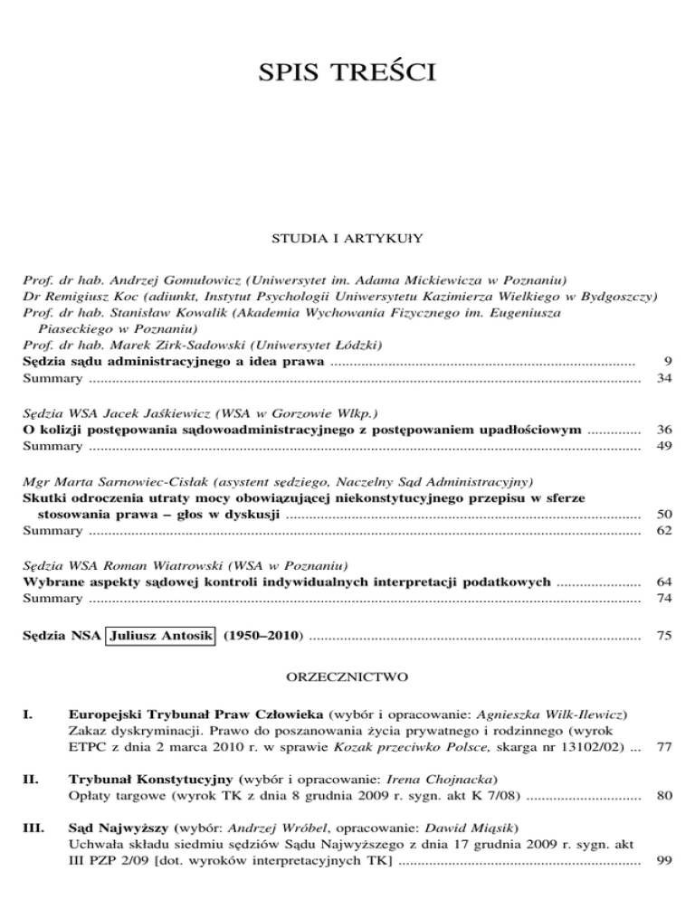 SPIS TREŚCI STUDIA I ARTYKUłY Prof. dr hab. Andrzej Gomułowicz (Uniwersytet im. Adama Mickiewicza w Poznaniu) Dr Remigiusz Koc (adiunkt, Instytut Psychologii Uniwersytetu Kazimierza Wielkiego w Bydgoszczy) Prof. dr hab. Stanisław Kowalik (Akademia Wychowania Fizycznego im. Eugeniusza Piaseckiego w Poznaniu) Prof. dr hab. Marek Zirk-Sadowski (Uniwersytet Łódzki) Se˛dzia sa˛du administracyjnego a idea prawa ............................................................................... 9 Summary ............................................................................................................................................... 34 Se˛dzia WSA Jacek Jaśkiewicz (WSA w Gorzowie Wlkp.) O kolizji poste˛powania sa˛dowoadministracyjnego z poste˛powaniem upadłościowym .............. 36 Summary ............................................................................................................................................... 49 Mgr Marta Sarnowiec-Cisłak (asystent se˛dziego, Naczelny Sa˛d Administracyjny) Skutki odroczenia utraty mocy obowia˛zuja˛cej niekonstytucyjnego przepisu w sferze stosowania prawa – głos w dyskusji ............................................................................................ 50 Summary ............................................................................................................................................... 62 Se˛dzia WSA Roman Wiatrowski (WSA w Poznaniu) Wybrane aspekty sa˛dowej kontroli indywidualnych interpretacji podatkowych ...................... 64 Summary ............................................................................................................................................... 74 Se˛dzia NSA Juliusz Antosik (1950–2010) ...................................................................................... 75 ORZECZNICTWO I. II. III. Europejski Trybunał Praw Człowieka (wybór i opracowanie: Agnieszka Wilk-Ilewicz) Zakaz dyskryminacji. Prawo do poszanowania życia prywatnego i rodzinnego (wyrok ETPC z dnia 2 marca 2010 r. w sprawie Kozak przeciwko Polsce, skarga nr 13102/02) ... 77 Trybunał Konstytucyjny (wybór i opracowanie: Irena Chojnacka) Opłaty targowe (wyrok TK z dnia 8 grudnia 2009 r. sygn. akt K 7/08) .............................. 80 Sa˛d Najwyższy (wybór: Andrzej Wróbel, opracowanie: Dawid Mia˛sik) Uchwała składu siedmiu se˛dziów Sa˛du Najwyższego z dnia 17 grudnia 2009 r. sygn. akt III PZP 2/09 [dot. wyroków interpretacyjnych TK] ............................................................... 99 4 IV. V. VI. Zeszyty Naukowe Sa˛downictwa Administracyjnego 2(29)/2010 Naczelny Sa˛d Administracyjny i wojewódzkie sa˛dy administracyjne A. Orzecznictwo Naczelnego Sa˛du Administracyjnego (wybór: Stefan Babiarz, opracowanie: Marcin Wia˛cek) 1. Uchwała składu całej Izby Finansowej NSA z dnia 14 grudnia 2009 r. sygn. akt II FPS 7/09 [dot. wykładni terminu „niewydanie interpretacji indywidualnej”] ........ 2. Uchwała składu siedmiu se˛dziów NSA z dnia 15 lutego 2010 r. sygn. akt II FPS 8/09 [dot. możliwości powołania art. 141 § 4 p.p.s.a. jako samodzielnej podstawy skargi kasacyjnej] .......................................................................................... B. Orzecznictwo wojewódzkich sa˛dów administracyjnych (wybór: Bogusław Gruszczyński, opracowanie: Marcin Wia˛cek) 1. Wyrok WSA w Kielcach z dnia 8 stycznia 2009 r. sygn. akt II SA/Ke 718/08 [dot. charakteru prawnego terminu do złożenia oświadczenia o zrealizowaniu przedsie˛wzie˛cia zgodnie z planem rozwoju gospodarstwa niskotowarowego] ........... 2. Wyrok WSA w Szczecinie z dnia 27 maja 2009 r. sygn. akt I SA/Sz 37/09 [dot. warunków skorzystania z tzw. ulgi odsetkowej w podatku dochodowym od osób fizycznych] ....................................................................................................... 3. Wyrok WSA w Białymstoku z dnia 30 września 2009 r. sygn. akt I SA/Bk 295/09 [dot. terminu do złożenia korekty deklaracji VAT] ..................................................... 4. Wyrok WSA w Poznaniu z dnia 7 października 2009 r. sygn. akt IV SA/Po 608/09 [dot. kompetencji nadzorczych wojewody] .................................................................. 5. Wyrok WSA w Szczecinie z dnia 14 października 2009 r. sygn. akt II SA/Sz 819/09 [dot. wymiany zagranicznego prawa jazdy] ................................................................. Wnioski Prezesa NSA i pytania prawne sa˛dów administracyjnych skierowane do Trybunału Konstytucyjnego (opracowała Irena Chojnacka) 1. Pytanie prawne Naczelnego Sa˛du Administracyjnego, postanowienie z dnia 18 grudnia 2009 r. sygn. akt I FSK 1609/08 [dot. uprawnienia do skorygowania deklaracji podatkowej] ........................................................................................................ 2. Pytanie prawne Wojewódzkiego Sa˛du Administracyjnego we Wrocławiu, postanowienie z dnia 14 stycznia 2010 r. sygn. akt IV SA/Wr 373/09 [dot. ograniczeń czasowych do składania wniosku o przyznanie uprawnień kombatanckich] ................................................................................................................... 3. Pytania prawne Wojewódzkiego Sa˛du Administracyjnego w Warszawie: 3.1. Postanowienie z dnia 12 lutego 2010 r. sygn. akt VI SA/Wa 1153/09 [dot. sa˛dowoadministracyjnej kontroli orzeczeń polskiego zwia˛zku sportowego w przedmiocie udzielenia klubom sportowym licencji na dany sezon rozgrywkowy] ................................................................................................................... 3.2. Postanowienie z dnia 20 stycznia 2010 r. sygn. akt I SA/Wa 1667/09 [dot. warunków, jakie musi spełniać uczelnia, by prowadzić studia na określonym kierunku i poziomie kształcenia] ..................................................................................... 114 122 128 132 138 143 146 151 152 153 156 Glosy Prof. dr