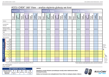 IMIĘ I NAZWISKO PACJENTA / TELEFON IMIĘ I NAZWISKO LEKARZA PROWADZĄCEGO / TELEFON ACCU-CHEK® 360o View – analiza stężenia glukozy we krwi Przed obiadem 2 godz. po obiedzie Przed kolacją 2 godz. po kolacji Przed snem Przed śniadaniem 2 godz. po śniadaniu Przed obiadem 2 godz. po obiedzie Przed kolacją 2 godz. po kolacji Przed snem Przed śniadaniem 2 godz. po śniadaniu Przed obiadem 2 godz. po obiedzie Przed kolacją 2 godz. po kolacji Przed snem Dzień 3 Data 2 godz. po śniadaniu Dzień 2 Data Przed śniadaniem Dzień 1 Data - MŚD - MŚD - MŚD - - MŚD - MŚD - MŚD - - MŚD - MŚD - MŚD - Godzina Insulina/leki doustne Wielkość posiłku M (mały), Ś (średni), D (duży) WW Aktywność fizyczna 12345 12345 12345 12345 12345 12345 12345 12345 12345 12345 12345 12345 12345 12345 12345 12345 12345 12345 12345 12345 12345 Wynik pomiaru >300 ZA WYSOKIE mg/dL 221-260 Wartości docelowe 2 godz. po posiłku* mg/dL 181-220 mg/dL 141-180 mg/dL 111-140 mg/dL 81-110 mg/dL ZA NISKIE STĘŻENIE GLUKOZY WE KRWI** mg/dL 261-300 51-80 mg/dL <50 mg/dL ** Kryteria wyrównania gospodarki węglowodanowej; Zalecenia PTD 2010 *Ustal z lekarzem swój indywidualny zakres wartości docelowych Jak interpretujesz swoje wyniki? UWAGA: AKTYWNOŚĆ FIZYCZNA Jaka jest Twoja aktywność fizyczna? 1 Bardzo mała 2 Mała 3 Średnia 4 Duża 5 Bardzo duża Uzgodnij ze swoim lekarzem prowadzącym zasady zmian dawkowania leków doustnych/insuliny Zabierz ten formularz oraz swój glukometr Accu-Chek na następną wizytę u lekarza Wartości docelowe na czczo i przed posiłkami*