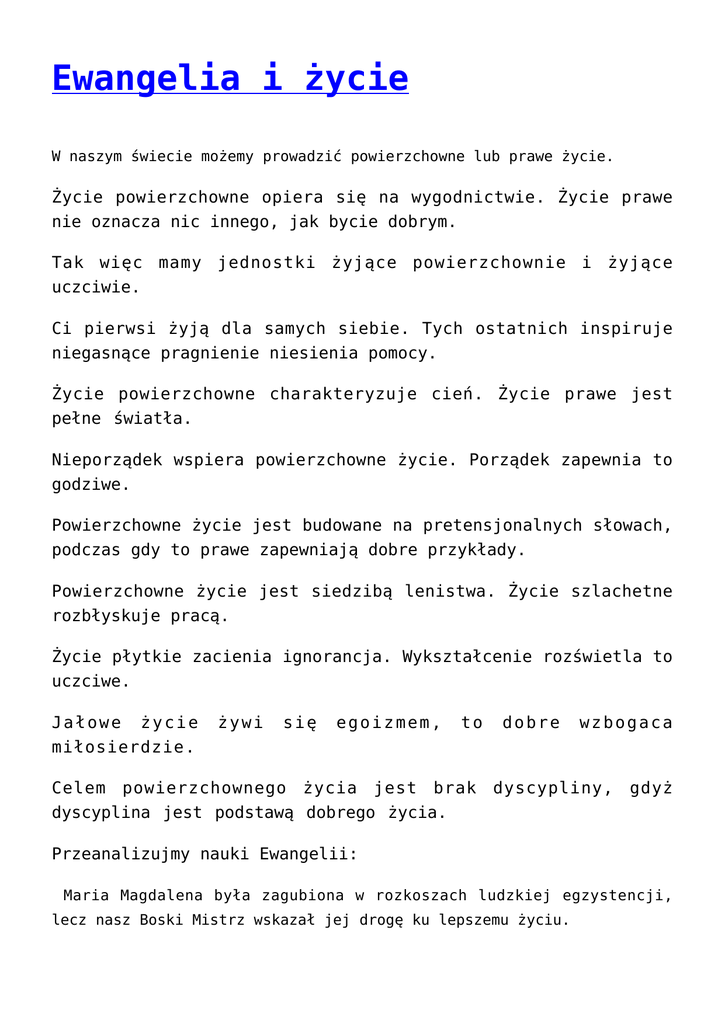 Ewangelia i życie W naszym świecie możemy prowadzić powierzchowne lub prawe życie. Życie powierzchowne opiera się na wygodnictwie. Życie prawe nie oznacza nic innego, jak bycie dobrym. Tak więc mamy jednostki żyjące powierzchownie i żyjące uczciwie. Ci pierwsi żyją dla samych siebie. Tych ostatnich inspiruje niegasnące pragnienie niesienia pomocy. Życie powierzchowne charakteryzuje cień. Życie prawe jest pełne światła. Nieporządek wspiera powierzchowne życie. Porządek zapewnia to godziwe. Powierzchowne życie jest budowane na pretensjonalnych słowach, podczas gdy to prawe zapewniają dobre przykłady. Powierzchowne życie jest siedzibą lenistwa. Życie szlachetne rozbłyskuje pracą. Życie płytkie zacienia ignorancja. Wykształcenie rozświetla to uczciwe. Jałowe życie żywi się egoizmem, to dobre wzbogaca miłosierdzie. Celem powierzchownego życia jest brak dyscypliny, gdyż dyscyplina jest podstawą dobrego życia. Przeanalizujmy nauki Ewangelii: Maria Magdalena była zagubiona w rozkoszach ludzkiej egzystencji, lecz nasz Boski Mistrz wskazał jej drogę ku lepszemu życiu. Możny Zacheusz zbyt kurczowo trzymał się ulotnego dostatku powierzchownego życia; jednakże, poprzez kontakt z Naszym Panem zrozumiał, jak spożytkować majątek i zmienił swoją postawę. Judasz, nieostrożny uczeń, dając się owładnąć powierzchownemu życiu, uciekł i z niemożności powrotu na dobrą drogę popadł w obłęd. Szymon Piotr, nawrócony apostoł, próbując poddać się powierzchownemu życiu, instynktownie wyparł się swojego Boskiego Przyjaciela trzykrotnie tej samej nocy. Pomimo tego, po zesłaniu Ducha Świętego, roztropnie skłonił się ku godnemu życiu poświęcając mu się całkowicie. Piłat, wątpiący sędzia, zainteresowany jedynie czerpaniem radości z powierzchownego życia, umył ręce nad losem Wzniosłego Dobroczyńcy, co wprawdzie spowodowało wyrzuty sumienia i skruchę, ale oddaliło go od prawego życia. Wszyscy odpowiedzialni za ukrzyżowanie Jezusa poddawali się iluzji pustego życia. Niemniej jednak Pan wolał umrzeć na krzyżu skrajnych wyrzeczeń, aby ukazać nam drogę do lepszego życia. Na ziemskich drogach możemy łatwo zaobserwować, że większość ludzi wiedzie powierzchowne życie, ponieważ bruka ono duszę, podczas gdy życie prawe podtrzymuje rozbudzone sumienie w celu wykonywania powierzonych mu obowiązków. Ostrożnie wybierajmy odpowiednią drogę w swoich codziennych doświadczeniach. Bądźmy pewni ścieżki życia, którą podążamy. Sheila (Duch)/ Francisco C. Xavier (medium) Źródło: „The Spiritist Magazine”, 2013 January Nº20: „Gospel and Life”.