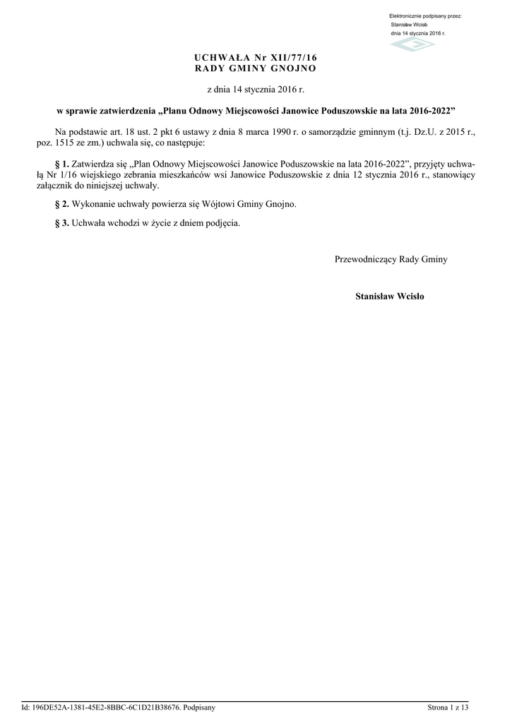 Elektronicznie podpisany przez: Stanisław Wcisło dnia 14 stycznia 2016 r. UCH WAŁA Nr XII/ 77/ 16 RADY GMINY GNO JNO z dnia 14 stycznia 2016 r. w sprawie zatwierdzenia „Planu Odnowy Miejscowości Janowice Poduszowskie na lata 2016-2022” Na podstawie art. 18 ust. 2 pkt 6 ustawy z dnia 8 marca 1990 r. o samorządzie gminnym (t.j. Dz.U. z 2015 r., poz. 1515 ze zm.) uchwala się, co następuje: § 1. Zatwierdza się „Plan Odnowy Miejscowości Janowice Poduszowskie na lata 2016-2022”, przyjęty uchwałą Nr 1/16 wiejskiego zebrania mieszkańców wsi Janowice Poduszowskie z dnia 12 stycznia 2016 r., stanowiący załącznik do niniejszej uchwały. § 2. Wykonanie uchwały powierza się Wójtowi Gminy Gnojno. § 3. Uchwała wchodzi w życie z dniem podjęcia. Przewodniczący Rady Gminy Stanisław Wcisło Id: 196DE52A-1381-45E2-8BBC-6C1D21B38676. Podpisany Strona 1 z 13 PLAN ODNOWY MIEJSCOWOSCI JANOWICE PODUSZOWSKIE NA LATA 2016-2022 Załącznik do uchwały nr XII/77/16 Rady Gminy Gnojno z dnia 14 stycznia 2016 r. GMINA GNOJNO PLAN ODNOWY MIEJSCOWOŚCI JANOWICE PODUSZOWSKIE NA LATA 2016-2022 1 Id: 196DE52A-1381-45E2-8BBC-6C1D21B38676. Podpisany Strona 2 z 13 PLAN ODNOWY MIEJSCOWOSCI JANOWICE PODUSZOWSKIE NA LATA 2016-2022 WSTĘP Polska wieś nadal potrzebuje inwestycji w infrastrukturę komunalną, aby osiągnąć poziom średniej europejskiej i wszelkie programy inwestycyjne, wspierające powstawanie nowoczesnych rozwiązań infrastrukturalnych są potrzebne i stanowią podstawę powstawania planów rozwoju wsi. Zadania z zakresu odnowy wsi nie są wyłącznie powiązane z funduszami unijnymi. Aby jednak poznać strukturę koniecznych wydatków, trzeba sporządzić dokument o charakterze średnioterminowej prognozy ekonomiczno - finansowej, tak aby gmina mogła przygotować swój Wieloletni Plan Inwestycyjny i zaplanować najbardziej optymalny montaż finansowy. Ponieważ zakłada się logiczną konsekwencję konstrukcji Planu Odnowy Miejscowości w ścisłej korelacji z Planem Rozwoju Lokalnego gminy i powiatu, strategię rozwoju województwa i kierunku gospodarowania przestrzennego, dokument ten powinien miech charakter małej strategii rozwoju miejscowości. Rozwój i odnowa obszarów wiejskich to jedno z kluczowych wyzwań, jakie stoją przed Polską. Zasadniczym jej celem jest wzmocnienie działań służących zmniejszaniu istniejących dysproporcji i różnic w poziomie rozwoju obszarów wiejskich w stosunku do terenów miejskich. Plan Odnowy Miejscowości jest jednym z najważniejszych elementów jej rozwoju oraz poprawy warunków pracy i życia mieszkańców. Sporządzenie i uchwalenie takiego dokumentu stanowi niezbędny warunek przy aplikowaniu o środki finansowe w ramach „Programu Rozwoju Obszarów Wiejskich 2014 - 2020”, jak również stanowić będzie wytyczne dla władz gminy Gnojno, przy opracowaniu kierunków rozwoju miejscowości i gminy. Celem działania „Podstawowe usługi i odnowa wsi na obszarach wiejskich” jest wspieranie rozwój infrastruktury wiejskiej oraz odnowę wsi, przyczyniając się tym samym do poprawy warunków życia i prowadzenia działalności gospodarczej. Działanie umożliwi rozwój tożsamości społeczności wiejskiej, zachowanie dziedzictwa kulturowego i specyfiki obszarów wiejskich oraz wpłynie na wzrost ich atrakcyjności turystycznej i inwestycyjnej. W zakres działania wchodzą trzy odrębne poddziałania, w ramach których realizowany jest szereg różnych typów operacji: : Gospodarka wodno - ściekowa. : udowa lub modernizacja dróg lokalnych. : Ochrona zabytków i budownictwa tradycyjnego. 2 Id: 196DE52A-1381-45E2-8BBC-6C1D21B38676. Podpisany Strona 3 z 13 PLAN ODNOWY MIEJSCOWOSCI JANOWICE PODUSZOWSKIE NA LATA 2016-2022 : Inwestycje w obiekty pełniące funkcje kulturalne. : ształtowanie przestrzeni publicznej. : Inwestycje w targowiska lub obiekty budowlane przeznaczone na cele promocji lokalnych produktów. CHARAKTERYSTYKA MIEJSCOWOŚCI JANOWICE PODUSZOWSKIE POŁOŻENIE, POWIERZCHNIA, LUDNOŚĆ Miejscowość Janowice Poduszowskie położona jest w południowo – zachodniej części gminy Gnojno, sołectwo zajmuje 350,45 ha co stanowi 3,66% powierzchni gminy. Od drogi wojewódzkiej nr 765 dzieli ją długość ok 4 km. y dojechać do Gnojna trzeba pokonać odcinek o długości 4 km, od Chmielnika 13 km. Od Janowic Poduszowskich do stolicy powiatu uska Zdroju jest 24 km. Gmina w przybliżeniu położona jest w centrum województwa świętokrzyskiego w odległości 50 km od ielc i 25 km od uska Zdroju. Stanowi najbardziej wysuniętą na północ część powiatu buskiego. W latach 1975-1998 miejscowość administracyjnie należała do województwa kieleckiego. LUDNOŚĆ JANOWIC PODUSZOWSKICH W Gminie Gnojno na dzień 25.11.2015 r. zamieszkuje 4668 mieszkańców zameldowanych na pobyt stały. Liczba ludności w Gminie Gnojno, a co za tym idzie także w miejscowości Janowice Poduszowskie od lat wykazuje tendencję spadkową, spowodowaną ujemnym przyrostem naturalnym ludności oraz ujemnym saldem migracji. Jest to tendencja charakterystyczna dla całego województwa świętokrzyskiego z wyjątkiem powiatu kieleckiego ziemskiego, gdzie notowany jest nieznaczny wzrost liczby ludności. Janowice Poduszowskie zamieszkuje 239 mieszkańców, dane na dzień 25.11.2015 r, uzyskane na podstawie rejestru prowadzonego przez Urząd Gminy w Gnojnie. HISTORIA MIEJSCOWOŚCI Janowice znane były niegdyś pod inną nazwą. W 1579 w parafii Gnojno notuje się wieś o nazwie Wolia Januszowska należąca do rodziny Marchockich, tych samych co dziedziczyli 3 Id: 196DE52A-1381-45E2-8BBC-6C1D21B38676. Podpisany Strona 4 z 13 PLAN ODNOWY MIEJSCOWOSCI JANOWICE PODUSZOWSKIE NA LATA 2016-2022 w Januszowicach. Z czasem przyjęła się nazwa Janowice. W XVII wieku dziedziczył tutaj Stefan idziński, który znany był z religijności. Zyski z tej wsi zbierali zakonnicy i stąd zapewne wzięła się nazwa Poduszowska, które pochodzi od słowa „po duc