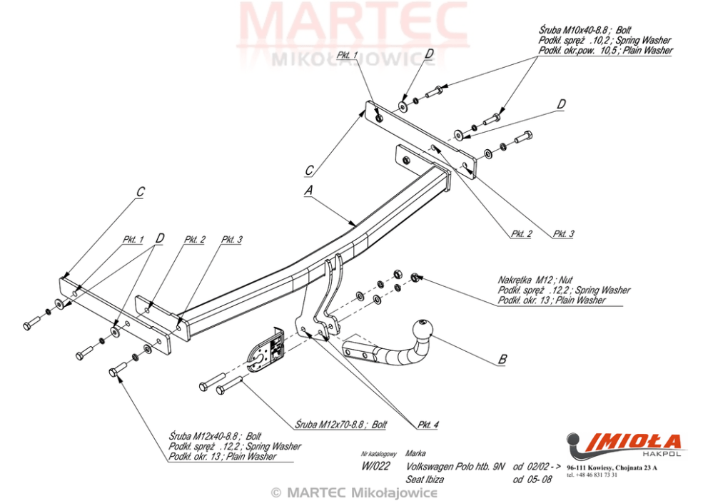 3NW ĝUXED0[%ROW 3RGNáVSUĊĪ6SULQJ:DVKHU 3RGNáRNUSRZ3ODLQ:DVKHU ' ' & $ & 3NW ' 3NW 3NW 3NW 3NW 1DNUĊWND01XW 3RGNáVSUĊĪ6SULQJ:DVKHU 3RGNáRNU3ODLQ:DVKHU % ĝUXED0[%ROW 3NW ĝUXED0[%ROW 3RGNáVSUĊĪ6SULQJ:DVKHU 1UNDWDORJRZ\ 0DUND 3RGNáRNU3ODLQ:DVKHU : 9RONVZDJHQ3RORKWE1 RG! 6HDW,EL]D RG © MARTEC Mikołajowice 96-111 Kowiesy, Chojnata 23 A tel. +48 46 831 73 31 Gniazdo 7-biegunowe 12V z ruchomymi bolcami Symbol SWW 1135-812 Oznaczenie zacisku 31 L R 54 58L 58R + Zacisk do łączenia przewodów do masy pojazdu do świateł kierunku jazdy lewych do świateł kierunku jazdy prawych do świateł hamowania do świateł pozycyjnych lewych do świateł pozycyjnych prawych tylne światła przeciwmgłowe Moment skręcający dla śrub i nakrętek (8.8) Torgue settings for nuts and bolts (8.8) M8 25 Nm M12 M10 55 Nm M14 M16 195 Nm • • • • • • • • • • ZESTAW ŚRUBOWY: FASTENING MEANS: Kolory Biały , white śółty , yellow zielony, green czerwony, red czarny, black brązowy, brown niebieski , blue SEAT IBIZA 05 - 08 VW POLO htb. (9N) 02/02 – 05/09 NO CAT. W/022 -M12x70 8.8 -M12x35 8.8 -M10x45 8.8 INSTRUKCJA MONTAśU: FITTING INSTRUCTION: 2szt 2szt 2szt -M12 4szt -M10 4szt -M12 4szt -M10 -M12 4szt 2szt − ∅ x36 4szt 85 Nm 135 Nm Odkręcić zderzak . Od tylnego pasa samochodu odkręcić belkę zderzeniową (nie będzie juŜ wykorzystana). W otwory podłuŜnic wsunąć elementy zaczepu C i poprzez technologiczne otwory w podłuŜnicy skręcić lekko śrubami M10x35 8.8 stosując podkładki D (pkt 1). Między elementy zaczepu C wsunąć do podłuŜnic belkę zaczepu A i poprzez technologiczne otwory w podłuŜnicy oraz otwory w elementach C (pkt 2) skręcić lekko śrubami M10x45 8.8 stosując podkładki D. Skręcić elementy C z belką zaczepu A (pkt 3) śrubami M12x35 8.8. Dokręcić wszystkie śruby z momentem wg tabeli. Wykonać wycięcie w osi, w dolnej części zderzaka o wymiarach 40x50. Zamontować zderzak. Przykręcić kulę i blachę gniazda elektrycznego śrubami M12x70 8.8. Podłączyć instalację elektryczną. • • • • • • • • • • © MARTEC Mikołajowice Unscrew the bumper. Unscrew the bumper bar from the rear belt of the car (it will not be used any more). Insert elements C in the holes of the metal clamps and screrw slightly through the technological holes in the metal clamp with bolts M10x35 8.8 using washers D (point 1). Insert the main bar A between the elements C in the metal clamps and screw slightly through the technological holes in the metal clamps and through the holes in the elements C (point 2) with bolts M10x45 8.8 using washers D. Screw the elements C to the main bar A with bolts M12x35 8.8 (point 3). Tighten all the bolts according to the torque setting –see the table. Cut out the fragment 40x50 in the lower part of the bumper, in its axle. Assemble the bumper. Fix the ball and electric plate with bolts M12x70 8.8. Connect the electric wires. Zakład Produkcyjno Handlowo Usługowy 96-111 Kowiesy, Chojnata 23A tel. (0-46) 831 73 31, fax 831 74 29 www.hakpol.pl POLAND WARUNKI EKSPLOATACJI. Zaczep posiada tabliczkę znamionową obowiązującą uŜytkownika w zakresie prawidłowego i bezpiecznego obciąŜenia. Zaczep kulowy do samochodu: R = 1200 kg D = 6,90 kN ⇓ SEAT IBIZA 05 - 08 VW POLO htb. (9N) 02/02 – 05/09 S = 50 kg W czasie całej eksploatacji naleŜy poszczególne elementy zaczepu utrzymywać w naleŜytym stanie technicznym (właściwie dokręcone elementy złączone, całość konstrukcji zabezpieczona przed działaniem korozji). Przyczepa musi być połączona z zaczepem kulowym dodatkowym złączem o odpowiedniej wytrzymałości (łańcuch, linka z zapięciem). Nr katalogowy W/022 KARTA GWARANCYJNA Warunki gwarancyjne i postępowanie reklamacyjne 1. 2. 3. 4. 5. Producent zobowiązuje się do wymiany wadliwego wyrobu w okresie 12 miesięcy od daty zakupu lub 24 miesięcy od daty produkcji, w terminie 14-dniowym. Wymianę wadliwego wyrobu dokonuje się w miejscu zakupu lub bezpośrednio u producenta. Nie podlega reklamacji gwarancyjnej zaczep kulowy, którego uszkodzenie nastąpiło: a) wskutek wypadku, b) wskutek nieprzestrzegania zasad prawidłowej obsługi, eksploatacji, konserwacji podanych w instrukcji. Karta gwarancyjna bez daty sprzedaŜy , pieczęci sklepu lub warsztatu montującego, nie moŜe słuŜyć jako podstawa do reklamacji. W skutek nie prawidłowego zamontowania zaczepu. UWAGA Uszkodzenia mechaniczne zaczepu kulowego np. w wyniku najechania, zaczepienia przeszkodę, wykluczają dalszą eksploatację zaczepu. Uszkodzony zaczep kulowy nie moŜe być naprawiany. Sprawdzić śruby mocujące zaczep kulowy po około 1000 km przebiegu eksploatacji. Nacisk pionowy na kulę zaczepu nie moŜe przekroczyć 50 kg. Po zamontowaniu zaczepu kulowego naleŜy dokonać przeglądu na stacji diagnostycznej! data sprzedaŜy............................ nr rej poj .................................... Data produkcji........-.................. m-c rok. Przeznaczenie Zaczep kulowy zamontowany do samochodu przeznaczony jest do holowania przyczep towarowych i turystycznych. Warunki zamontowania Zaczep moŜe być zamontowany i eksploatowany w samochodzie, który posiada właściwy stan techniczny elementów podwozia, poprzez które następuje podłączenie zaczepu. Elementy te nie mogą być uszkodzone mechanicznie ani poprzez działanie korozji. © MARTEC Mikołajowice ............................ pieczęć sprzedawcy. E20 55R 01 1045
