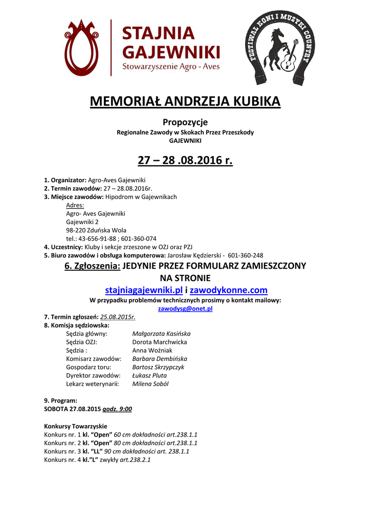 MEMORIAŁ ANDRZEJA KUBIKA Propozycje Regionalne Zawody w Skokach Przez Przeszkody GAJEWNIKI 27 – 28 .08.2016 r. 1. Organizator: Agro-Aves Gajewniki 2. Termin zawodów: 27 – 28.08.2016r. 3. Miejsce zawodów: Hipodrom w Gajewnikach Adres: Agro- Aves Gajewniki Gajewniki 2 98-220 Zduńska Wola tel.: 43-656-91-88 ; 601-360-074 4. Uczestnicy: Kluby i sekcje zrzeszone w OZJ oraz PZJ 5. Biuro zawodów i obsługa komputerowa: Jarosław Kędzierski - 601-360-248 6. Zgłoszenia: JEDYNIE PRZEZ FORMULARZ ZAMIESZCZONY NA STRONIE stajniagajewniki.pl i zawodykonne.com W przypadku problemów technicznych prosimy o kontakt mailowy: [email protected] 7. Termin zgłoszeń: 25.08.2015r. 8. Komisja sędziowska: Sędzia główny: Małgorzata Kasińska Sędzia OZJ: Dorota Marchwicka Sędzia : Anna Woźniak Komisarz zawodów: Barbara Dembińska Gospodarz toru: Bartosz Skrzypczyk Dyrektor zawodów: Łukasz Pluta Lekarz weterynarii: Milena Soból 9. Program: SOBOTA 27.08.2015 godz. 9:00 Konkursy Towarzyskie Konkurs nr. 1 kl. “Open” 60 cm dokładności art.238.1.1 Konkurs nr. 2 kl. “Open” 80 cm dokładności art.238.1.1 Konkurs nr. 3 kl. “LL” 90 cm dokładności art. 238.1.1 Konkurs nr. 4 kl.”L” zwykły art.238.2.1 Konkursy Regionalne Konkurs nr. 4 kl.”L” Konkurs nr. 5 kl.”P” Konkurs nr. 6 kl.”N” Konkurs nr. 7 kl.”C” zwykły art.238.2.1 dwufazowy art. 274.5.3 zwykły art.238.2.1 zwykły art.238.2.1 NIEDZIELA 28.08.2015 godz. 8:00 Niedzielna pula nagród w konkursach GRAND PRIX i SZEŚCIU BARIER 10,000 Konkursy Regionalne Konkurs nr. 8 kl.”L” Konkurs nr. 9 kl.”P” Konkurs nr. 10 kl.”N” Konkurs nr. 11 kl.”C” Konkurs nr. 12 kl.”N” zł. zwykły art.238.2.1 zwykły art.238.2.1 dwufazowy art. 274.5.3 GRAND PRIX zwykły z rozgrywką art.238.2.2 sześciu barier art. 262.3 Godziny rozpoczęcia konkursów będą uzależnione od ilości zgłoszeń. Organizator zastrzega sobie możliwość zmian w programie zawodów. 10. Warunki techniczne: Plac konkursowy: podłoże: piasek wymiary: 100 x 40 metrów Rozprężalnia: podłoże: piasek wymiary: 50 x 30 metrów Organizator nie ponosi odpowiedzialności za wypadki, kradzieże oraz szkody mogące mieć miejsce podczas zawodów i transportu. SOBOTA: Ilość nagradzanych miejsc w danym konkursie zależy od ilości przejazdów: - do 4 przejazdów -> płatne 1 miejsce - od 5 do 8 przejazdów -> płatne 1-2 miejsca - od 9 do 12 przejazdów -> płatne 1-3 miejsca - od 13 do 16 przejazdów -> płatne 1-4 miejsca NIEDZIELA: Dla zwycięzców konkursów Zawodów Regionalnych KL.P,N,C przewidziane są nagrody pieniężne. W konkursach kl. L przewidziane są nagrody rzeczowe. W PIĄTEK 26.08 PLAC KONKURSOWY BĘDZIE UDOSTĘPNIONY DO TRENINGÓW DO GODZINY 18:30 11. Zakwaterowanie: Hotel Agro - Aves Gajewniki tel.: 43 824 40 35 pokój bez śniadania - 70 zł. Hotel “Pod Kominem” - 95 zł. Można zamówić jedno miejsce noclegowe Istnieje możliwość wykupienia śniadania w cenie 20 zł. Organizator nie pośredniczy w zamówieniu noclegu poza Gajewnikami. Hotel Ostrówek tel.: 43 823 91 11 ok. 3 km Hotel Hades tel.: 43 825 31 20 ok. 4 km 12. Warunki finansowe: Boks w stajni murowanej: - za jeden dzień 40zł. - za dwa dni 70 zł. Boks w namiocie: - za jeden dzień 30 zł. - za dwa dni 50 zł. Miejsca w stajni będą przyznawane według kolejności dokonywanych opłat. W pierwszej kolejności w stajni murowanej. Opłata organizacyjna za konia za jeden dzień - 50 zł Opłata startowa: - Konkursy kl. L, LL, “Open” - 15 zł - Konkurs kl. P - 25 zł - Konkurs kl. N - 30 zł - Konkurs kl. C - 40 zł Podłączenie koniowozu do prądu - 120 zł Opłaty startowe zostaną wypłacone jako nagrody finansowe w konkursach: 5,6,7 sobota 9,10,11,12 niedziela Opłaty za boksy i opłatę organizacyjną należy dokonać na rachunek: Stowarzyszenia AGRO - AVES Bank BZ WBK 57 1090 2705 0000 0001 2280 2086 KODEKS POSTĘPOWANIA Z KONIEM Polski Związek Jeździecki prosi wszystkie osoby zaangażowane w jakikolwiek sposób w sporty konne, o przestrzeganie poniżej przedstawionego kodeksu oraz zasady, że dobro konia jest najważniejsze. Dobro konia musi być zawsze i wszędzie uwzględniane w sportach konnych i nie może być podporządkowane współzawodnictwu sportowemu ani innym celom np. komercyjnym. I. Na wszystkich etapach treningu i przygotowań konia do startu w zawodach, dobro konia musi stać ponad wszelkimi innymi wymaganiami. Dotyczy to stałej opieki, metod treningu, starannego obrządku, kucia i transportu. II. Konie i jeźdźcy muszą być wytrenowani, kompetentni i zdrowi zanim wezmą udział w zawodach. Odnosi się to także do podawania leków i środków medycznych, zabiegów chirurgicznych zagrażających dobru konia lub ciąży klaczy, oraz do przypadków nadużywania pomocy. III. Zawody nie mogą zagrażać dobru konia. Wymaga to zwrócenia szczególnej uwagi na teren zawodów, powierzchnię podłoża, pogodę, warunki stajenne, kondycję koni i ich bezpieczeństwo także podczas podróży powrotnej z zawodów. IV. Należy dołożyć wszelkich starań, aby zapewnić koniom staranną opiekę po zakończeniu zawodów, a także humanitarne traktowanie po zakończeniu kariery Propozycje zatwierdzone przez OZJ Łódź 10.08.2016r.