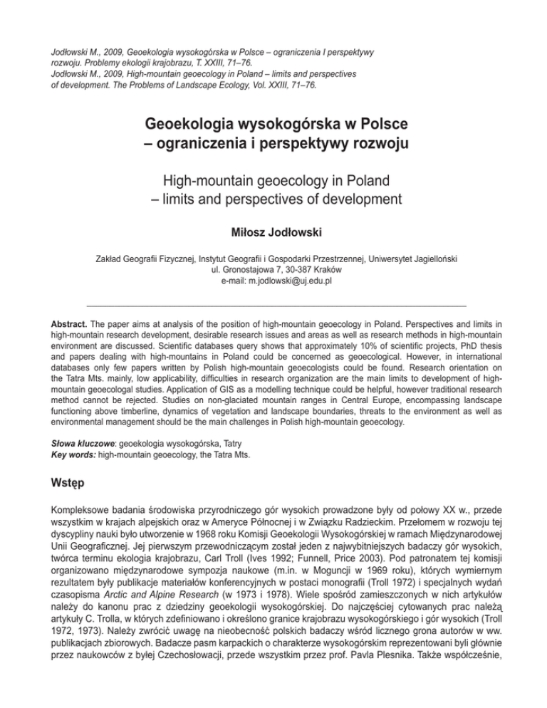 Jodłowski M., 2009, Geoekologia wysokogórska w Polsce – ograniczenia I perspektywy rozwoju. Problemy ekologii krajobrazu, T. XXIII, 71–76. Jodłowski M., 2009, High-mountain geoecology in Poland – limits and perspectives of development. The Problems of Landscape Ecology, Vol. XXIII, 71–76. Geoekologia wysokogórska w Polsce – ograniczenia i perspektywy rozwoju High-mountain geoecology in Poland – limits and perspectives of development Miłosz Jodłowski Zakład Geografii Fizycznej, Instytut Geografii i Gospodarki Przestrzennej, Uniwersytet Jagielloński ul. Gronostajowa 7, 30-387 Kraków e-mail: [email protected] __________________________________________________________________________________ Abstract. The paper aims at analysis of the position of high-mountain geoecology in Poland. Perspectives and limits in high-mountain research development, desirable research issues and areas as well as research methods in high-mountain environment are discussed. Scientific databases query shows that approximately 10% of scientific projects, PhD thesis and papers dealing with high-mountains in Poland could be concerned as geoecological. However, in international databases only few papers written by Polish high-mountain geoecologists could be found. Research orientation on the Tatra Mts. mainly, low applicability, difficulties in research organization are the main limits to development of highmountain geoecologal studies. Application of GIS as a modelling technique could be helpful, however traditional research method cannot be rejected. Studies on non-glaciated mountain ranges in Central Europe, encompassing landscape functioning above timberline, dynamics of vegetation and landscape boundaries, threats to the environment as well as environmental management should be the main challenges in Polish high-mountain geoecology. Słowa kluczowe: geoekologia wysokogórska, Tatry Key words: high-mountain geoecology, the Tatra Mts. Wstęp Kompleksowe badania środowiska przyrodniczego gór wysokich prowadzone były od połowy XX w., przede wszystkim w krajach alpejskich oraz w Ameryce Północnej i w Związku Radzieckim. Przełomem w rozwoju tej dyscypliny nauki było utworzenie w 1968 roku Komisji Geoekologii Wysokogórskiej w ramach Międzynarodowej Unii Geograficznej. Jej pierwszym przewodniczącym został jeden z najwybitniejszych badaczy gór wysokich, twórca terminu ekologia krajobrazu, Carl Troll (Ives 1992; Funnell, Price 2003). Pod patronatem tej komisji organizowano międzynarodowe sympozja naukowe (m.in. w Moguncji w 1969 roku), których wymiernym rezultatem były publikacje materiałów konferencyjnych w postaci monografii (Troll 1972) i specjalnych wydań czasopisma Arctic and Alpine Research (w 1973 i 1978). Wiele spośród zamieszczonych w nich artykułów należy do kanonu prac z dziedziny geoekologii wysokogórskiej. Do najczęściej cytowanych prac należą artykuły C. Trolla, w których zdefiniowano i określono granice krajobrazu wysokogórskiego i gór wysokich (Troll 1972, 1973). Należy zwrócić uwagę na nieobecność polskich badaczy wśród licznego grona autorów w ww. publikacjach zbiorowych. Badacze pasm karpackich o charakterze wysokogórskim reprezentowani byli głównie przez naukowców z byłej Czechosłowacji, przede wszystkim przez prof. Pavla Plesnika. Także współcześnie, Jodłowski M. na międzynarodowych konferencjach naukowych z zakresu badań środowiska przyrodniczego gór, w tym gór wysokich, udział naukowców z Polski jest znikomy. Przedmiotem badań geoekologii wysokogórskiej są góry wysokie (high mountains, Hochgebirge), definiowane jako góry osiągające takie wysokości, które zapewniają występowanie form i pokrycia terenu, procesy glebowe oraz charakter krajobrazu, jaki w klasycznym regionie geografii gór, w Alpach, postrzegany jest generalnie jako wysokoalpejski (Troll 1972). Z kolei krajobraz wysokogórski określany jest jako najwyżej położony pas w systemach górskich, odznaczający się szczególnymi cechami. Dolną granicę tego pasa wyznaczają: górna granica lasu, dolna granica denudacji krioniwalnej oraz dolna granica występowania kompleksu rzeźby wysokogórskiej, utożsamiana z plejstoceńską granicą wiecznego śniegu (por. Troll 1973). Spośród pasm górskich leżących w Polsce, za góry wysokie powszechnie uznawane są Tatry (por. Plesnik 1972, 1973; Kotarba 1976), natomiast pewne wątpliwości dotyczą Karkonoszy i masywu Babiej Góry w Beskidzie Żywieckim. Pasma te zazwyczaj uznawane są za góry średnie (por. Kotarba 1976), chociaż J. Kondracki (1991) najwyższe partie masywu Babiej Góry uznaje za jedyne miejsce w Beskidach Zachodnich z krajobrazem wysokogórskim. Również w Karkonoszach występują obszary, których cechy środowiska można określić jako wysokogórskie (por. Jodłowski 2007). Celem niniejszej pracy jest próba odpowiedzi na pytania dotyczące stanu geoekologii wysokogórskiej w Polsce, barier i perspektyw w rozwoju badań wysokogórskich, pożądanych kierunków badań, a także obszarów, w których takie badania są możliwe; jak również prezentacja metod badawczych stosowanych w górach wysokich wraz z analizą ich ograniczeń i możliwości. Stan geoekologii wysokogórskiej w Polsce Do głównych ośrodków naukowych w Polsce, zajmujących się badaniami wysokogórskimi, należą Instytut Geografii i Przestrzennego Zagospodarowania Polskiej Akademii Nauk (a zwłaszcza Zakład Geomorfologii i Hydrologii Gór i Wyżyn z siedzibą w Krakowie) oraz uniwersytety: Jagielloński (Wydział Biologii i Nauk o Ziemi), Warszawski (Wydział Geografii i Studiów Regionalnych) i Śląski (Wydział Nauk o Ziemi). Pojedyncze badania prowadzone są także w Akademii Rolniczej (od 2008 r. Uniwersytet Rolniczy) w Krakowie (Wydział Leśny) i w Uniwersytecie Adama Mickiewicza w Poznaniu. Zdecydowana większość tematów badawczych dotyczących gór wysokich realizowana jest przez przedstawicieli