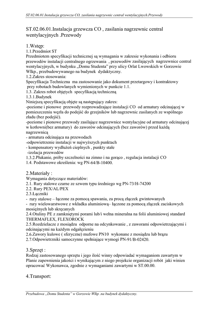 ST.02.06.01.Instalacja grzewcza CO, zasilania nagrzewnic central wentylacyjnych.Przewody ST.02.06.01.Instalacja grzewcza CO , zasilania nagrzewnic central wentylacyjnych .Przewody :VW S 1.1.Przedmiot ST 3U]HGPLRWHPVSHF\ILNDFMLWHFKQLF]QHMVZ\PDJDQLDZ]DNUHVLHZ\NRQDQLDLRGELRUX przewodów instalacji centralnego ogrzewania , przewoGyZ]DVLODMF\FKQDJU]HZQLFHFHQWUDO wentylacyjnych, w budynku „Domu Studenta” przy ulicy Orlat Lwowskich w Gorzowie Wlkp., przebudowywanego na budynek dydaktyczny. 1.2.Zakres stosowania: Specyfikacja Techniczna ma zastosowanie jako dokument przetargowy i kontraktowy przy robotach budowlanych wymienionych w punkcie 1.1. =DNUHVURERWREM W\FKVSHF\ILNDFMWHFKQLF]Q 1.3.1.Budynek 1LQLHMV]VSHF\ILNDFMREM WHVQDVW SXMF\]DNUHV -SR]LRPHLSLRQRZHSU]HZRG\UR]SURZDG]DMFHLQVWDODFML&2RdDUPDWXU\RGFLQDMFHMZ SRPLHV]F]HQLXZ ]áDGRSRGHMüGRJU]HMQLNyZOXEQDJU]HZQLF]DVLODQ\FK]HZVSyOQHJR ]áDGXEH]SRGHMü -SR]LRPHLSLRQRZHSU]HZRG\]DVLODMFHQDJU]HZQLFHZHQW\ODF\MQHRGDUPDWXU\RGFLQDMFHM ZNRWáRZQLEH]DUPDWXU\GR]DZRUyZRGFLQDMF\FKEH]]DZRUyZSU]HGND*G QDJU]HZQLF -DUPDWXUDRGFLQDMFDQDSU]HZRGDFK -RGSRZLHWU]HQLHLQVWDODFMLZQDMZ\*V]\FKSXQNWDFK -NRPSHQVDWRU\Z\GáX*HFLHSOQ\FKSXQNW\VWDáH -izolacja przewodów 1.3.23áXNDQLHSUyE\V]F]HOQRFLQD]LPQRLQDJRUFRUHJXODFMDLQVWDODFML&2 3RGVWDZRZHRNUHOHQLDZJ31-64/B-10400. 0DWHULDá\ :\PDJDQLDGRW\F]FHPDWHULDáyZ 2.1. Rury VWDORZHF]DUQH]HV]ZHPW\SXUHGQLHJRZJ31-73/H-74200 2.2. Rury PEX/AL/PEX àF]QLNL - rury stalowe –áF]RQH]DSRPRFVSDZDQLD]DSURF]áF]HNJZLQWRZDQ\FK -UXU\ZLHORZDUVWZRZH]ZNáDGNDDOXPLQLRZ–áF]RQH]DSRPRF]áF]HN]DFLVNRZ\FK PRVL *Q\FKOXEVNU FDQ\FK 2WXOLQ\3(]]DPNQL W\PLSRUDPLOXELZHáQDPLQHUDOQDQDIROLLDOXPLQLRZHMVWDQGDUG THERMAFLEX, FLEXOROCK 5R]G]LHODF]H]PRVLG]XRGSRUQHQDRGF\QNRZDQLH]]DZRUDPLRGSRZLHWU]DMF\PLL RGFLQDMF\PLQDND*G\PRGJDá ]LHQLX 2.6=DZRU\NXORZHVIHU\F]QHPXIRZH31Z\NRQDQH]PRVLG]XOXEEU]X 2.72GSRZLHWU]QLNLVDPRF]\QQHVSHáQLDMFHZ\PRJL31-91/B-02420. 6SU] W 5RG]DM]DVWRVRZDQHJRVSU] WXLMHJRLORüZLQQ\RGSRZLDGDüZ\PDJDQLRP]DZDUW\PZ 3ODQLH]DSHZQLHQLDMDNRFLLZ\QLNDMF\P]QLHJRSURMHNFLHRUJDQL]DFMLUREyWMDNLZLQLHQ RSUDFRZDü:\NRQDZFD]JRGQLH]Z\PDJDQLDPLzawartymi w ST.00.00. 4.Transport: Przebudowa „Domu Studenta” w Gorzowie Wlkp .na budynek dydaktyczny. ST.02.06.01.Instalacja grzewcza CO, zasilania nagrzewnic central wentylacyjnych.Przewody URGNLWUDQVSRUWRZHSRZLQQ\RGSRZLDGDüSRGZ]JO GHPW\SyZLLORFLZ\PDJDQLRP ]DZDUW\PZ3ODQLH]DSHZQLHQLDMDNRFLLZ\QLNDMF\P]QLHJRSURMHNFLHRUJDQL]DFMLUREyW MDNLZLQLHQRSUDFRZDü:\NRQDZFD]JRGQLH]Z\PDJDQLDPi zawartymi w ST.00.00. 5. Wykonanie robót: Wymagania i zasady wykonywania robót: 3U]HZRG\Z\NRQ\ZDü]UXUPLHG]LDQ\FKáF]RQ\FKSRSU]H]OXWRZDQLHNDSLODUQHOXWHP PL NNLP3RáF]HQLD]DUPDWXURGFLQDMFDZ\NRQ\ZDü]DSRPRFSRáF]HJZLQWRZDQ\FK przy pRPRF\áF]QLNyZPRVL *Q\FK]DFLVNRZ\FK 3U]HZRG\SURZDG]LüZ]GáX*FLDQZEUX]GDFKFLHQQ\FKLZSU]HVWU]HQLZDUVWZ SRVDG]NRZ\FKVWURSyZ]JRGQLH]GRNXPHQWDFMSURMHNWRZ 3U]HZRG\L]RORZDüRWXOLQDPL3(OXEL]RODFMDPL]ZHáQ\PLQHUDOQHMQDIROLLDOXPLQLRZHM :\GáX*HQLDFLHSOQHNRPSHQVRZDü]DSRPRFNRPSHQVDWRUyZRUD]WDPJG]LHMHVWWR PR*OLZHZ\NRU]\VWDüNRPSHQVDFM QDWXUDOQXNáDGyZJHRPHWU\F]Q\FKWUDV\prowadzonych przewodów. 3RPL G]\NRPSHQVDWRUDPLZ\NRQDüSXQNW\VWDáHQDSU]HZRGDFK 3U]HMFLDSU]H]FLDQ\LVWURS\Z\NRQ\ZDüZWXOHMDFKVWDORZ\FK 0RFRZDQLHSU]HZRGyZGRFLDQLVWURSyZZ\NRQ\ZDü]DSRPRFW\SRZ\FKXFKZ\WyZGR rur miedzianych. 3UyE\V]F]HOQRFLSUyE\QDJRUFRZ\NRQ\ZDüZJZ\PRJyZ]DZDUW\FKZ31-64/B-10400. .RQWURODMDNRFLUREyW .RQWURODMDNRFLUREyWE G]LHSU]HELHJDáD]JRGQLH]3URJUDPHP=DSHZQLHQLD-DNRFL RSUDFRZDQ\PSU]H]:\NRQDZF Z\PDJDQLDPLRJyOQ\PL]DZDUW\PLZ67Rraz SU]\ZRáDQ\PLZQLQLHMV]HMVSHF\ILNDFMLQRUPDPL 7.Obmiar robót: -HGQRVWNREPLDURZMHVWPEZ\NRQDQHJRSU]HZRGXPLHU]RQHJRZUD]]áF]QLNDPL DUPDWXULNRPSHQVDWRUDPL 2EPLDUE G]LHGRNXPHQWRZDQ\ZJ]DVDGSRGDQ\FKZ67 8.Odbiór robot: OdELRURZLE GSRGOHJDá\QDVW SXMFHURERW\ -SáXNDQLHLQVWDODFML -SUyE\V]F]HOQRFLSUyEDQDJRUFRZJZ\PRJyZ31-64/B-10400. -izolacja cieplna wg wymogów PN-85/B-02421 . -JUXERüL]RODFMLZPLHMVFDFKZ\GáX*HFLHSOQ\FKSU]HZRGyZSU]HGLFK]DEHWRQRZDQLHm w warstwach posadzkowych 2GELRU\E GGRNXPHQWRZDQHZJ]DVDGSRGDQ\FKZ67 3RGVWDZDSáDWQRFL -HGQRVWNSáDWQRFLMHVWPEZ\NRQDQHJRSU]HZRGX 3RGVWDZSáDWQRFL]DPEZ\NRQDQHJRSU]HZRG\MHVWZ\NRQDQLHZV]\VWNLFKURERW VNáDGDMF\FKVL QDMHGQRVWN SU]HGPLDURZ 1DMHGQRVWN SU]HGPLDURZPEVNáDGDMVL QDVW SXMFHURERW\ -GRZy]PDWHULDáyZQDPLHMVFHZEXGRZDQLD -Z\NRQDQLHSU]HZLHUWyZSU]H]FLDQ\LVWURS\Z\NRQDQLHEUX]GZFLDQDFKLVWURSDFK -RVDG]HQLHZFLDQDFKLVWURSDFKVWDORZ\FKWXOHLSU]HMFLRZ\FK -Z\Zy]JUX]XQDPLHMVNLHZ\V\SLVNRPLHFL Przebudowa „Domu Studenta” w Gorzowie Wlkp .na budynek dydaktyczny. ST.02.06.01.Instalacja grzewcza CO, zasilania nagrzewnic central wentylacyjnych.Przewody -WUDVRZDQLHLPRQWD*SU]HZRGyZOXWRZDQLHNDSLODUQHOXWHPPL NNLP -PRQWD*]DZRUyZRGFLQDMcych , kompensatorówZ\NRQDQLHSXQNWyZVWDá\FKPRQWD* samoczynnych odpowietrzników - próEDV]F]HOQRFLQD]LPQRLQDJRUFR - izolacja przewodów otulinami PE -]DPXURZDQLHEUX]GZFLDQDFKLVWURSDFK 3áDWQRüE G]LHGRNRQDQDQDSRGVWDZLHZDUXQNyZ]DZDUW\FKZ67SRGRNRQDQLX odbioru technicznego wykonanych robót wg niniejszej specyfikacji. 3U]HSLV\]ZL]DQH 10.1.PN-64/B-8U]G]HQLHFHQWUDOQHJRRJU]HZDQLDZEXGRZQLFWZLHSRZV]HFKQ\P Wymagania i badania przy odbiorze 10.2.PN-91/B-2JU]HZQLFWZR2GSRZLHWU]DQLHLQVWDODFMLRJU]HZDZRGQ\FK 10.3.PN-85/B-02421.Izolacja ciepOQDUXURFLJyZDUPDWXU\LXU]G]H:\PDJDQLDLEDGDQLD Przebudowa „Domu Studenta” w Gorzowie Wlkp .na budynek dydaktyczny.