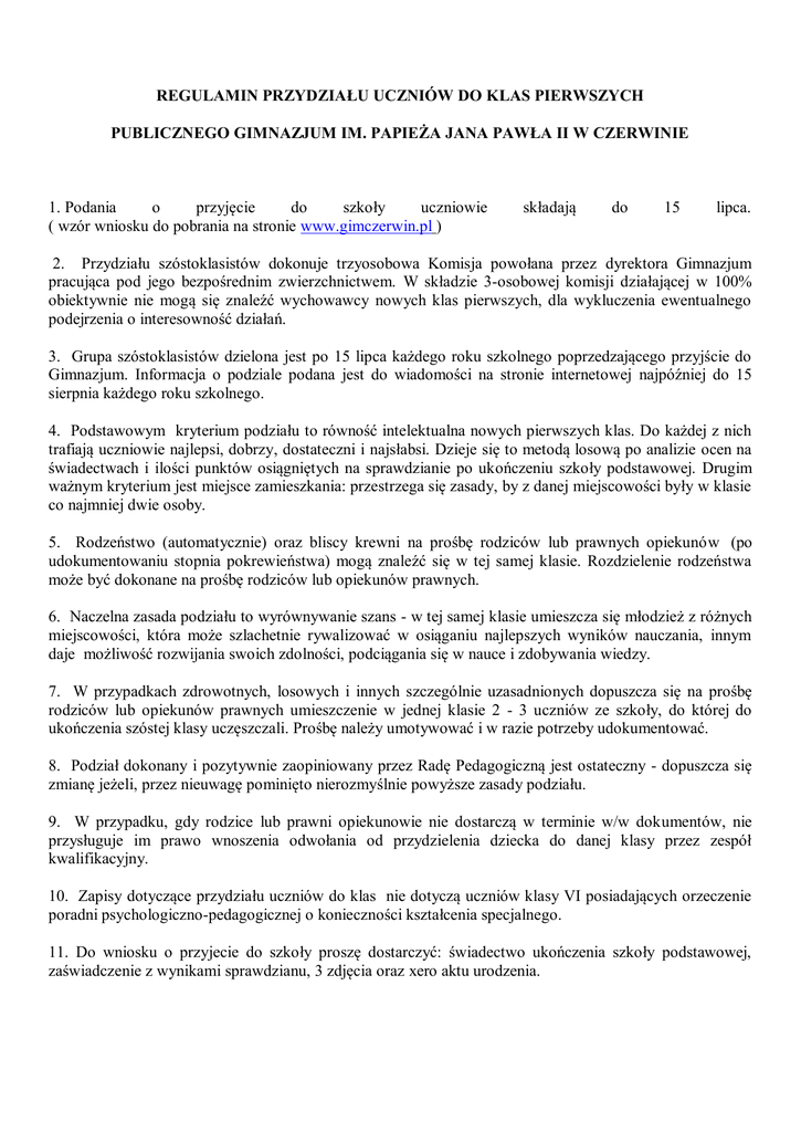 REGULAMIN PRZYDZIAŁU UCZNIÓW DO KLAS PIERWSZYCH PUBLICZNEGO GIMNAZJUM IM. PAPIEŻA JANA PAWŁA II W CZERWINIE 1. Podania o przyjęcie do szkoły uczniowie ( wzór wniosku do pobrania na stronie www.gimczerwin.pl ) składają do 15 lipca. 2. Przydziału szóstoklasistów dokonuje trzyosobowa Komisja powołana przez dyrektora Gimnazjum pracująca pod jego bezpośrednim zwierzchnictwem. W składzie 3-osobowej komisji działającej w 100% obiektywnie nie mogą się znaleźć wychowawcy nowych klas pierwszych, dla wykluczenia ewentualnego podejrzenia o interesowność działań. 3. Grupa szóstoklasistów dzielona jest po 15 lipca każdego roku szkolnego poprzedzającego przyjście do Gimnazjum. Informacja o podziale podana jest do wiadomości na stronie internetowej najpóźniej do 15 sierpnia każdego roku szkolnego. 4. Podstawowym kryterium podziału to równość intelektualna nowych pierwszych klas. Do każdej z nich trafiają uczniowie najlepsi, dobrzy, dostateczni i najsłabsi. Dzieje się to metodą losową po analizie ocen na świadectwach i ilości punktów osiągniętych na sprawdzianie po ukończeniu szkoły podstawowej. Drugim ważnym kryterium jest miejsce zamieszkania: przestrzega się zasady, by z danej miejscowości były w klasie co najmniej dwie osoby. 5. Rodzeństwo (automatycznie) oraz bliscy krewni na prośbę rodziców lub prawnych opiekunów (po udokumentowaniu stopnia pokrewieństwa) mogą znaleźć się w tej samej klasie. Rozdzielenie rodzeństwa może być dokonane na prośbę rodziców lub opiekunów prawnych. 6. Naczelna zasada podziału to wyrównywanie szans - w tej samej klasie umieszcza się młodzież z różnych miejscowości, która może szlachetnie rywalizować w osiąganiu najlepszych wyników nauczania, innym daje możliwość rozwijania swoich zdolności, podciągania się w nauce i zdobywania wiedzy. 7. W przypadkach zdrowotnych, losowych i innych szczególnie uzasadnionych dopuszcza się na prośbę rodziców lub opiekunów prawnych umieszczenie w jednej klasie 2 - 3 uczniów ze szkoły, do której do ukończenia szóstej klasy uczęszczali. Prośbę należy umotywować i w razie potrzeby udokumentować. 8. Podział dokonany i pozytywnie zaopiniowany przez Radę Pedagogiczną jest ostateczny - dopuszcza się zmianę jeżeli, przez nieuwagę pominięto nierozmyślnie powyższe zasady podziału. 9. W przypadku, gdy rodzice lub prawni opiekunowie nie dostarczą w terminie w/w dokumentów, nie przysługuje im prawo wnoszenia odwołania od przydzielenia dziecka do danej klasy przez zespół kwalifikacyjny. 10. Zapisy dotyczące przydziału uczniów do klas nie dotyczą uczniów klasy VI posiadających orzeczenie poradni psychologiczno-pedagogicznej o konieczności kształcenia specjalnego. 11. Do wniosku o przyjecie do szkoły proszę dostarczyć: świadectwo ukończenia szkoły podstawowej, zaświadczenie z wynikami sprawdzianu, 3 zdjęcia oraz xero aktu urodzenia.