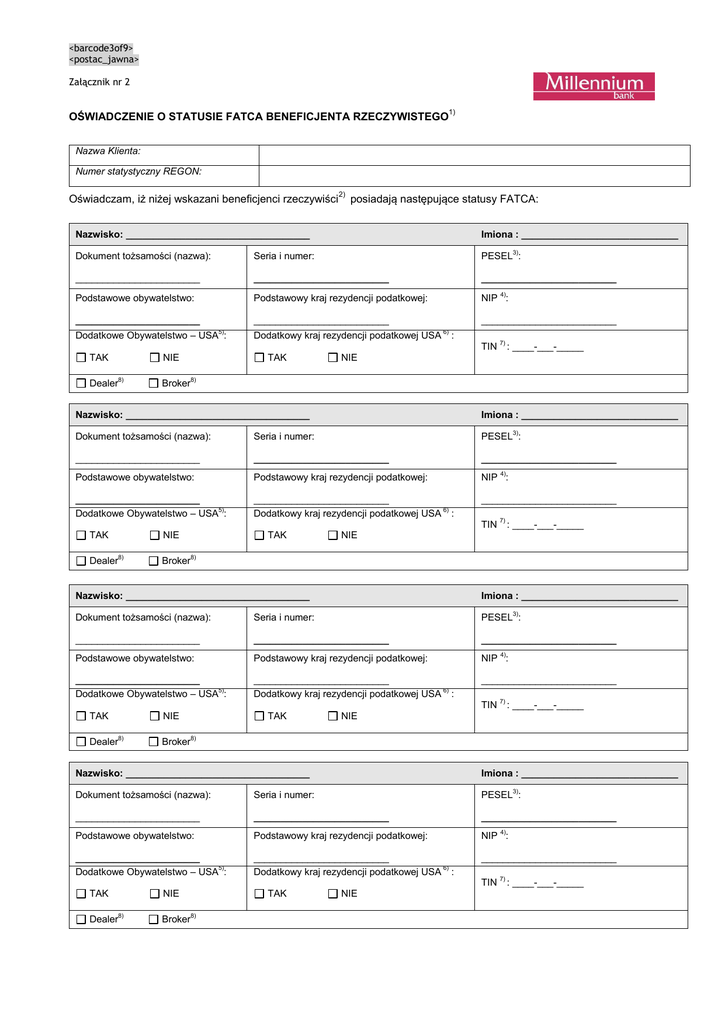 <barcode3of9> <postac_jawna> Załącznik nr 2 1) OŚWIADCZENIE O STATUSIE FATCA BENEFICJENTA RZECZYWISTEGO Nazwa Klienta: Numer statystyczny REGON: Oświadczam, iż niżej wskazani beneficjenci rzeczywiści 2) posiadają następujące statusy FATCA: Nazwisko: __________________________________ Imiona : _____________________________ Dokument tożsamości (nazwa): Seria i numer: PESEL3): _______________________ _________________________ _________________________ Podstawowe obywatelstwo: Podstawowy kraj rezydencji podatkowej: NIP 4): _______________________ _________________________ _________________________ Dodatkowe Obywatelstwo – USA5): Dodatkowy kraj rezydencji podatkowej USA 6) : TAK NIE Dealer8) Broker8) TAK TIN 7) : ____-___-_____ NIE Nazwisko: __________________________________ Imiona : _____________________________ Dokument tożsamości (nazwa): Seria i numer: PESEL3): _______________________ _________________________ _________________________ Podstawowe obywatelstwo: Podstawowy kraj rezydencji podatkowej: NIP 4): _______________________ Dodatkowe Obywatelstwo – USA5): _________________________ Dodatkowy kraj rezydencji podatkowej USA 6) : _________________________ TAK NIE Dealer8) Broker8) TAK TIN 7) : ____-___-_____ NIE Nazwisko: __________________________________ Imiona : _____________________________ Dokument tożsamości (nazwa): Seria i numer: PESEL3): _______________________ _________________________ _________________________ Podstawowe obywatelstwo: Podstawowy kraj rezydencji podatkowej: NIP 4): _______________________ Dodatkowe Obywatelstwo – USA5): _________________________ Dodatkowy kraj rezydencji podatkowej USA 6) : _________________________ TAK NIE Dealer8) Broker8) TAK TIN 7) : ____-___-_____ NIE Nazwisko: __________________________________ Imiona : _____________________________ Dokument tożsamości (nazwa): Seria i numer: PESEL3): _______________________ _________________________ _________________________ Podstawowe obywatelstwo: Podstawowy kraj rezydencji podatkowej: NIP 4): _______________________ Dodatkowe Obywatelstwo – USA5): _________________________ Dodatkowy kraj rezydencji podatkowej USA 6) : _________________________ TAK NIE Dealer8) Broker8) TAK NIE TIN 7) : ____-___-_____ Jestem świadomy odpowiedzialności karnej za złożenie fałszywego oświadczenia. Powyższe oświadczenie dotyczy informacji podanych przeze mnie w niniejszym dokumencie a wymaganych na podstawie ustawy z dnia 9 października 2015 r. o wykonywaniu Umowy między Rządem Rzeczypospolitej Polskiej a Rządem Stanów Zjednoczonych Ameryki w sprawie poprawy wypełniania międzynarodowych obowiązków podatkowych oraz wdrożenia ustawodawstwa FATCA. Zobowiązuję się do aktualizacji oświadczenia w zakresie mojego statusu podatnika USA w przypadku zmiany okoliczności powodujących, iż poprzednie oświadczenie straciło aktualność oraz możliwej konieczności dostarczenia dodatkowych dokumentów w celu weryfikacji wiarygodności tego oświadczenia. Bank Millennium S.A. z siedzibą w Warszawie, ul. Stanisława Żaryna 2A, 02-593 Warszawa („Bank”), informuje, że Pani/Pana dane osobowe będą przetwarzane przez Bank w celu należytego wykonania umów zawieranych z Bankiem i realizacji obowiązków Banku wynikających z ustawy z dnia 9 października 2015 r. o wykonywaniu Umowy między Rządem Rzeczypospolitej Polskiej a Rządem Stanów Zjednoczonych Ameryki w sprawie poprawy wypełniania międzynarodowych obowiązków podatkowych oraz wdrożenia ustawodawstwa FATCA. Przysługuje Pani/ Panu prawo dostępu do przetwarzanych danych osobowych i ich poprawiania, a także prawo żądania zaprzestania przetwarzania danych i wniesienia sprzeciwu na warunkach określonych prawem. Udostępnienie danych osobowych jest dobrowolne. _________________________________________________________________________________________________________________________________ Podpis Data 1) Bank Millennium S.A. jest zobowiązany do przekazania do administracji podatkowej USA (za pośrednictwem polskich organów podatkowych) danych dotyczących: • rezydentów amerykańskich* • osób, które odmówiły złożenia oświadczenia w zakresie statusu podatnika USA • osób, w przypadku których stwierdzono przesłanki świadczące o rezydencji podatkowej USA i które, na prośbę Banku Millennium S.A. nie dostarczyły dokumentów potwierdzających, że nie są rezydentami USA. Szczegóły dostępne na www.bankmillennium.pl 2) Beneficjent rzeczywisty - rozumie się przez to: a) osobę fizyczną lub osoby fizyczne, które są właścicielami osoby prawnej lub sprawują kontrolę nad klientem albo mają wpływ na osobę fizyczną, w imieniu której przeprowadzana jest transakcja lub prowadzona jest działalność, b) osobę fizyczną lub osoby fizyczne, które są udziałowcami lub akcjonariuszami lub posiadają prawo głosu na zgromadzeniu wspólników w wysokości powyżej 25% w tej osobie prawnej, w tym za pomocą pakietów akcji na okaziciela, z wyjątkiem spółek, których papiery wartościowe są w obrocie zorganizowanym, podlegających lub stosujących przepisy prawa Unii Europejskiej w zakresie ujawniania informacji, a także podmiotów świadczących usługi finansowe na terytorium państwa członkowskiego Unii Europejskiej albo państwa równoważnego - w przypadku osób prawnych, c) osobę fizyczną lub osoby fizyczne, które sprawują kontrolę nad co najmniej 25% majątku - w przypadku podmiotów, którym powierzono administrowanie wartościami majątkowymi oraz rozdzielanie takich wartości, z wyjątkiem podmiotów wykonujących czynności, o których mowa w art. 69 ust. 2 pkt 4 ustawy z dnia 29 lipca 2005 r. o obrocie instrumentami finansowymi; 3) w przypadku braku numeru PESEL prosimy podać datę urodzenia w formacie RRRR/MM/DD 4) w przypadku nierezydentów z innych krajów niż USA 5) wypełnić w przypadku, gdy podstawowo obywatelstwo nie jest obywatelstwem USA 6) wypełnić w przypadku, gdy 